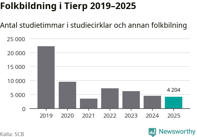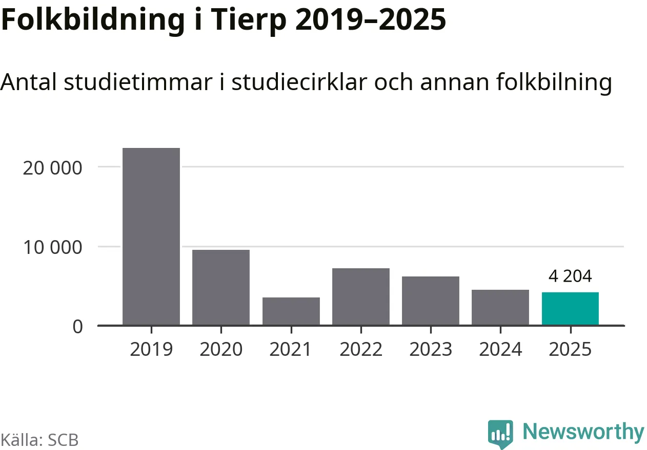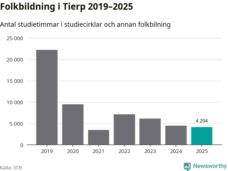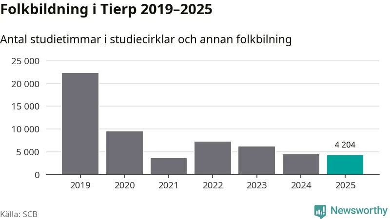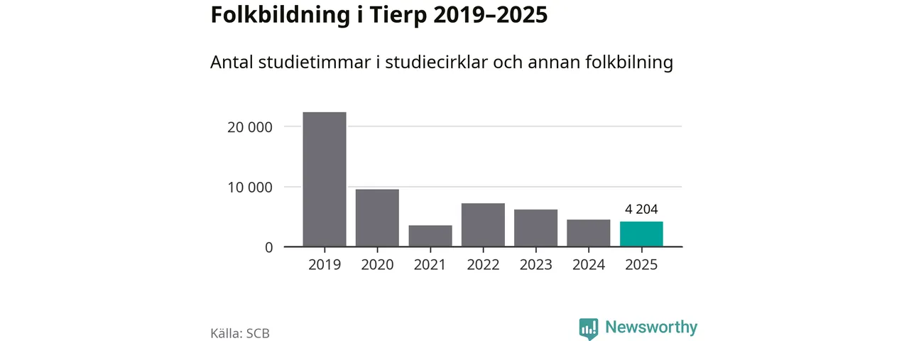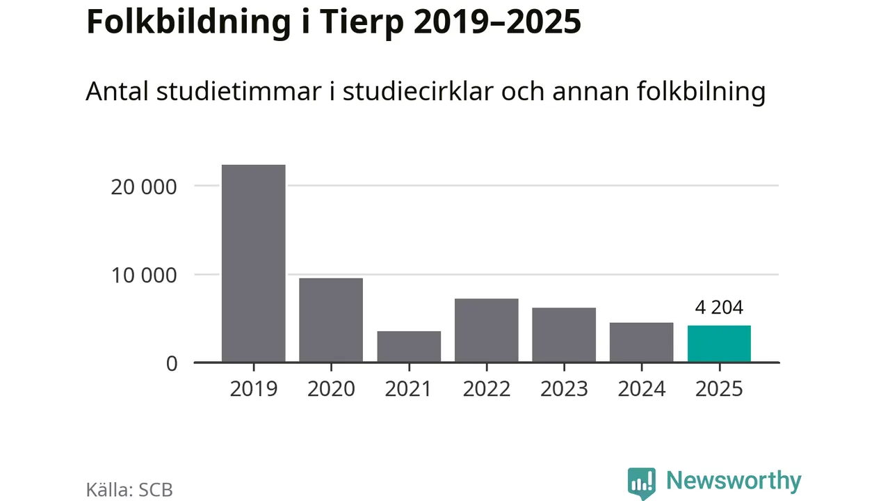 Studieförbunden drabbades hårt av pandemin. Även i Tierp noterades det lägsta antalet studietimmar under 2021, som då var 84 procent färre än 2019. År 2024 var antalet studietimmar åter högre men de var fortfarande långt från förpandeminivåerna.