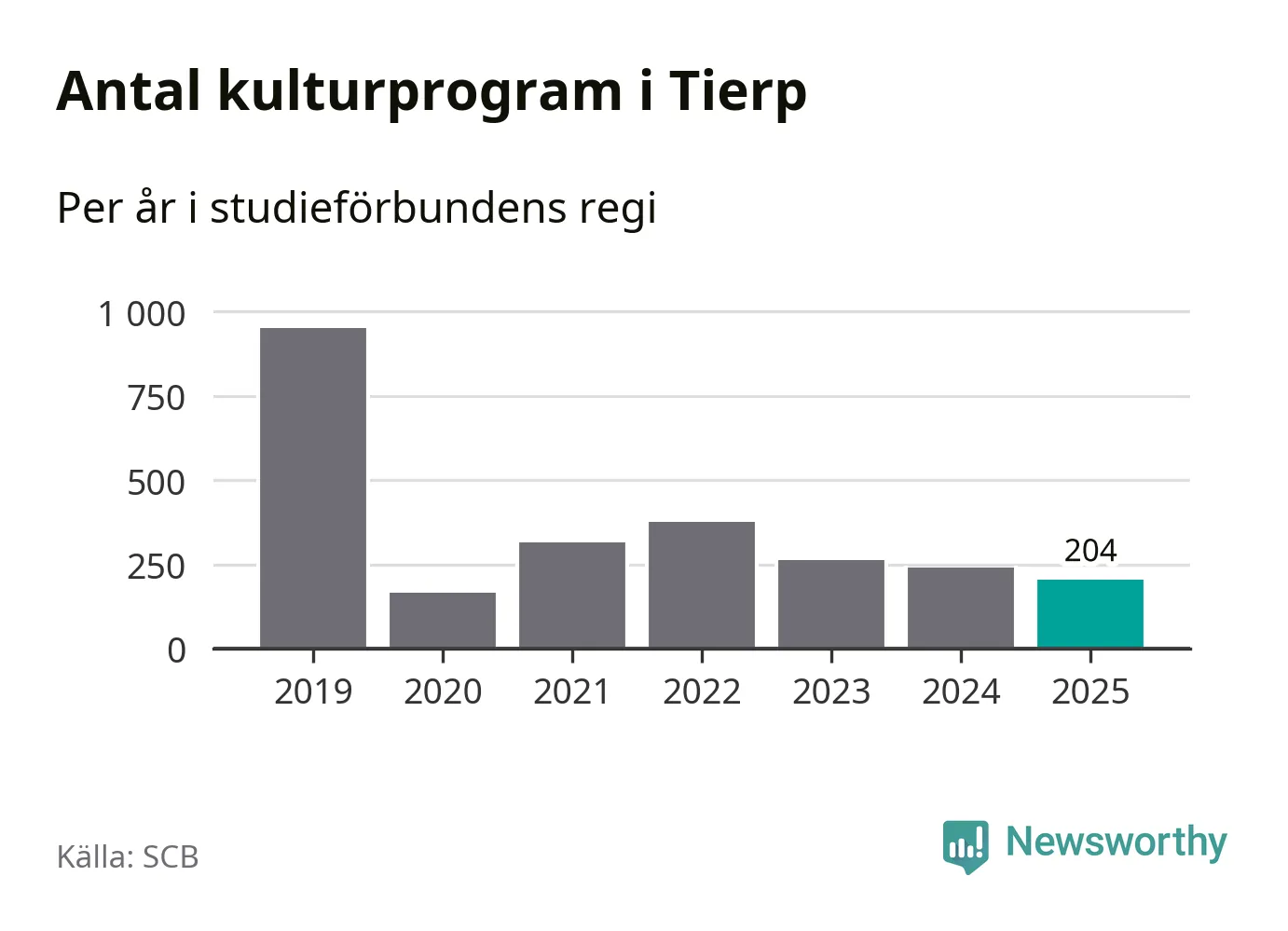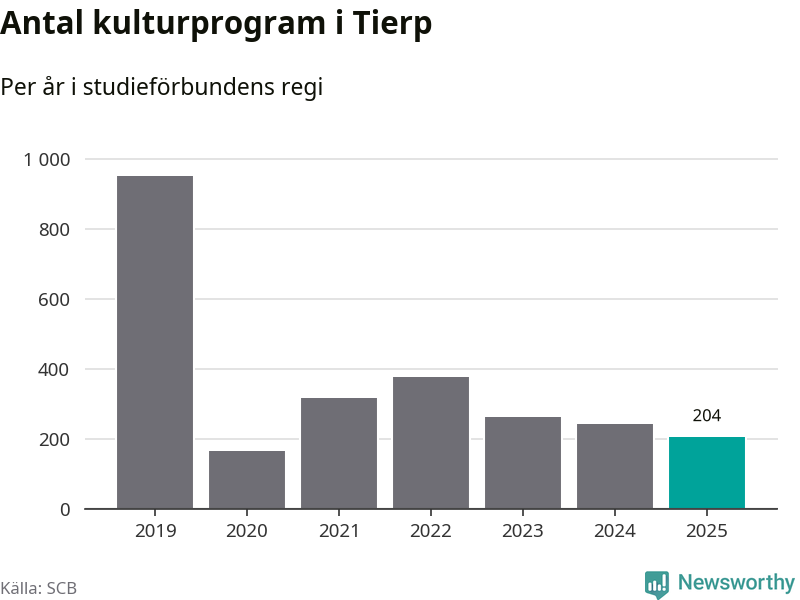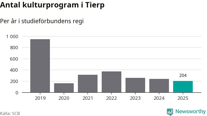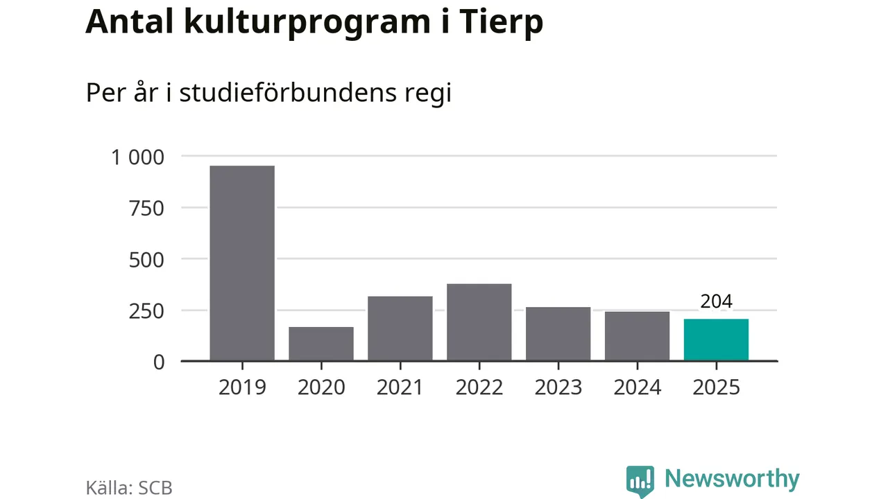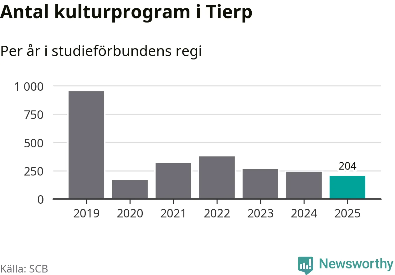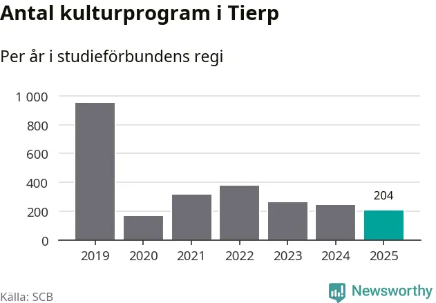 Minskningen är lika stor i Tierp. Förra året hade studieförbunden omkring 4 200 studietimmar i kommunen jämfört med omkring 4 500 året innan. Även antalet kulturprogram i studieförbundens regi minskade, från 241 till 204 stycken.