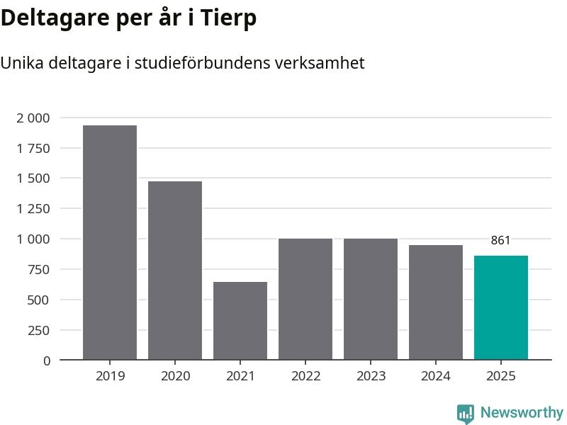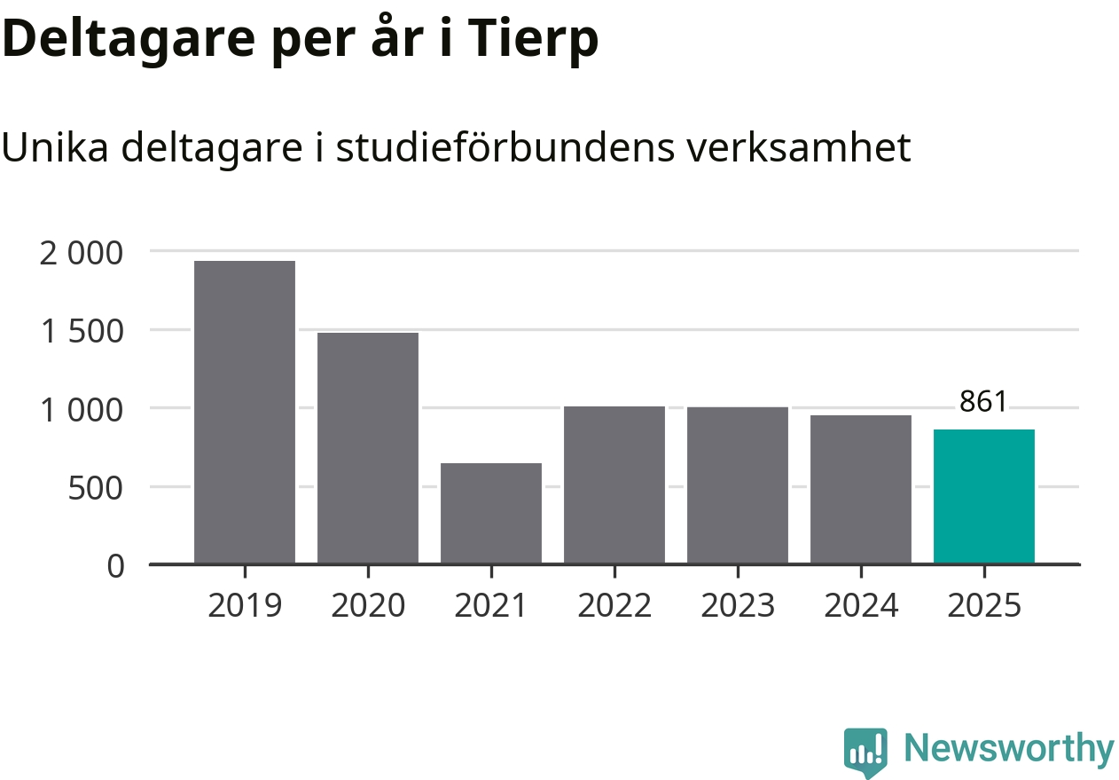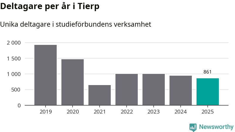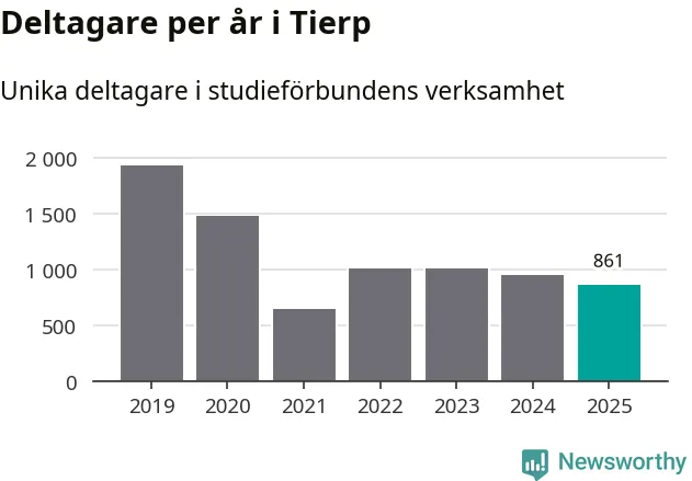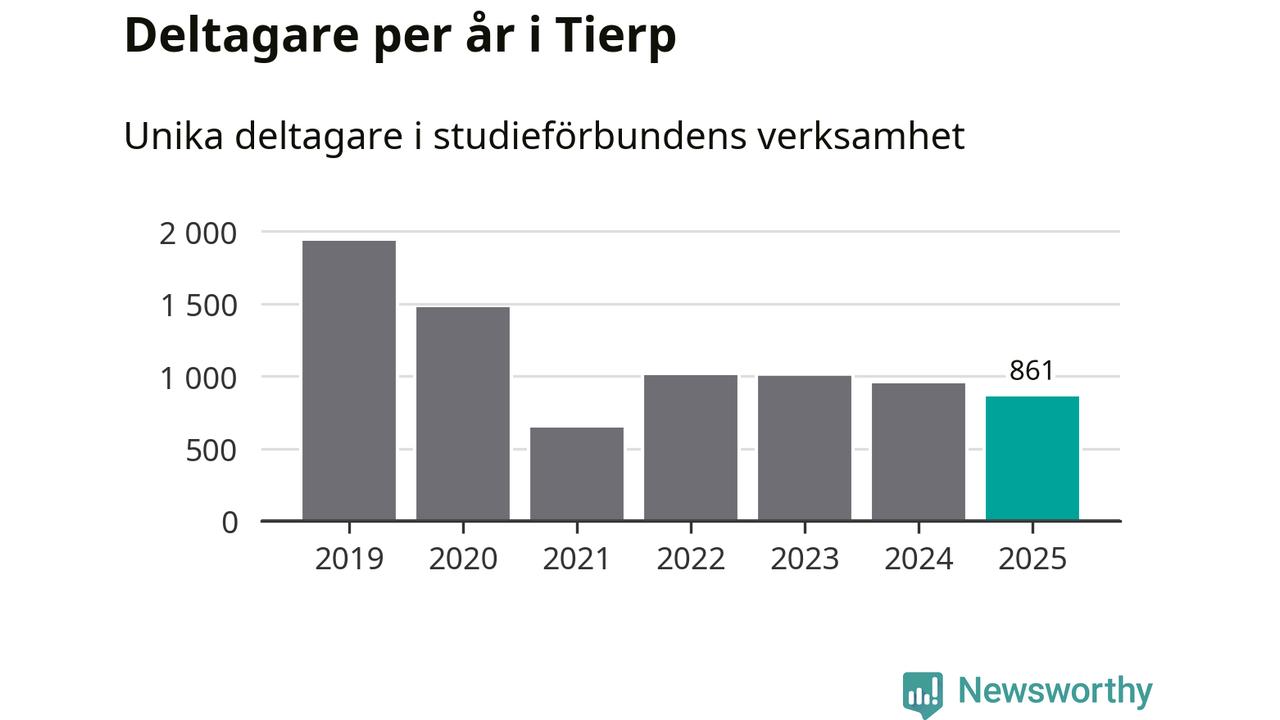 Även sett till unika deltagare är folkbildningen på tillbakagång i Tierp. 2025 deltog 861 personer i studieförbundens verksamhet, vilket är en minskning med nio procent jämfört med året innan. Det innebär att fyra procent av befolkningen i kommunen deltog i studieförbundens verksamhet under 2025, vilket är ungefär som rikssnittet.