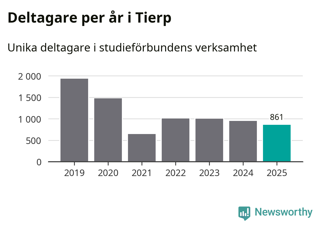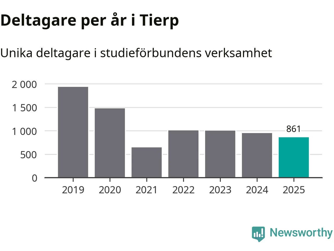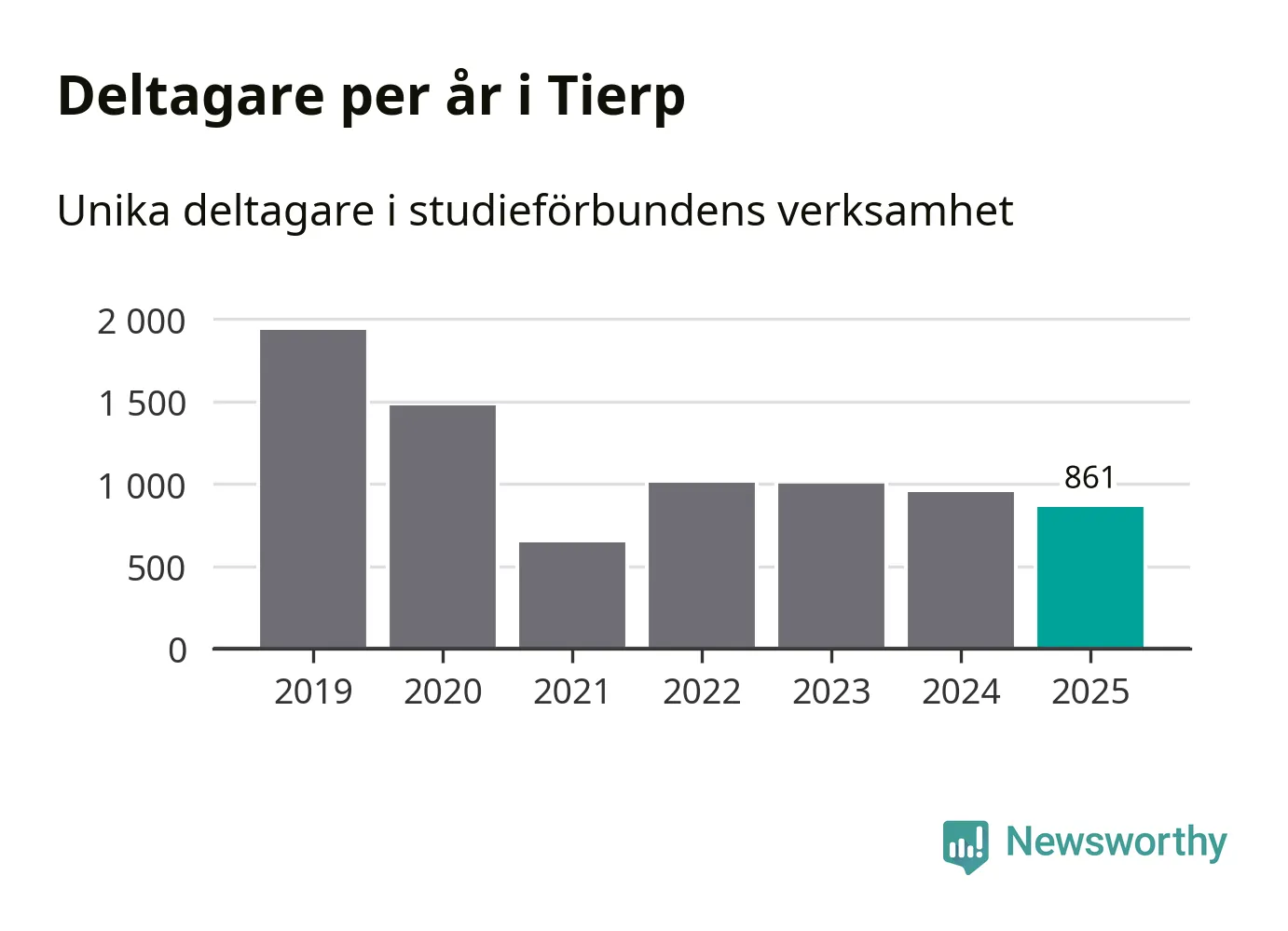 Även sett till unika deltagare är folkbildningen på tillbakagång i Tierp. 2025 deltog 861 personer i studieförbundens verksamhet, vilket är en minskning med nio procent jämfört med året innan. Det innebär att fyra procent av befolkningen i kommunen deltog i studieförbundens verksamhet under 2025, vilket är ungefär som rikssnittet.