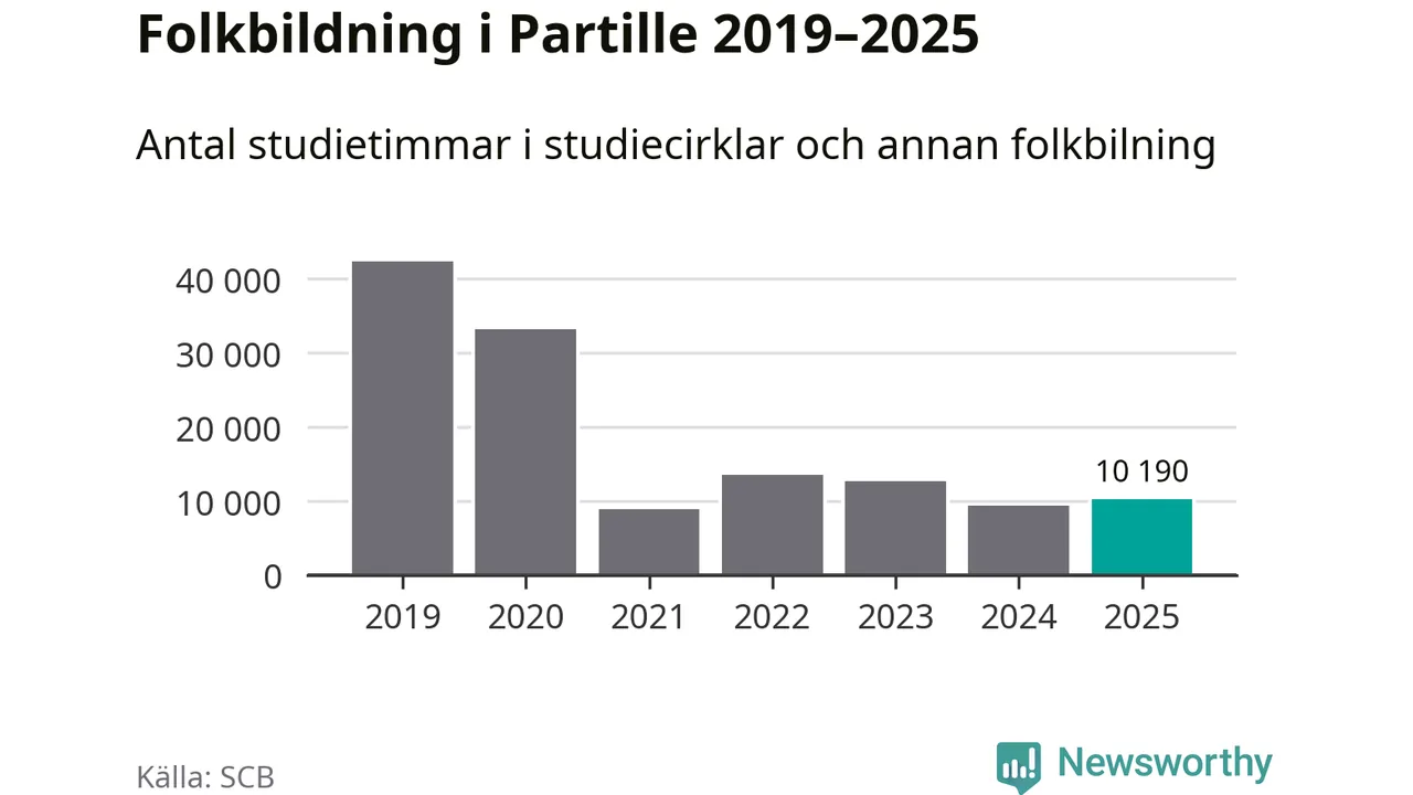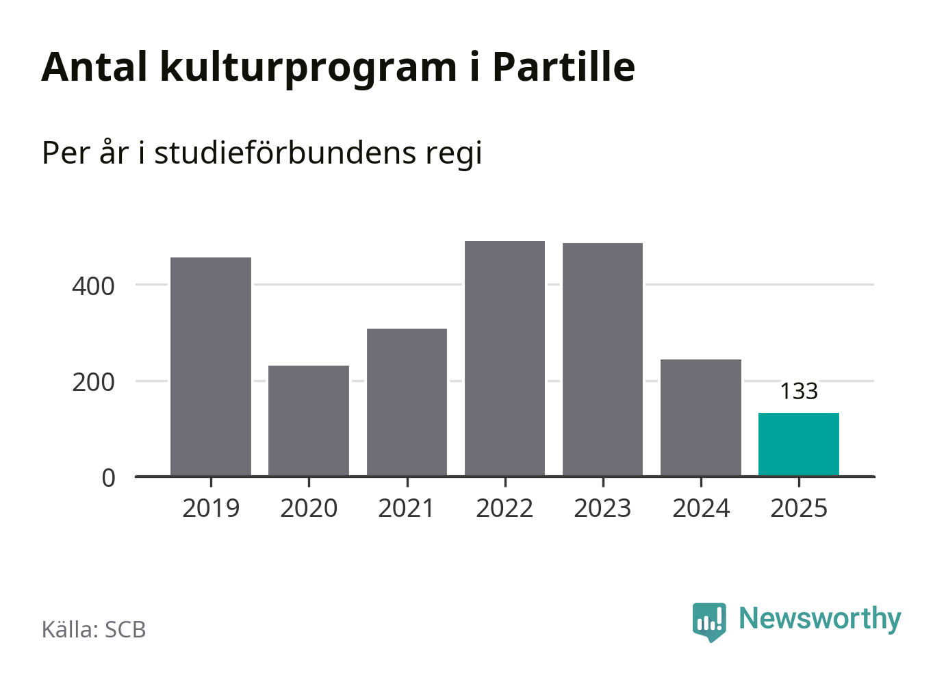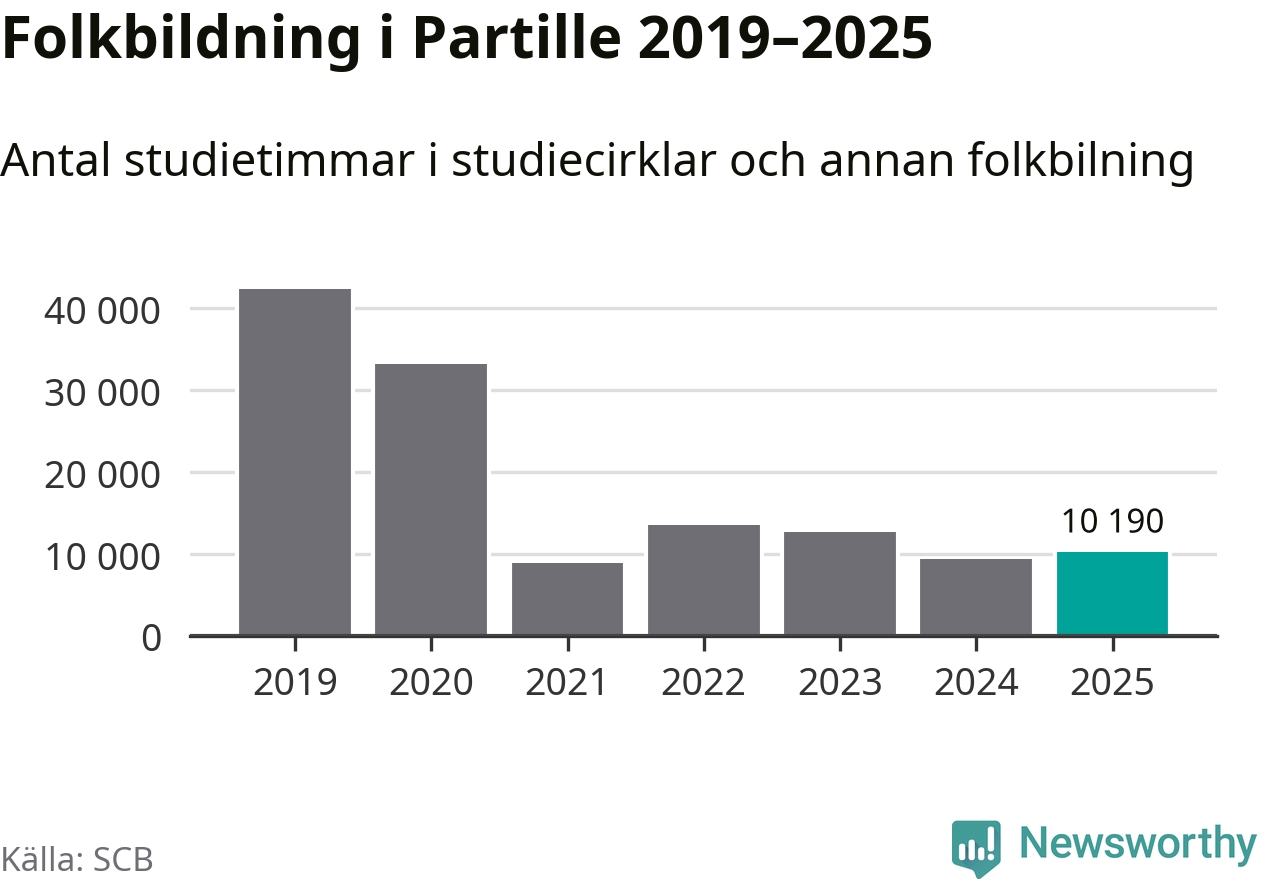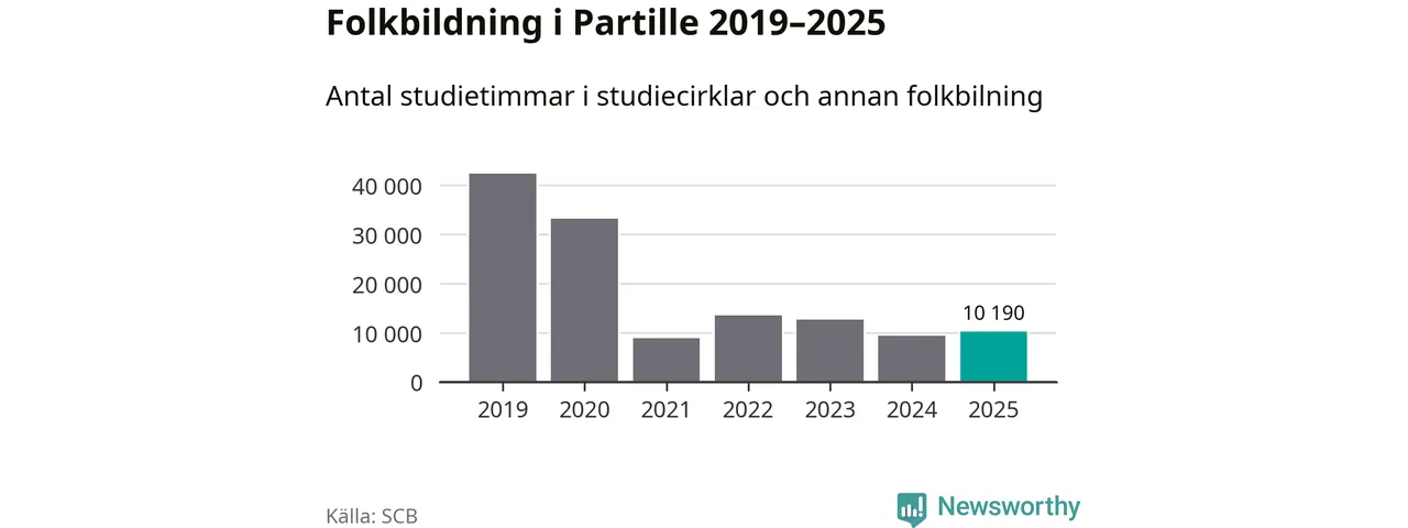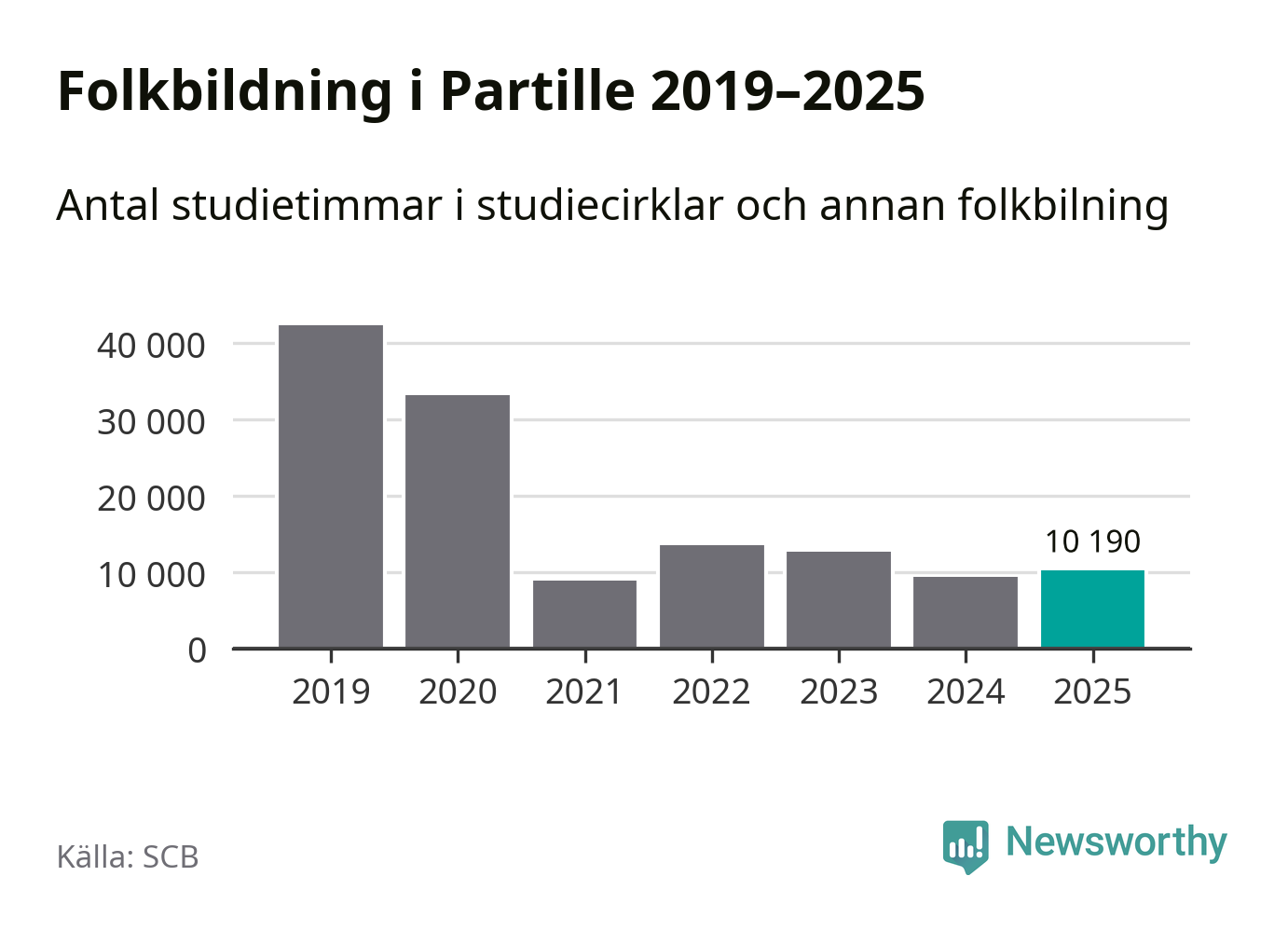 Men Partille är en av 80 kommuner i landet där antalet studietimmar faktiskt ökade under under fjolåret. Omkring 10 200 studietimmar innebär en ökning med 9 procent jämfört med året innan. Däremot minskade antalet kulturarrangemang i studieförbundens regi i kommunen jämfört med året innan.