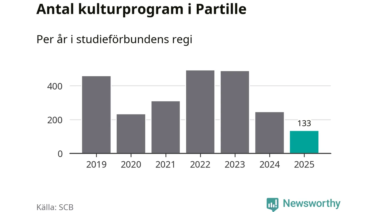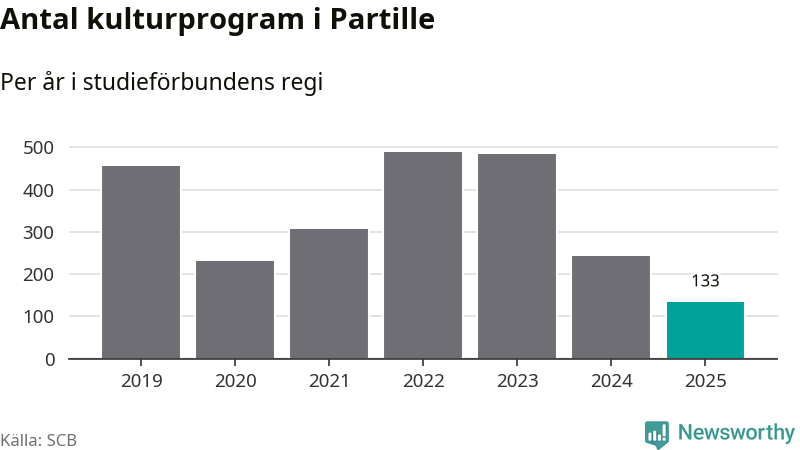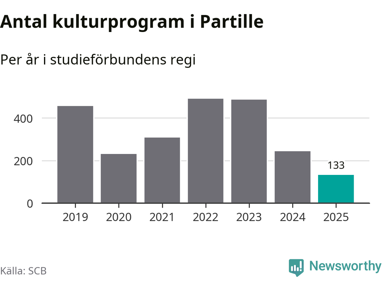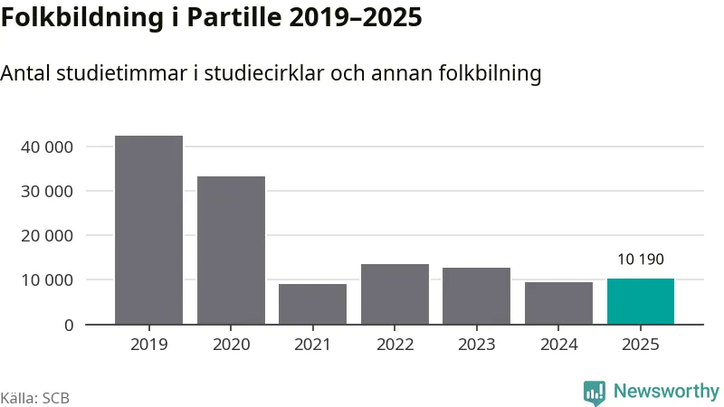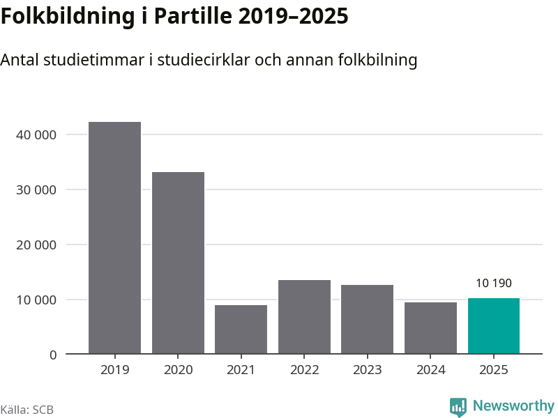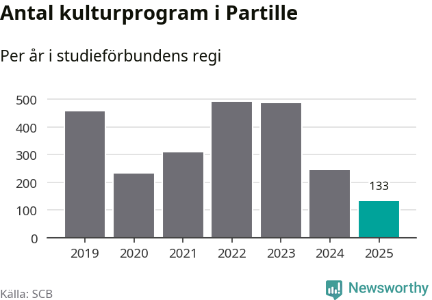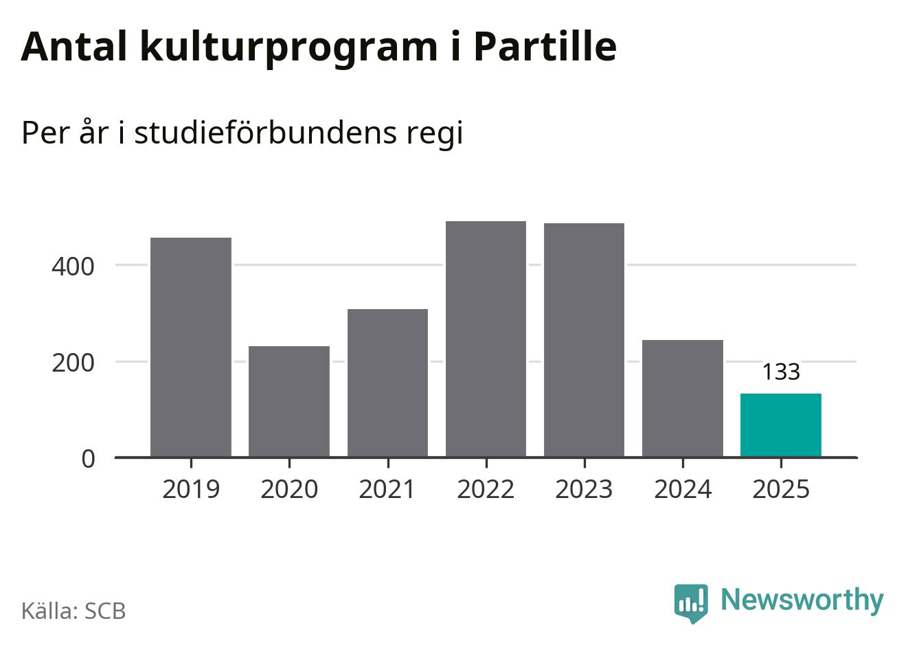 Men Partille är en av 80 kommuner i landet där antalet studietimmar faktiskt ökade under under fjolåret. Omkring 10 200 studietimmar innebär en ökning med 9 procent jämfört med året innan. Däremot minskade antalet kulturarrangemang i studieförbundens regi i kommunen jämfört med året innan.