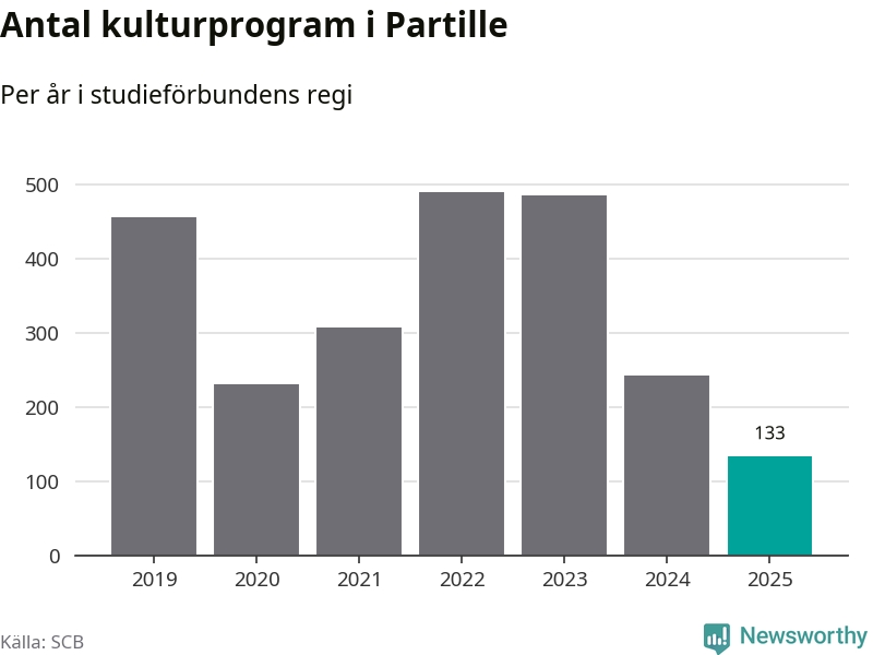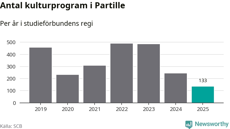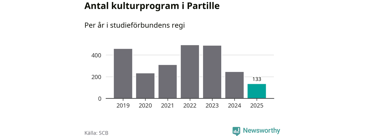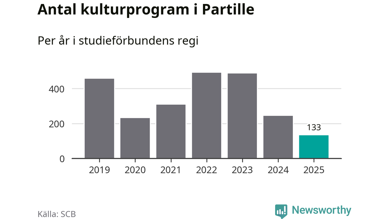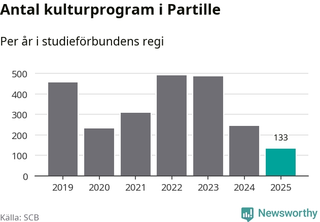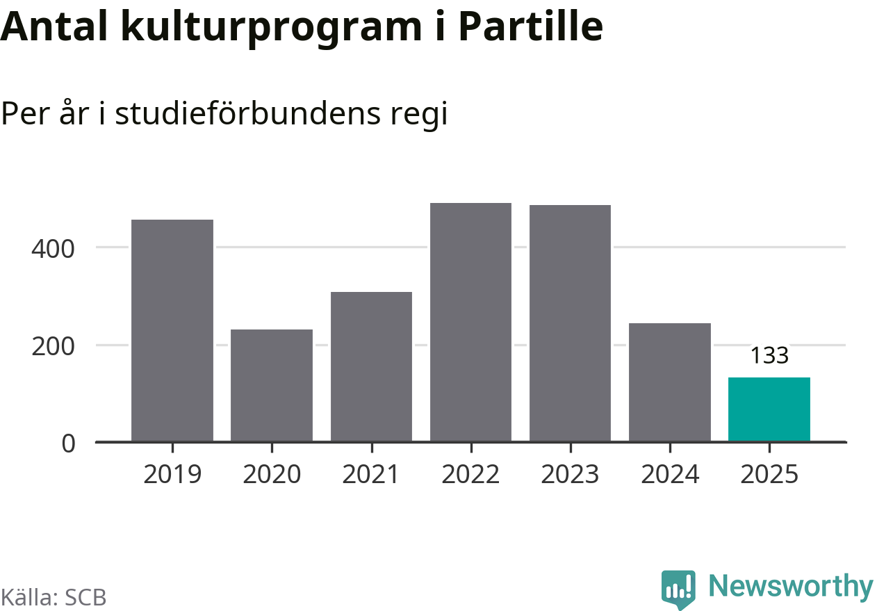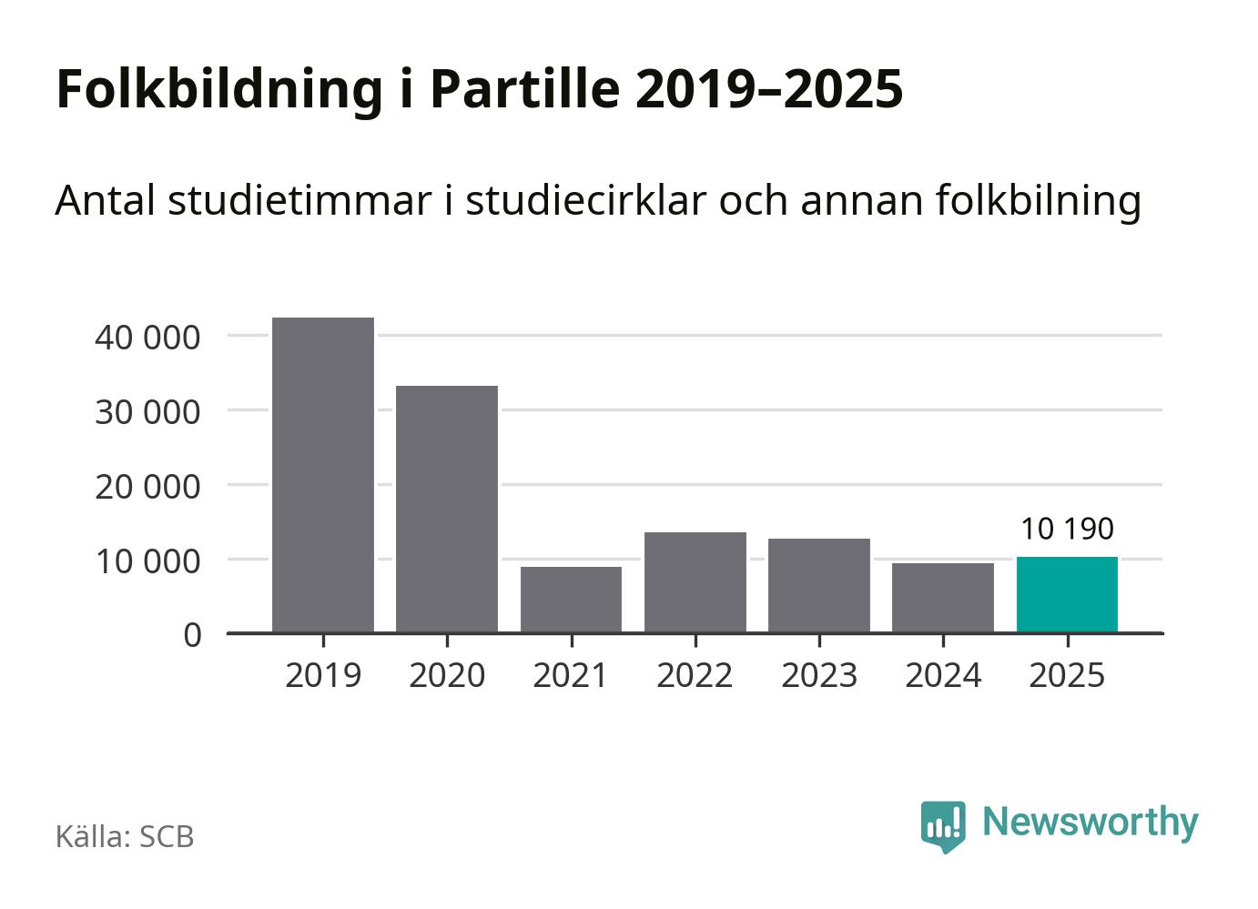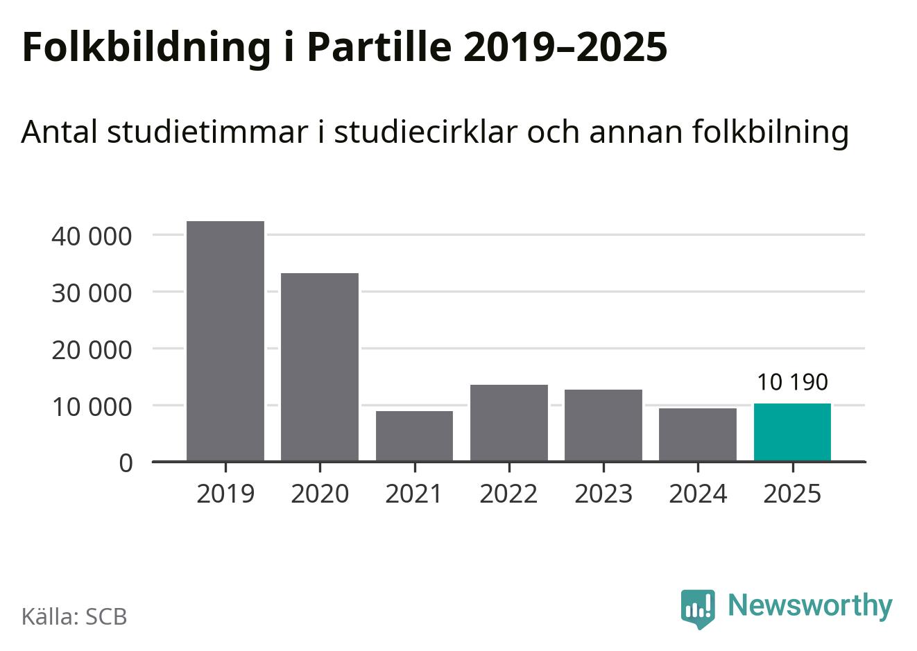 Åtta av de studieförbund som 2025 fick bidrag från Folkbildningsrådet har haft någon form av verksamhet – antingen studiecirkel, annan folkbildning eller kulturprogram – i Partille under de två senaste åren. Under 2025 ökade Bilda, Medborgarskolan och Studieförbundet Vuxenskolan antalet studietimmar i kommunen jämfört med året innan, medan fyra andra förbund i kommunen noterade färre timmar. Folkuniversitetet har bara arrangerat kulturprogram under 2025.