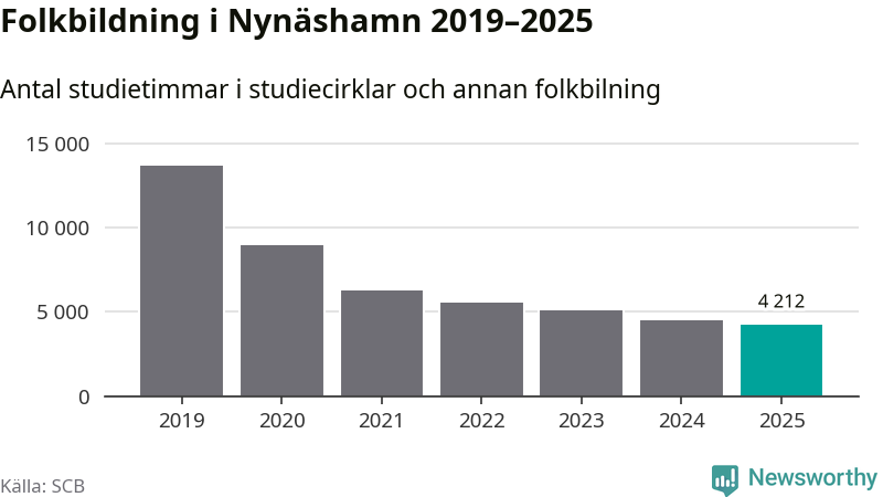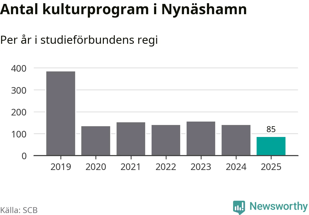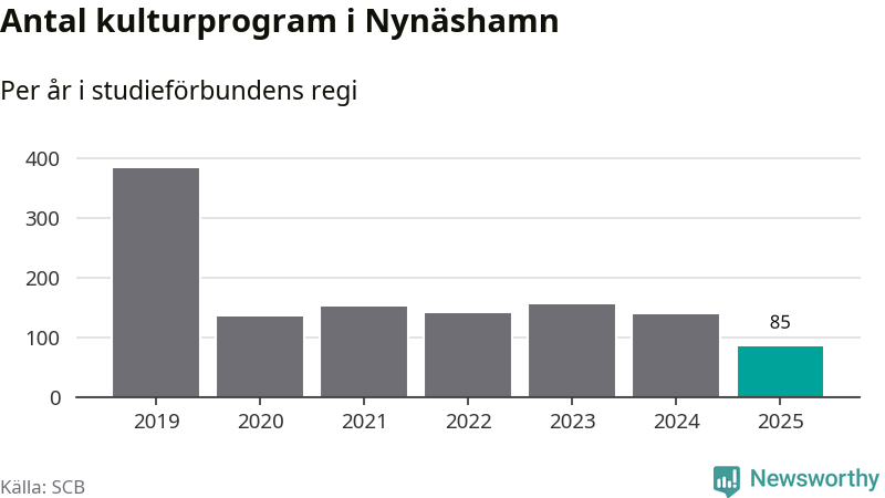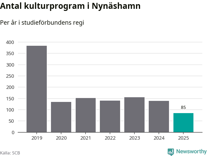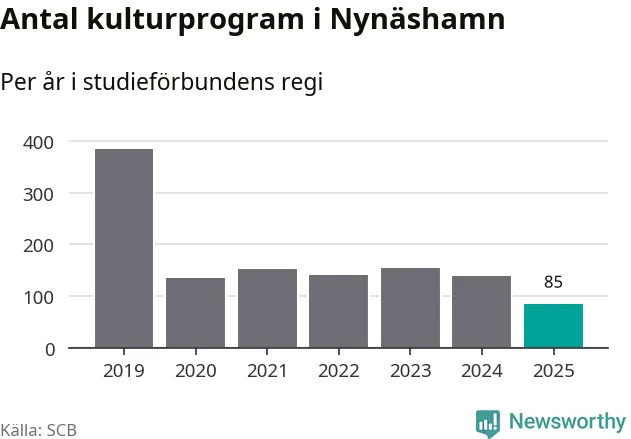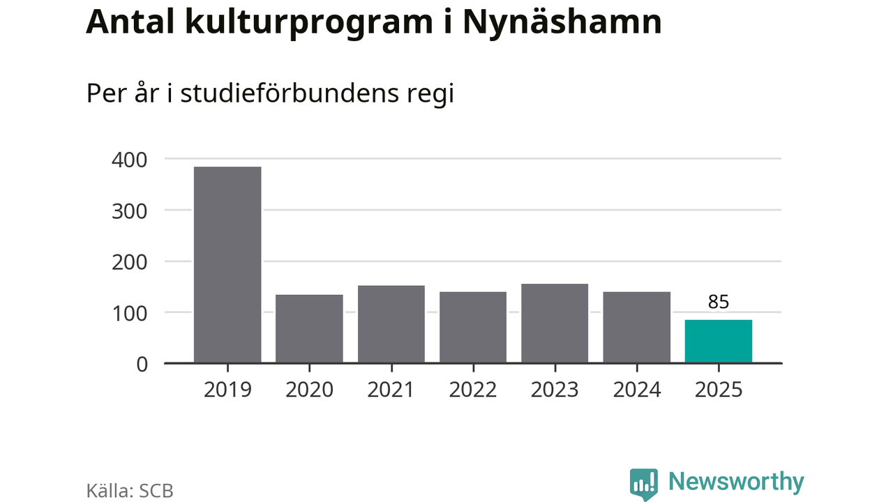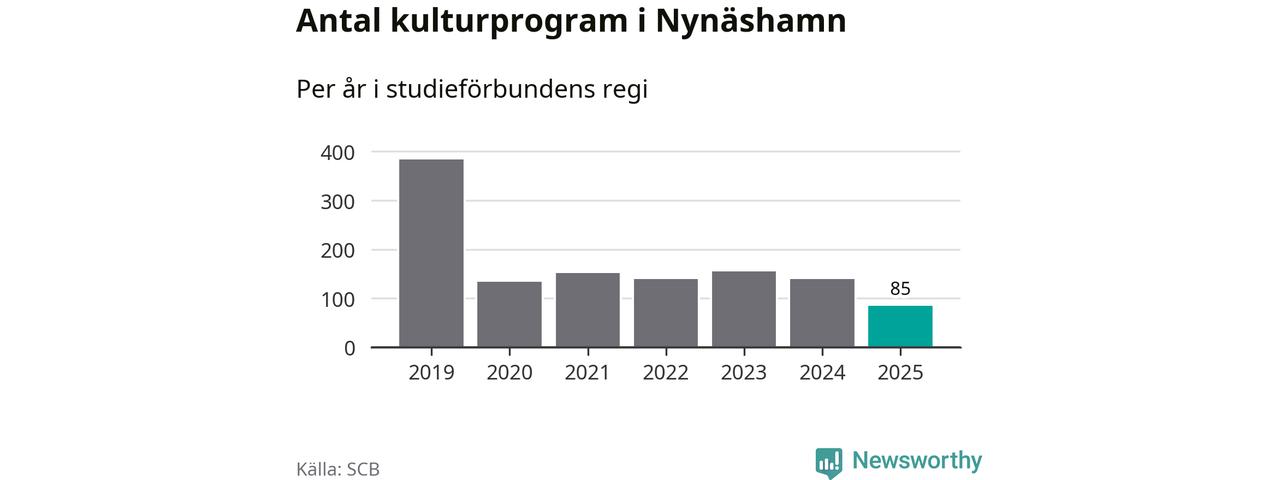 Minskningen är lika stor i Nynäshamn. Förra året hade studieförbunden omkring 4 200 studietimmar i kommunen jämfört med omkring 4 500 året innan. Även antalet kulturprogram i studieförbundens regi minskade, från 139 till 85 stycken.
