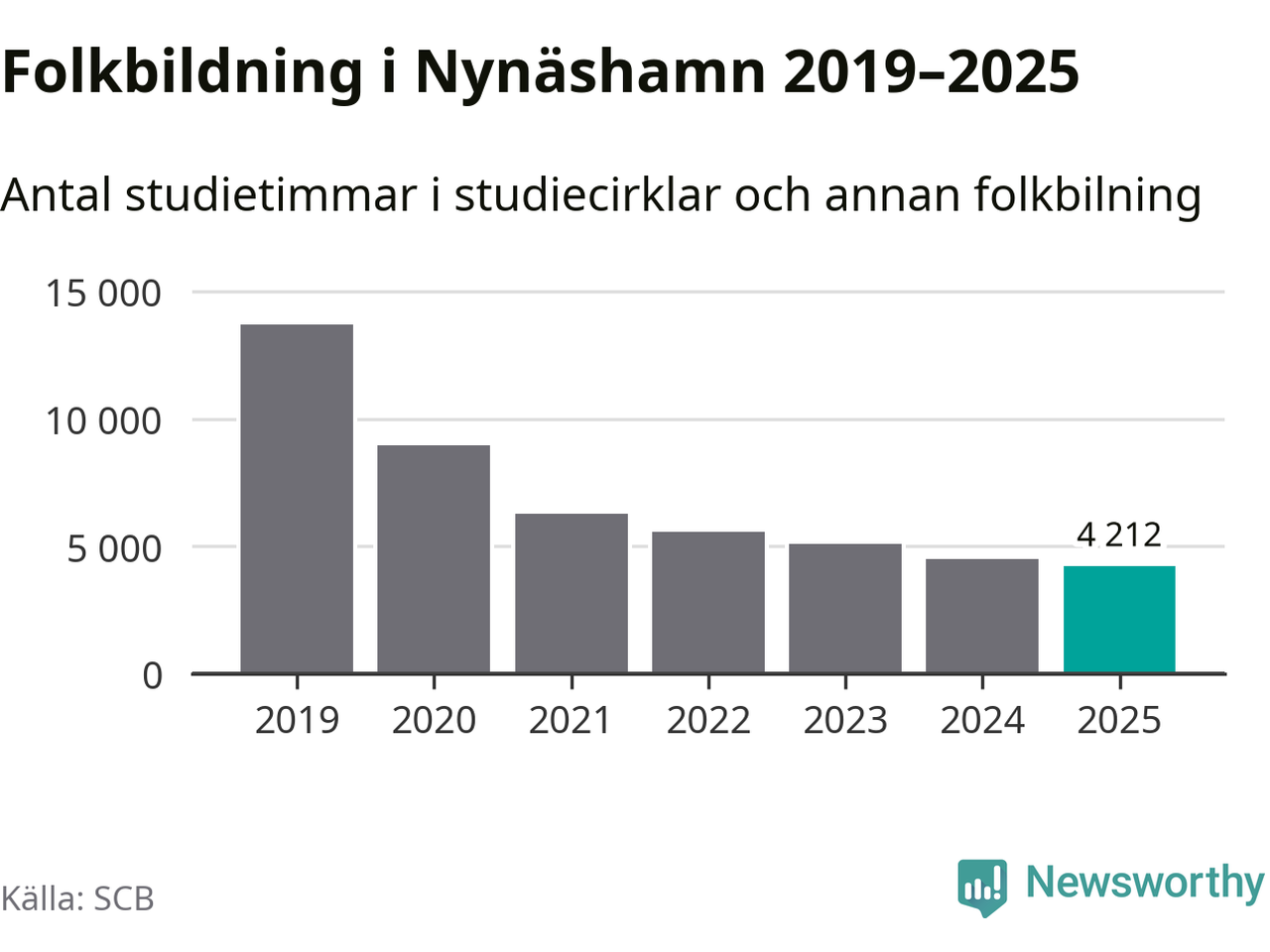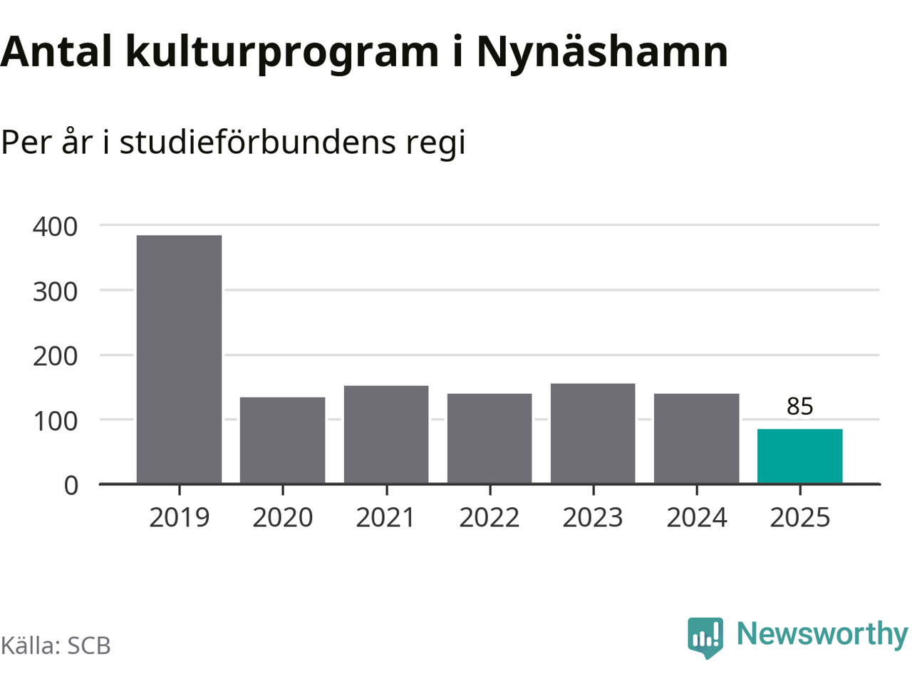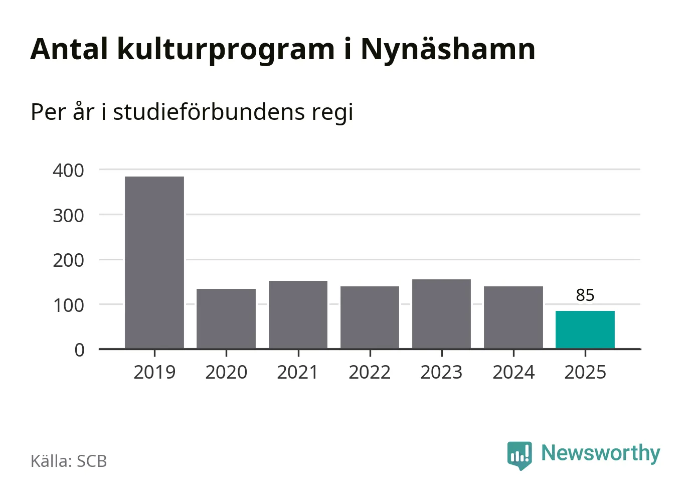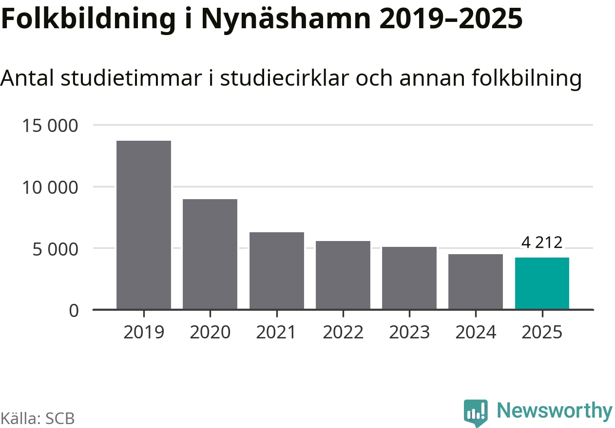 Minskningen är lika stor i Nynäshamn. Förra året hade studieförbunden omkring 4 200 studietimmar i kommunen jämfört med omkring 4 500 året innan. Även antalet kulturprogram i studieförbundens regi minskade, från 139 till 85 stycken.
