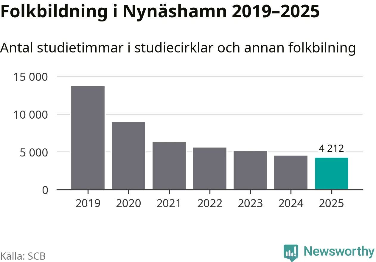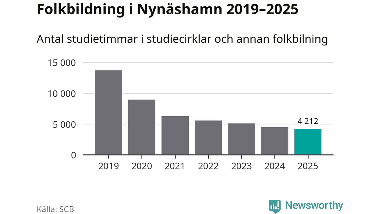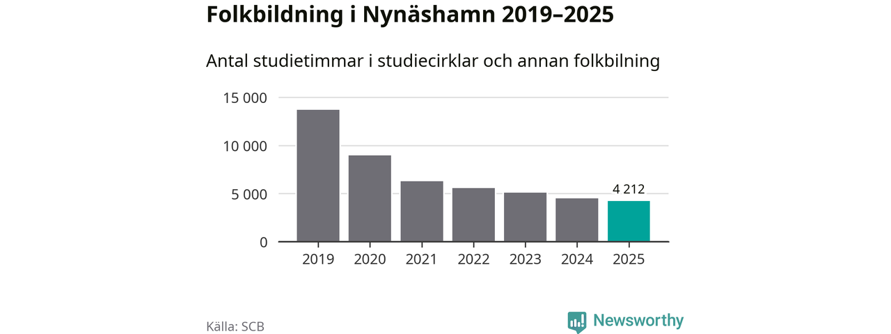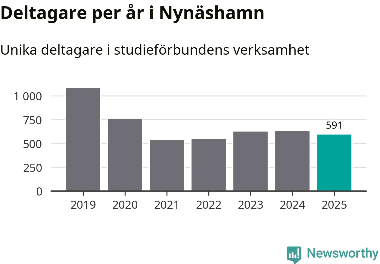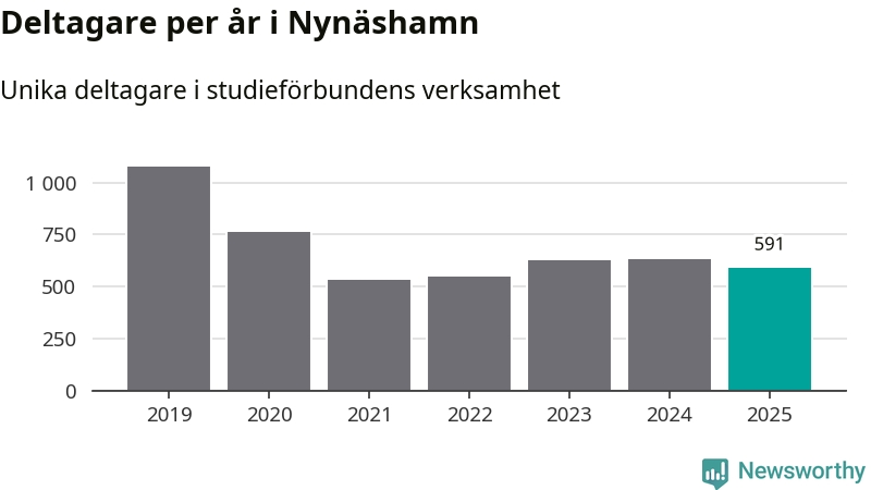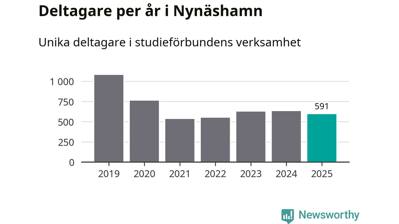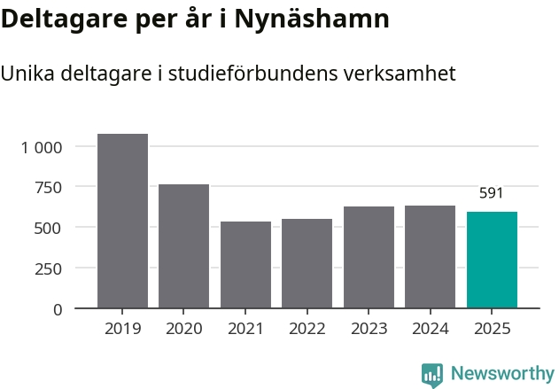 Även sett till unika deltagare är folkbildningen på tillbakagång i Nynäshamn. 2025 deltog 591 personer i studieförbundens verksamhet, vilket är en minskning med sex procent jämfört med året innan. Det innebär att två procent av befolkningen i kommunen deltog i studieförbundens verksamhet under 2025, vilket är lägre än rikssnittet.