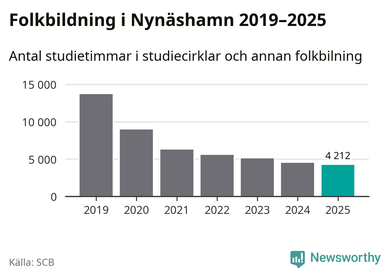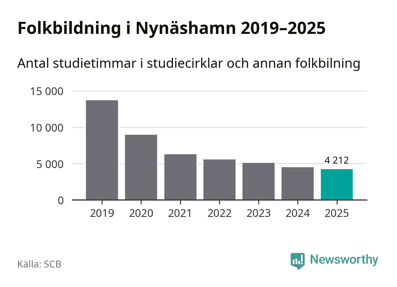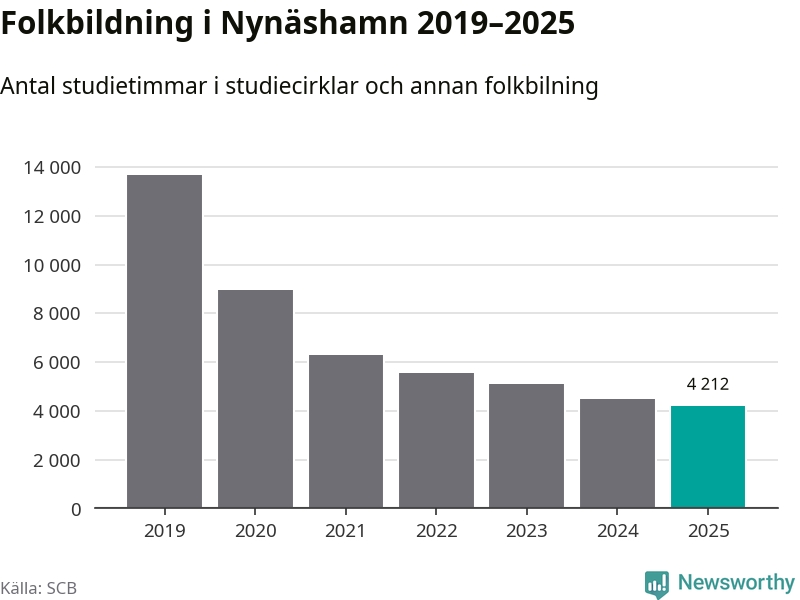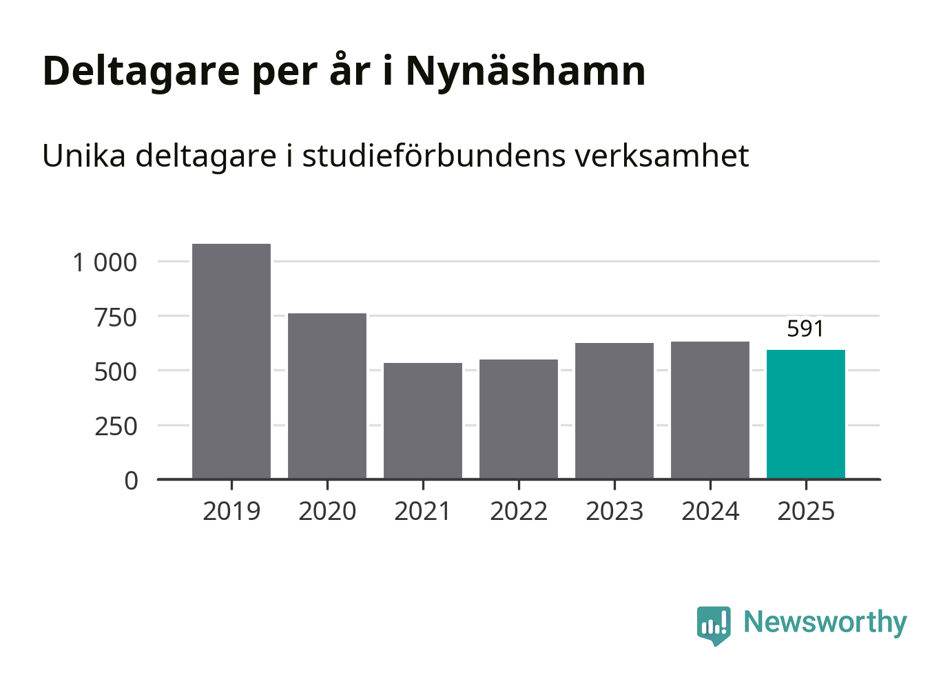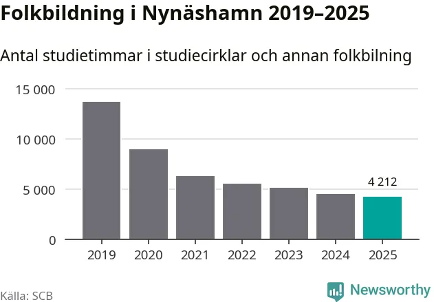 Även sett till unika deltagare är folkbildningen på tillbakagång i Nynäshamn. 2025 deltog 591 personer i studieförbundens verksamhet, vilket är en minskning med sex procent jämfört med året innan. Det innebär att två procent av befolkningen i kommunen deltog i studieförbundens verksamhet under 2025, vilket är lägre än rikssnittet.
