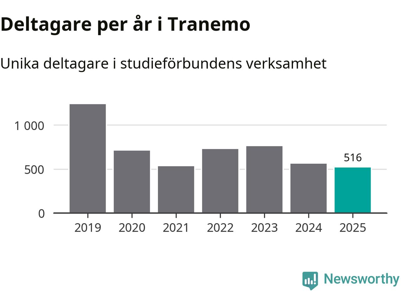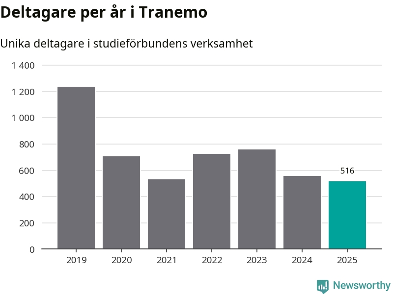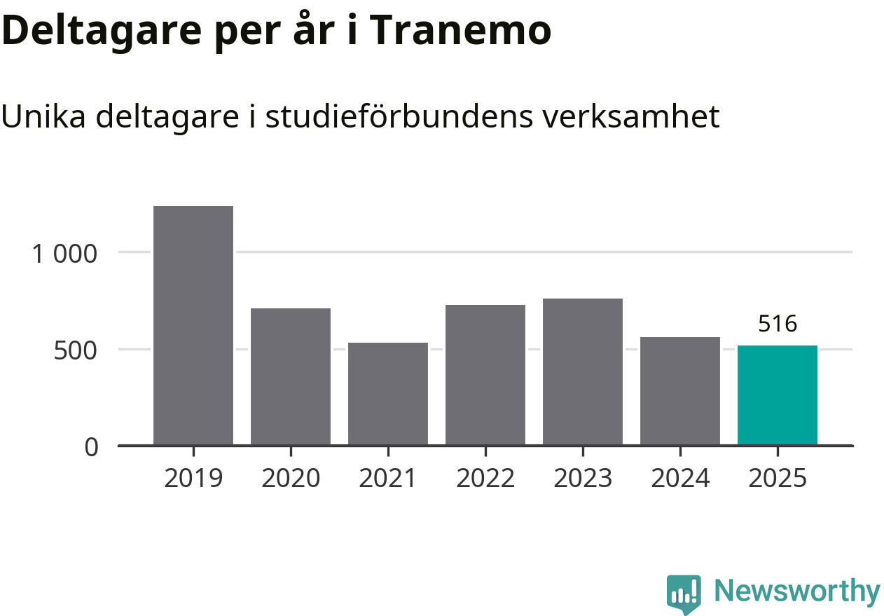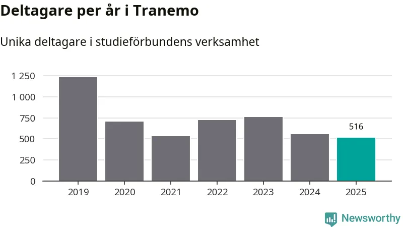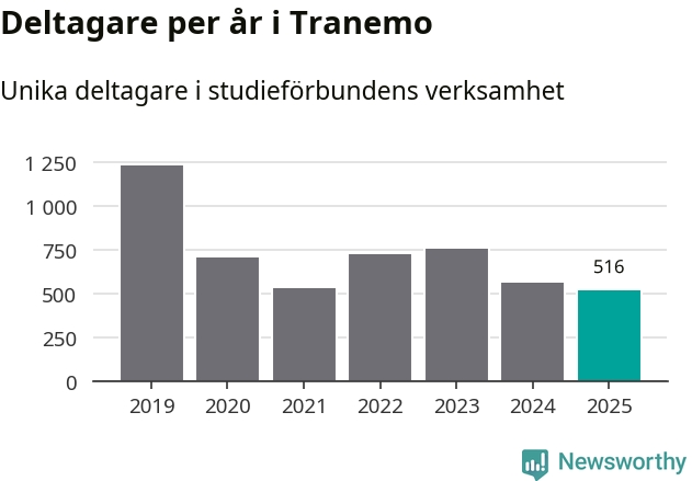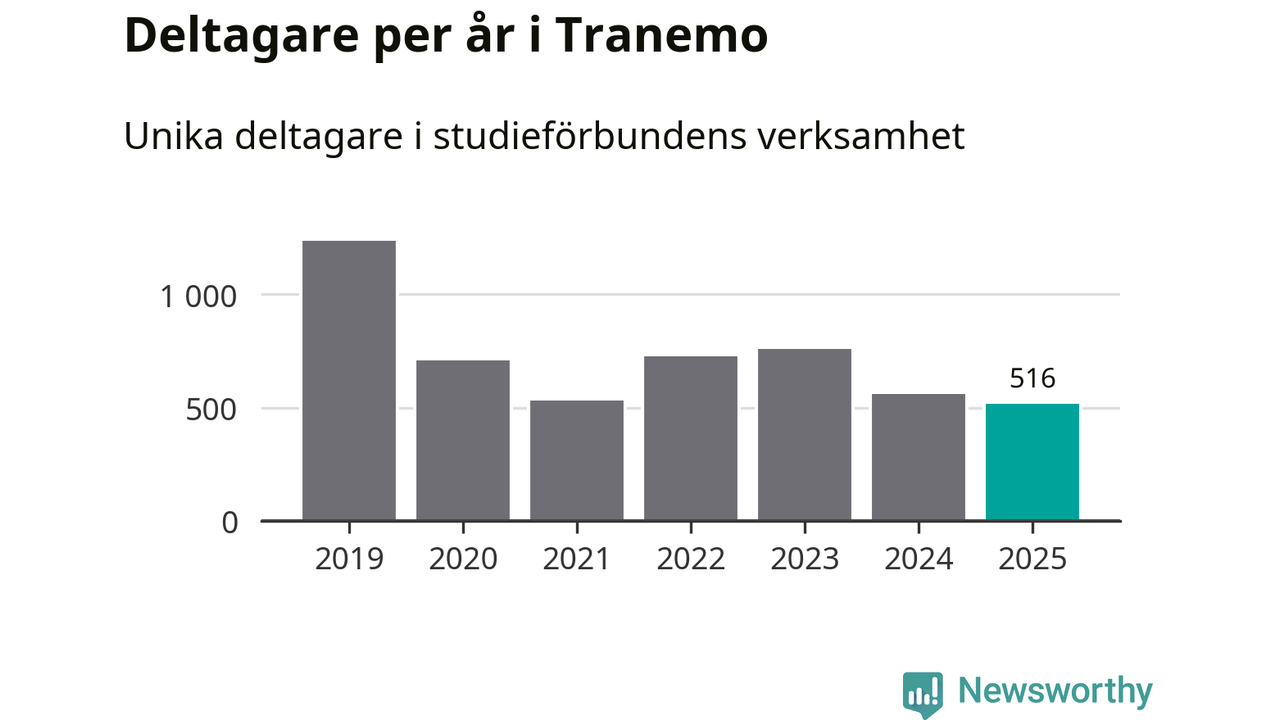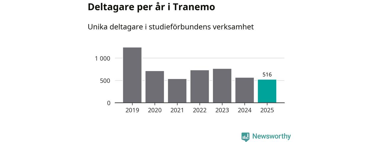 Även sett till unika deltagare är folkbildningen på tillbakagång i Tranemo. 2025 deltog 516 personer i studieförbundens verksamhet, vilket är en minskning med åtta procent jämfört med året innan. Det innebär att fyra procent av befolkningen i kommunen deltog i studieförbundens verksamhet under 2025, vilket är ungefär som rikssnittet.