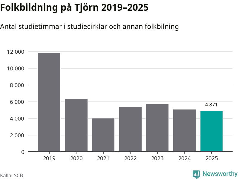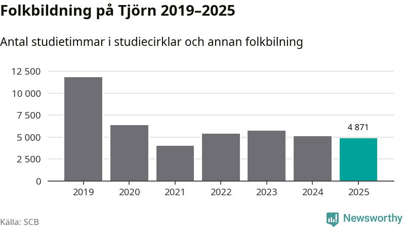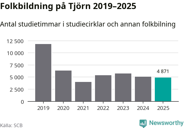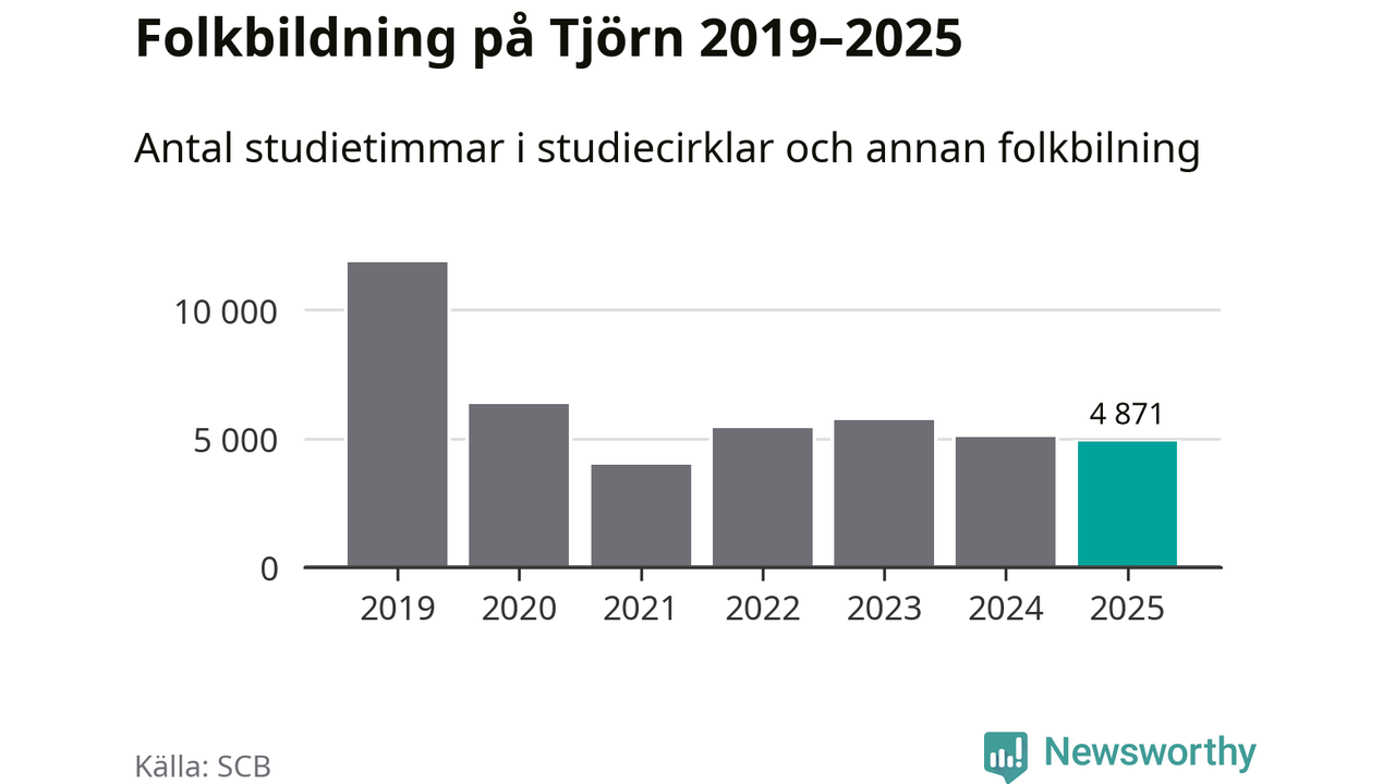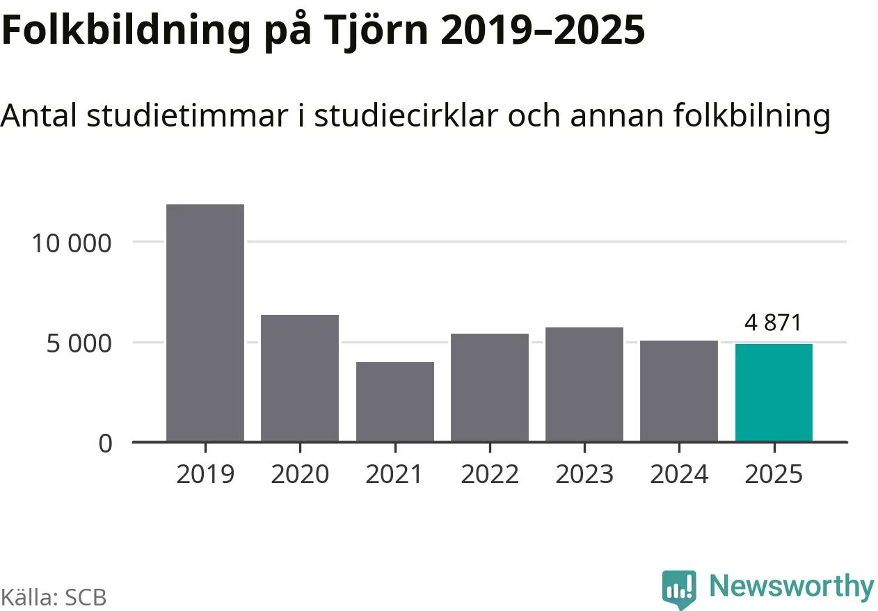 Studieförbunden drabbades hårt av pandemin. Även på Tjörn noterades det lägsta antalet studietimmar under 2021, som då var 66 procent färre än 2019. År 2024 var antalet studietimmar åter högre men de var fortfarande långt från förpandeminivåerna.