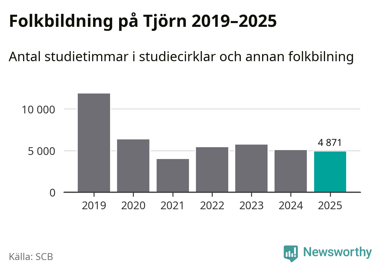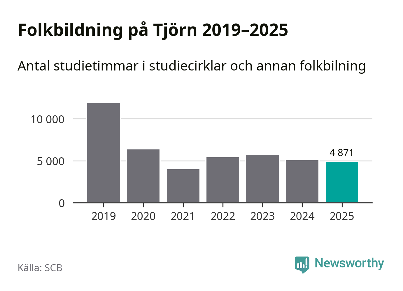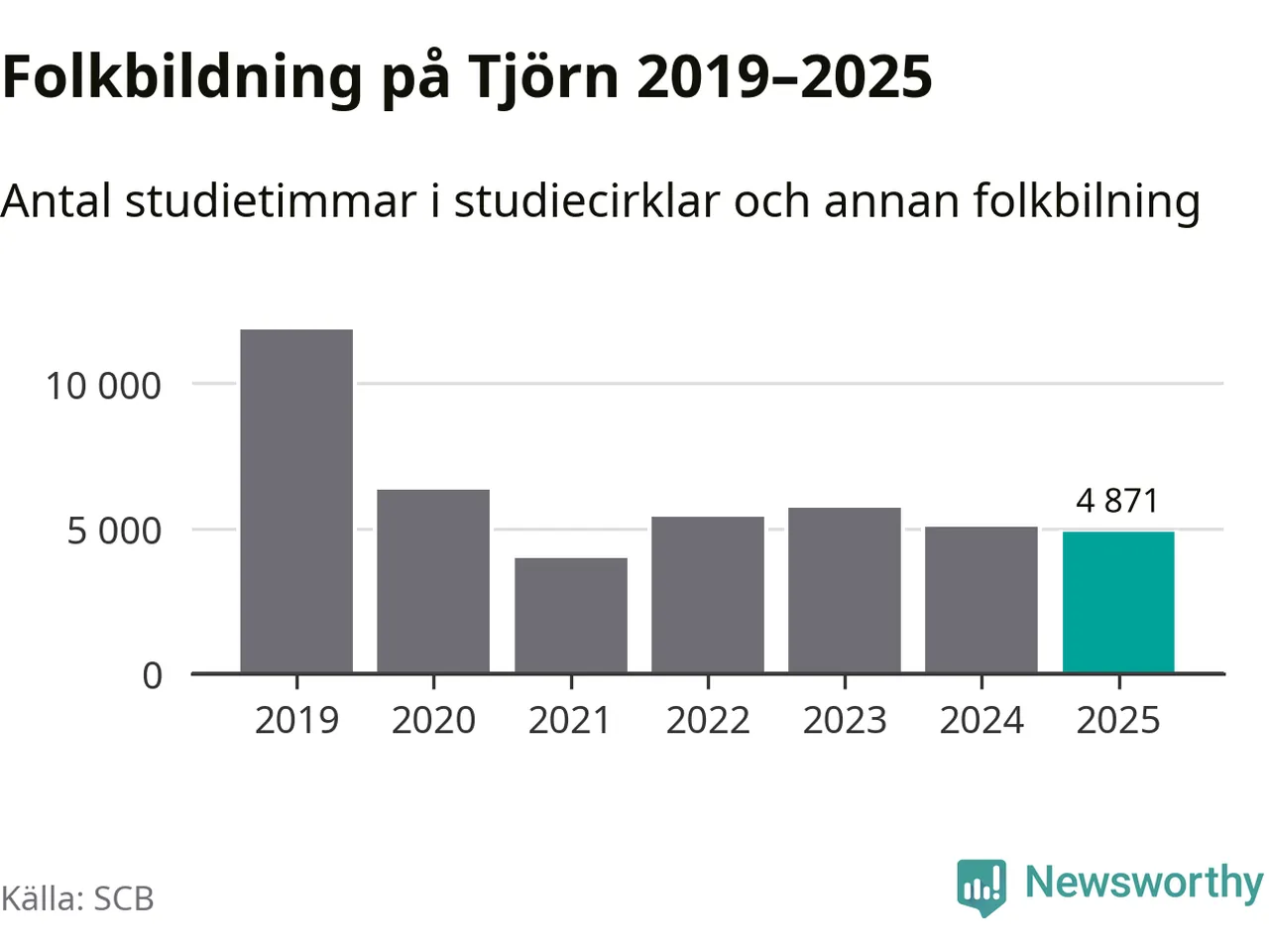 Studieförbunden drabbades hårt av pandemin. Även på Tjörn noterades det lägsta antalet studietimmar under 2021, som då var 66 procent färre än 2019. År 2024 var antalet studietimmar åter högre men de var fortfarande långt från förpandeminivåerna.
