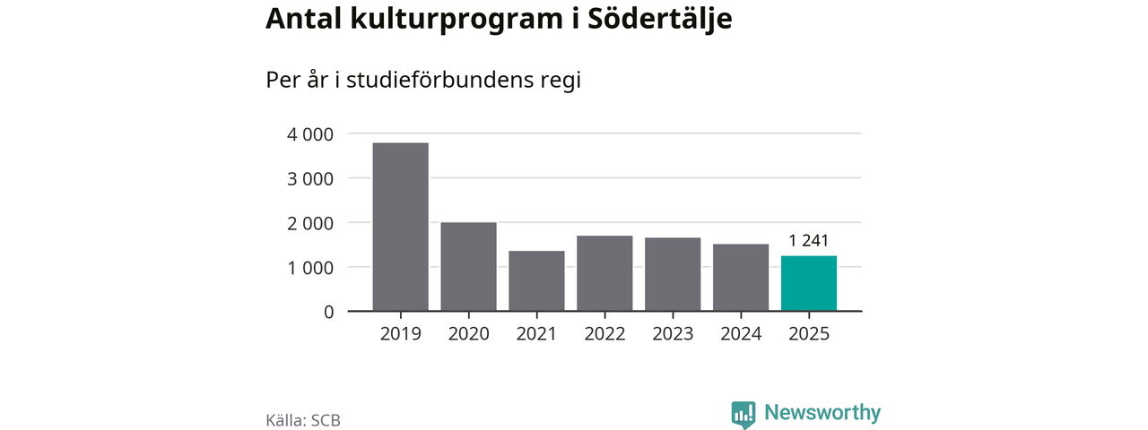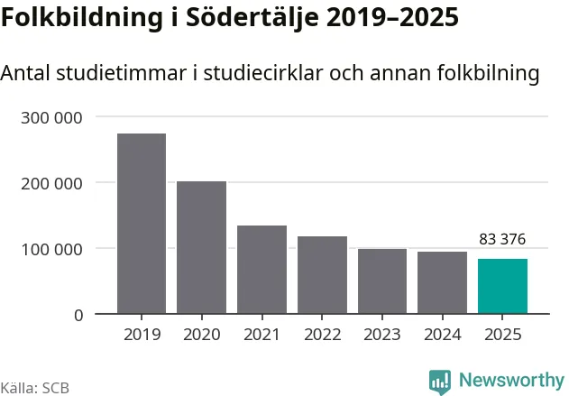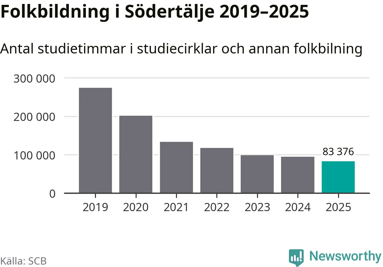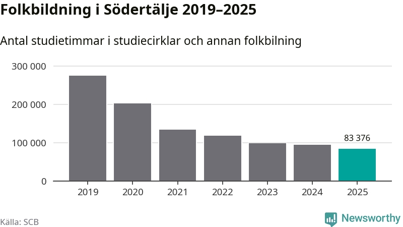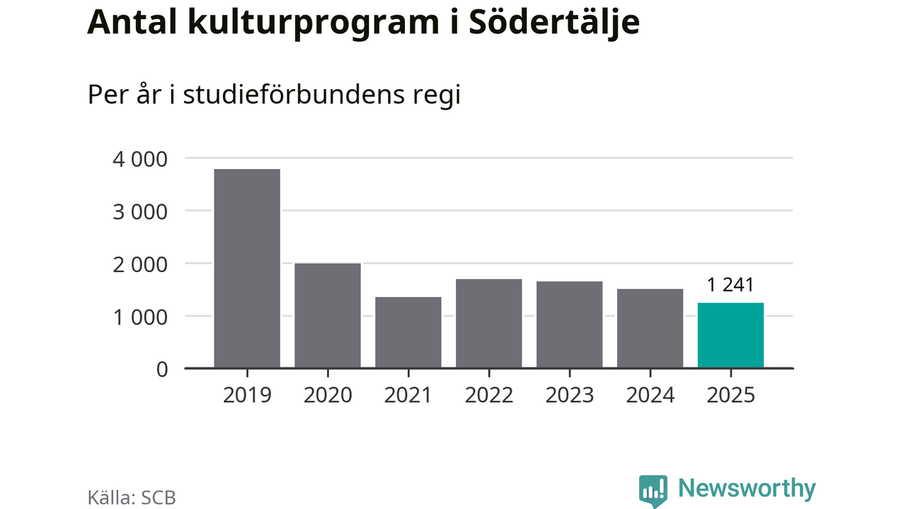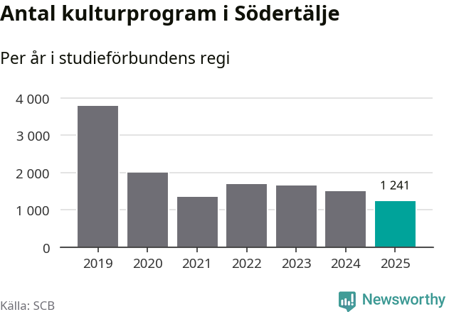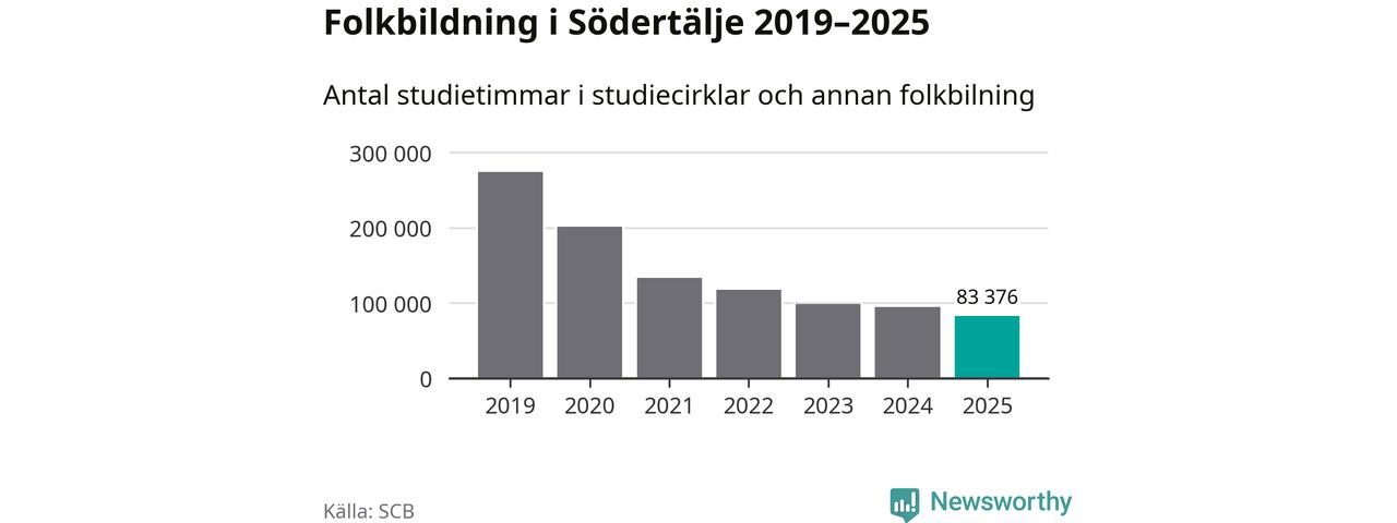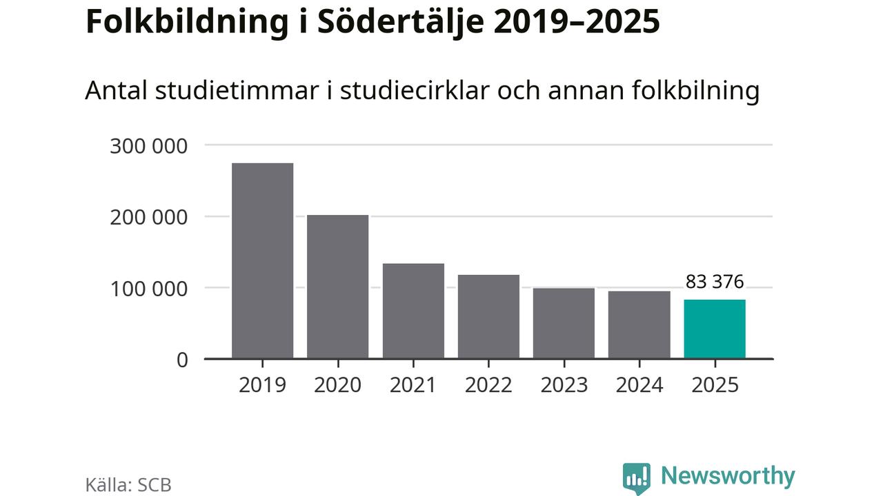 I Södertälje är minskningen ännu större: förra året hade studieförbunden omkring 83 400 studietimmar i kommunen, vilket är en minskning med tolv procent jämfört med året innan. Även antalet kulturprogram i studieförbundens regi minskade, från 1 507 till 1 241 stycken.