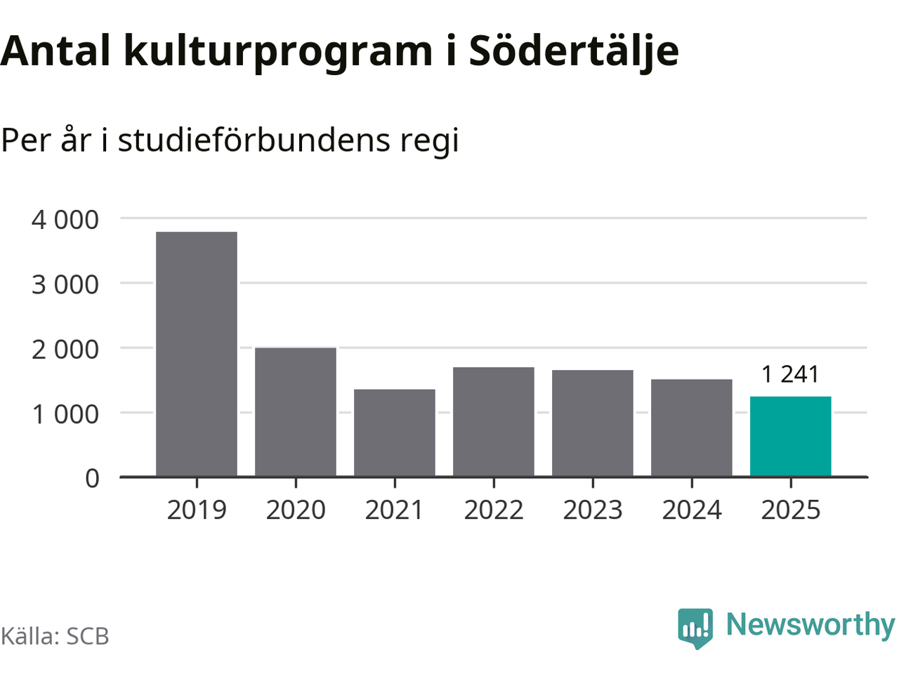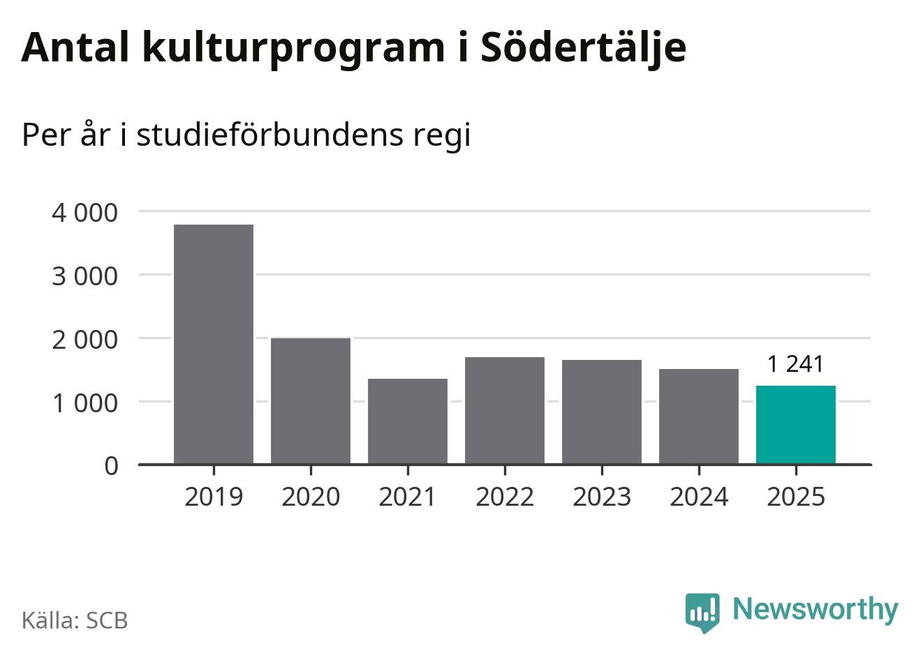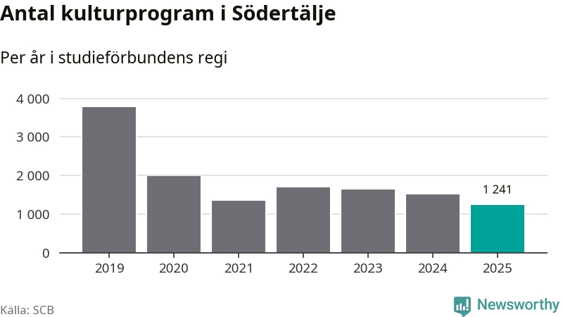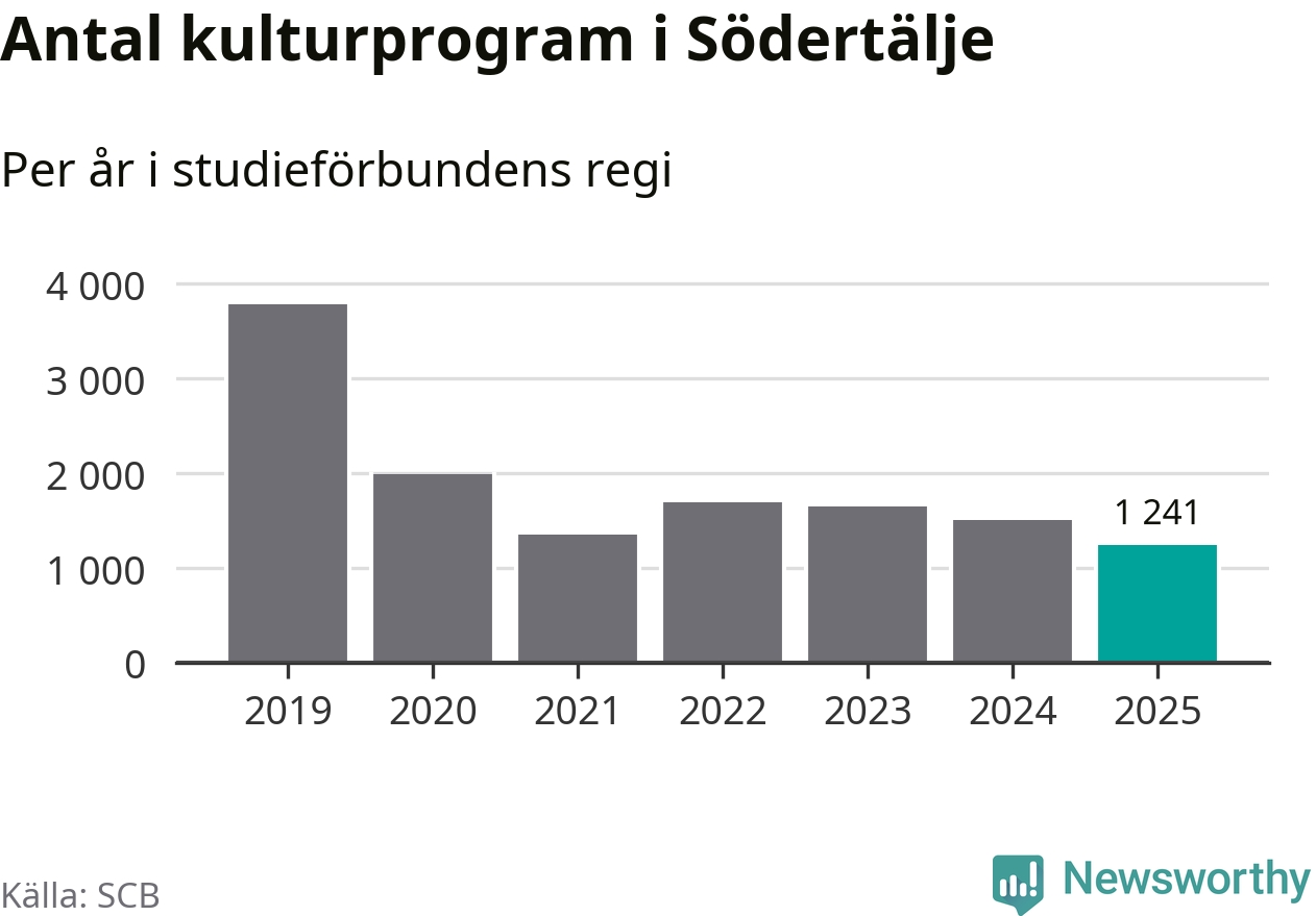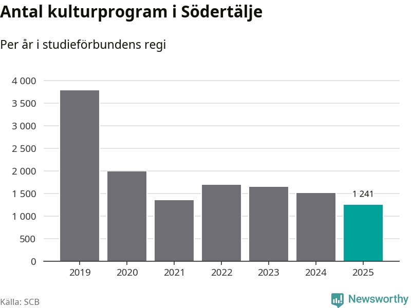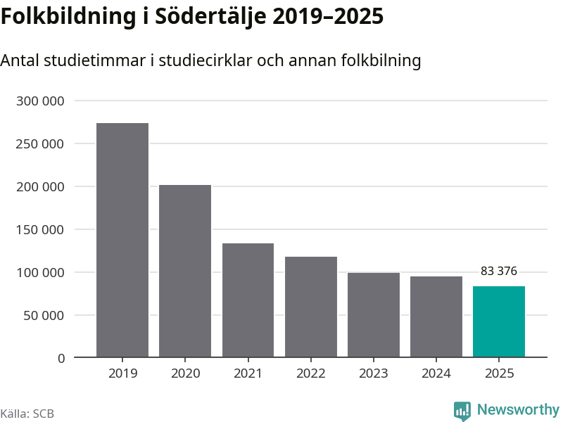 I Södertälje är minskningen ännu större: förra året hade studieförbunden omkring 83 400 studietimmar i kommunen, vilket är en minskning med tolv procent jämfört med året innan. Även antalet kulturprogram i studieförbundens regi minskade, från 1 507 till 1 241 stycken.