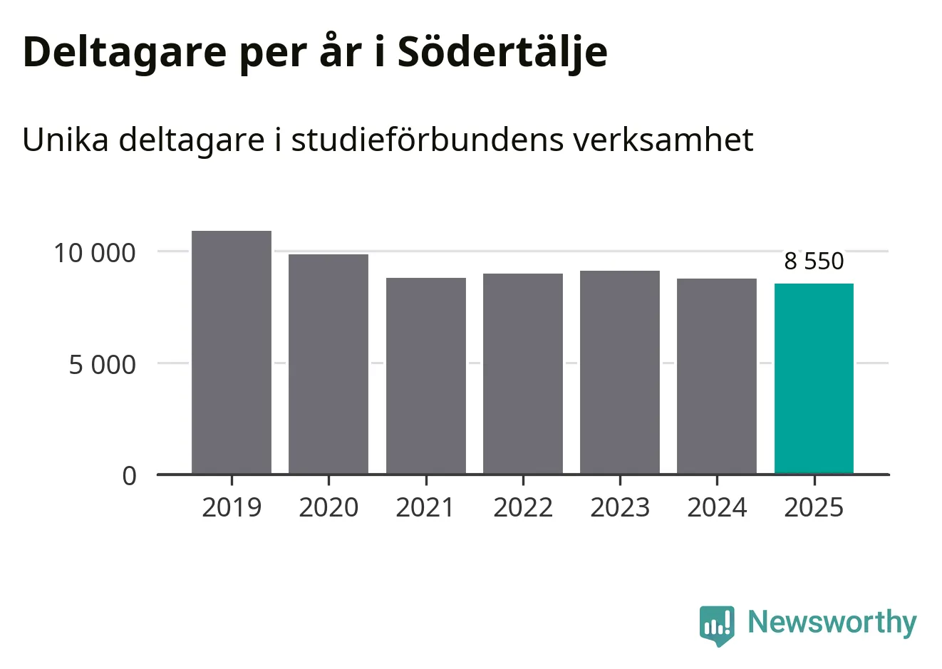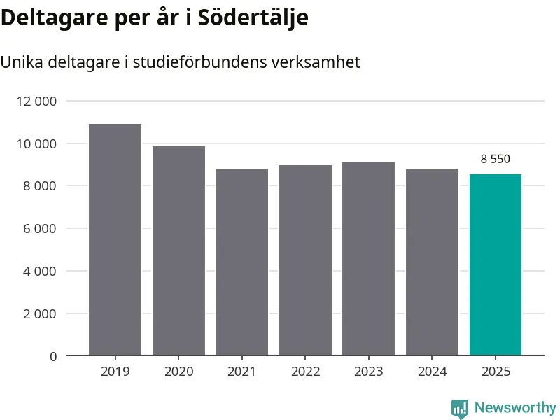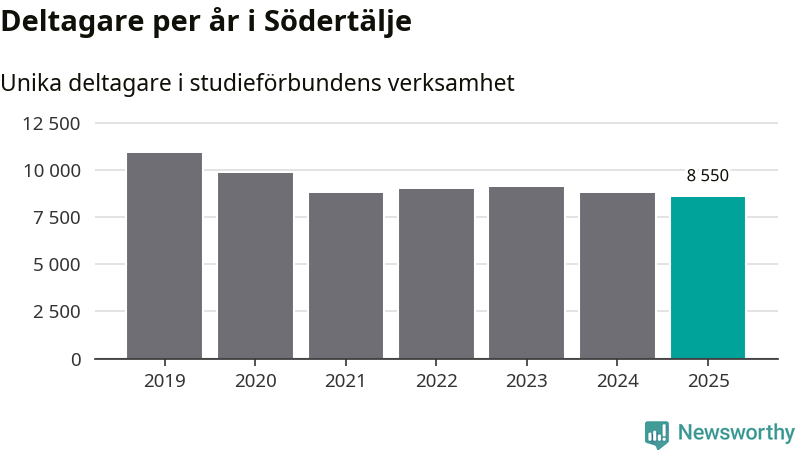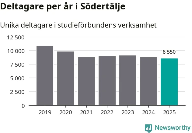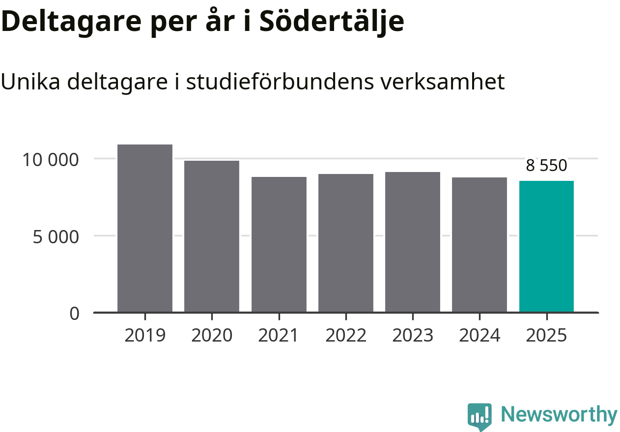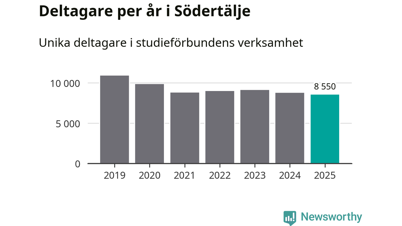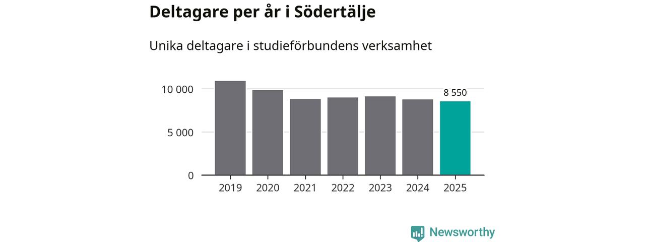 Även sett till unika deltagare är folkbildningen på tillbakagång i Södertälje. 2025 deltog 8 550 personer i studieförbundens verksamhet, vilket är en minskning med tre procent jämfört med året innan. Det innebär att åtta procent av befolkningen i kommunen deltog i studieförbundens verksamhet under 2025. Det är den högsta andelen i Stockholms län.