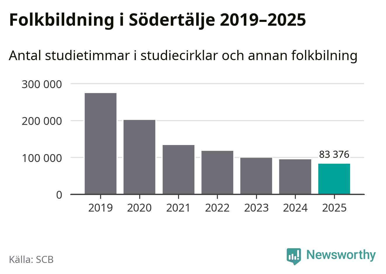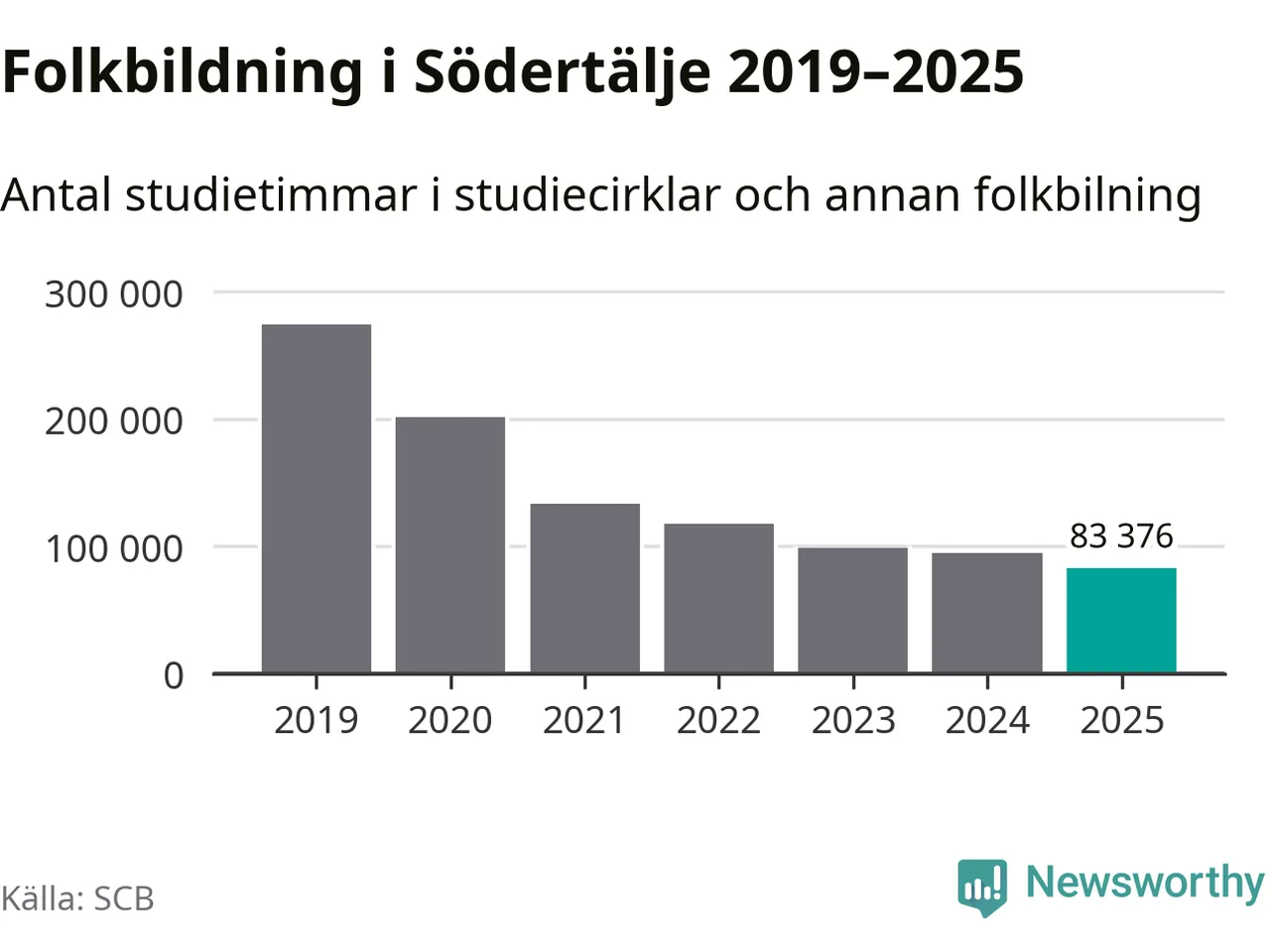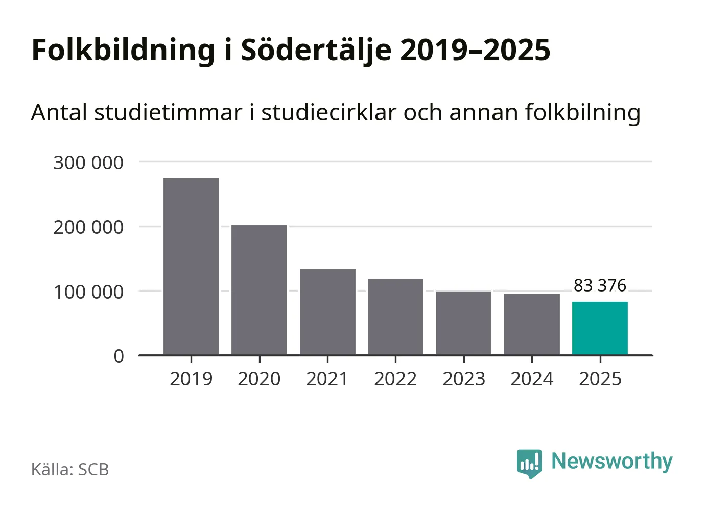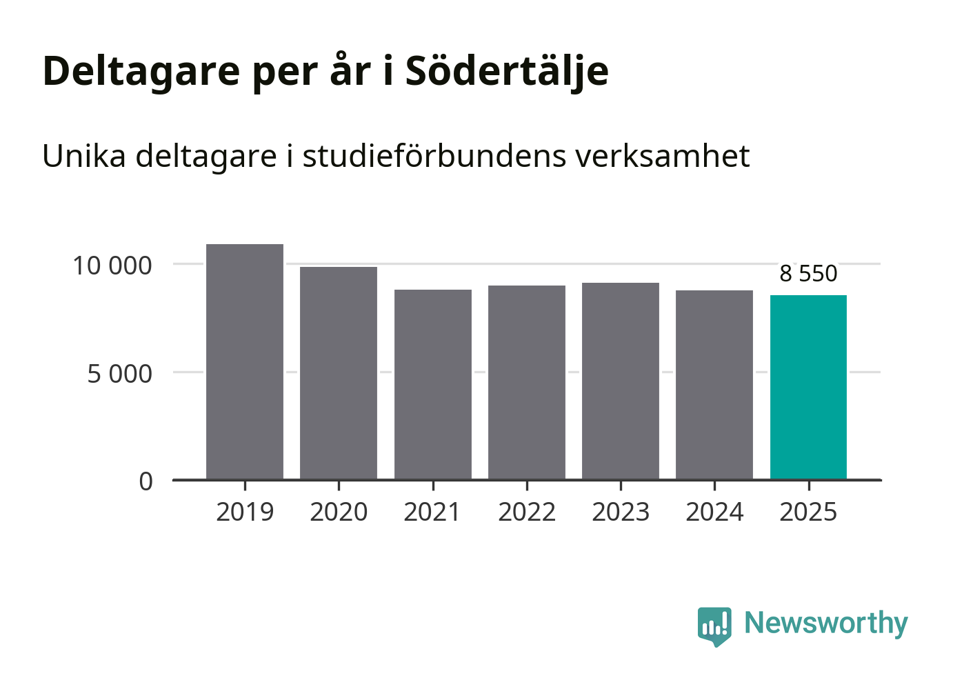 Även sett till unika deltagare är folkbildningen på tillbakagång i Södertälje. 2025 deltog 8 550 personer i studieförbundens verksamhet, vilket är en minskning med tre procent jämfört med året innan. Det innebär att åtta procent av befolkningen i kommunen deltog i studieförbundens verksamhet under 2025. Det är den högsta andelen i Stockholms län.