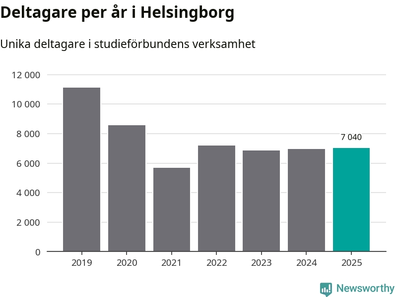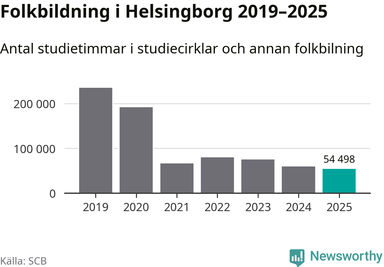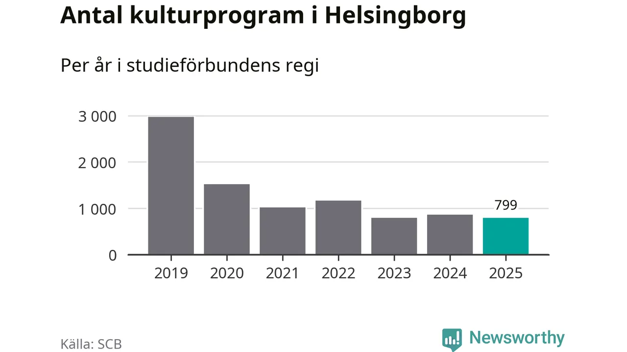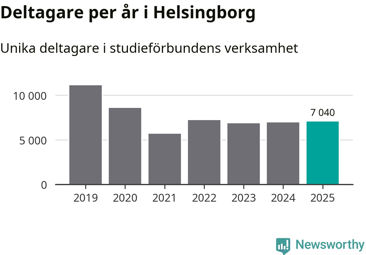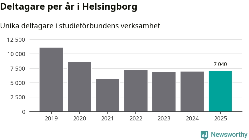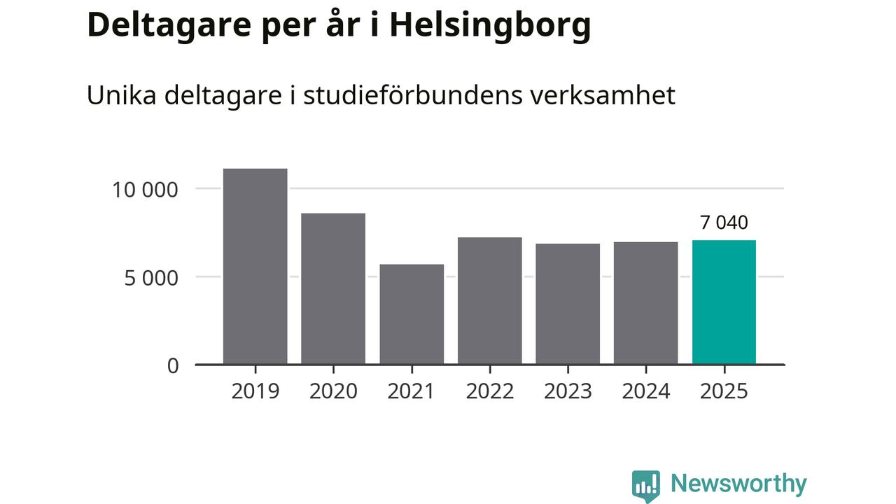 Omkring 7 000 helsingborgare deltog i någon form av folkbildning under 2025, vilket är ungefär lika många som året innan. Det innebär att fem procent av befolkningen i kommunen deltog i studieförbundens verksamhet under 2025, vilket är ungefär som rikssnittet.