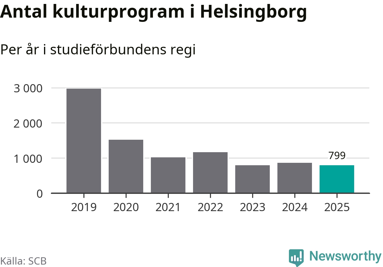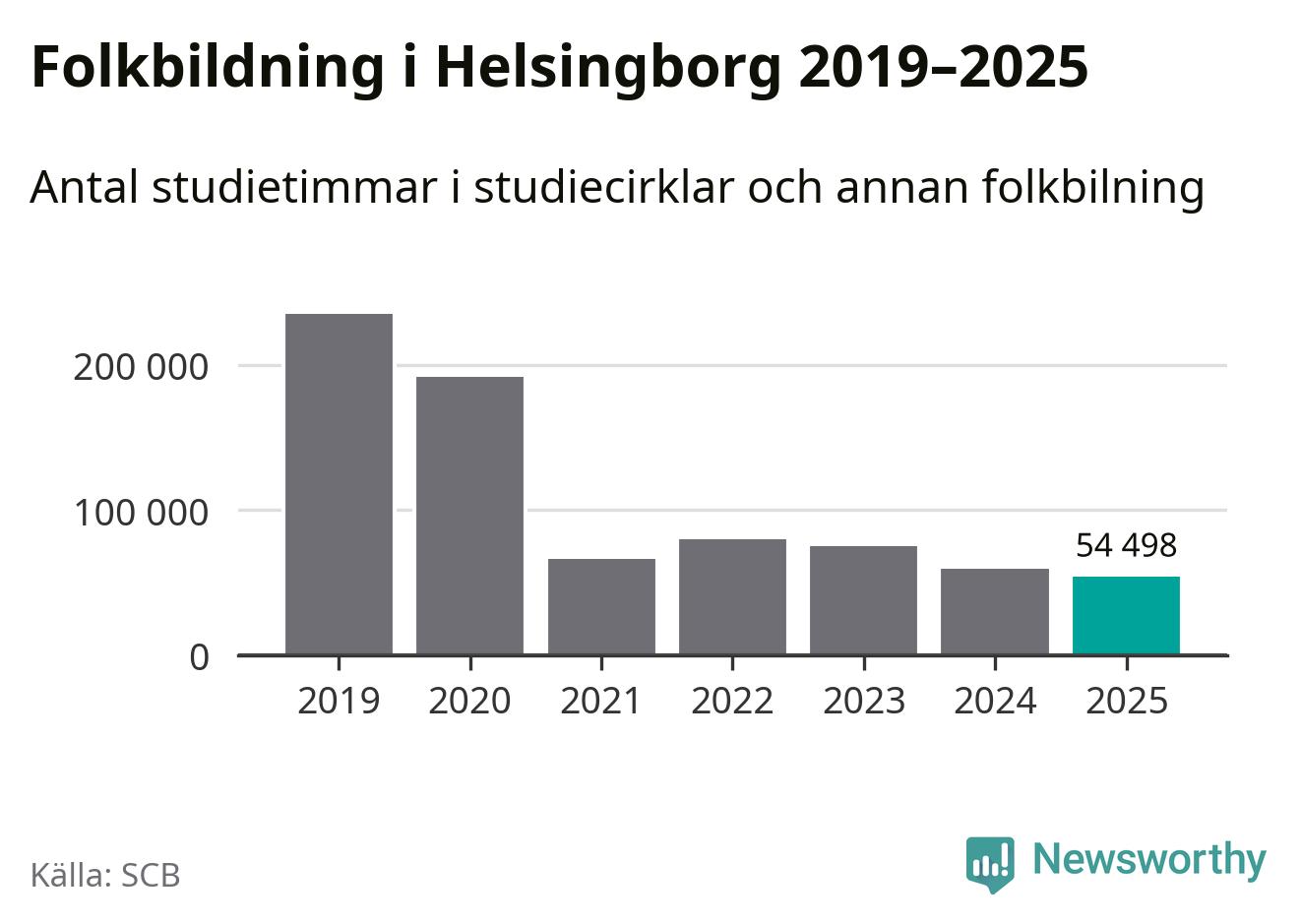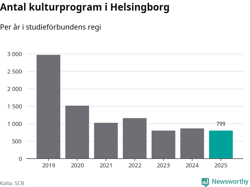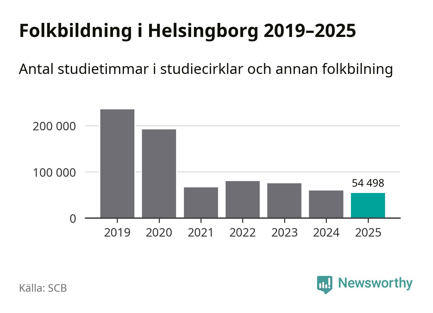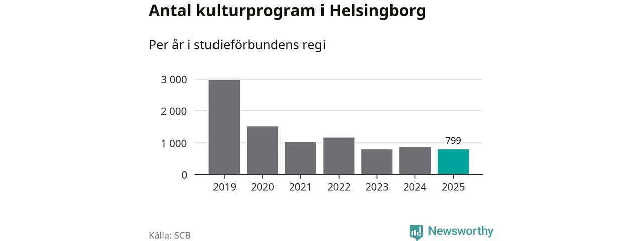 Omkring 7 000 helsingborgare deltog i någon form av folkbildning under 2025, vilket är ungefär lika många som året innan. Det innebär att fem procent av befolkningen i kommunen deltog i studieförbundens verksamhet under 2025, vilket är ungefär som rikssnittet.