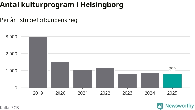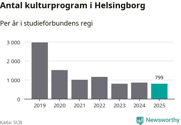 I Helsingborg är minskningen ännu större: förra året hade studieförbunden omkring 54 500 studietimmar i kommunen, vilket är en minskning med nio procent jämfört med året innan. Även antalet kulturprogram i studieförbundens regi minskade, från 862 till 799 stycken.