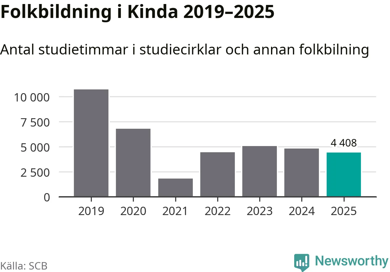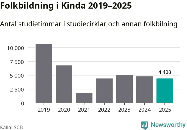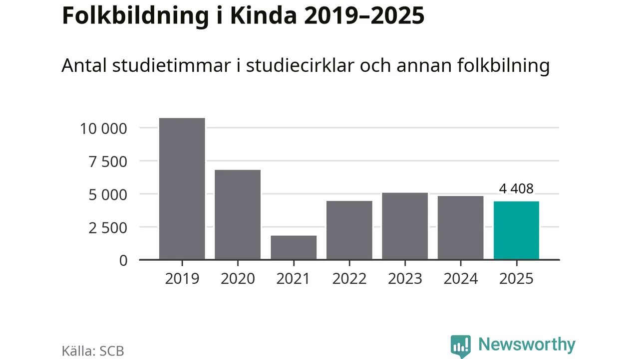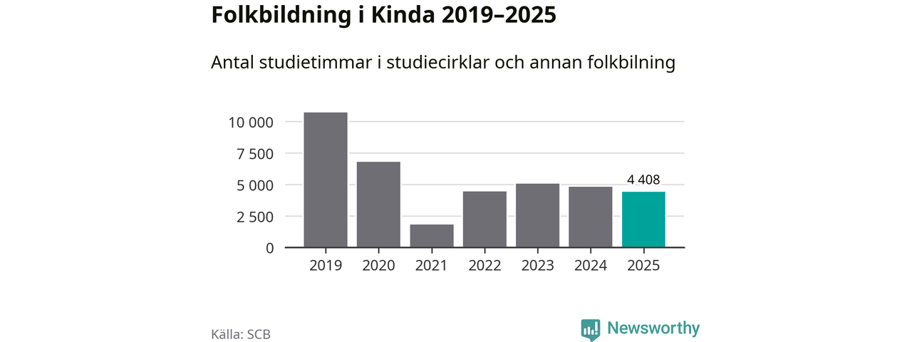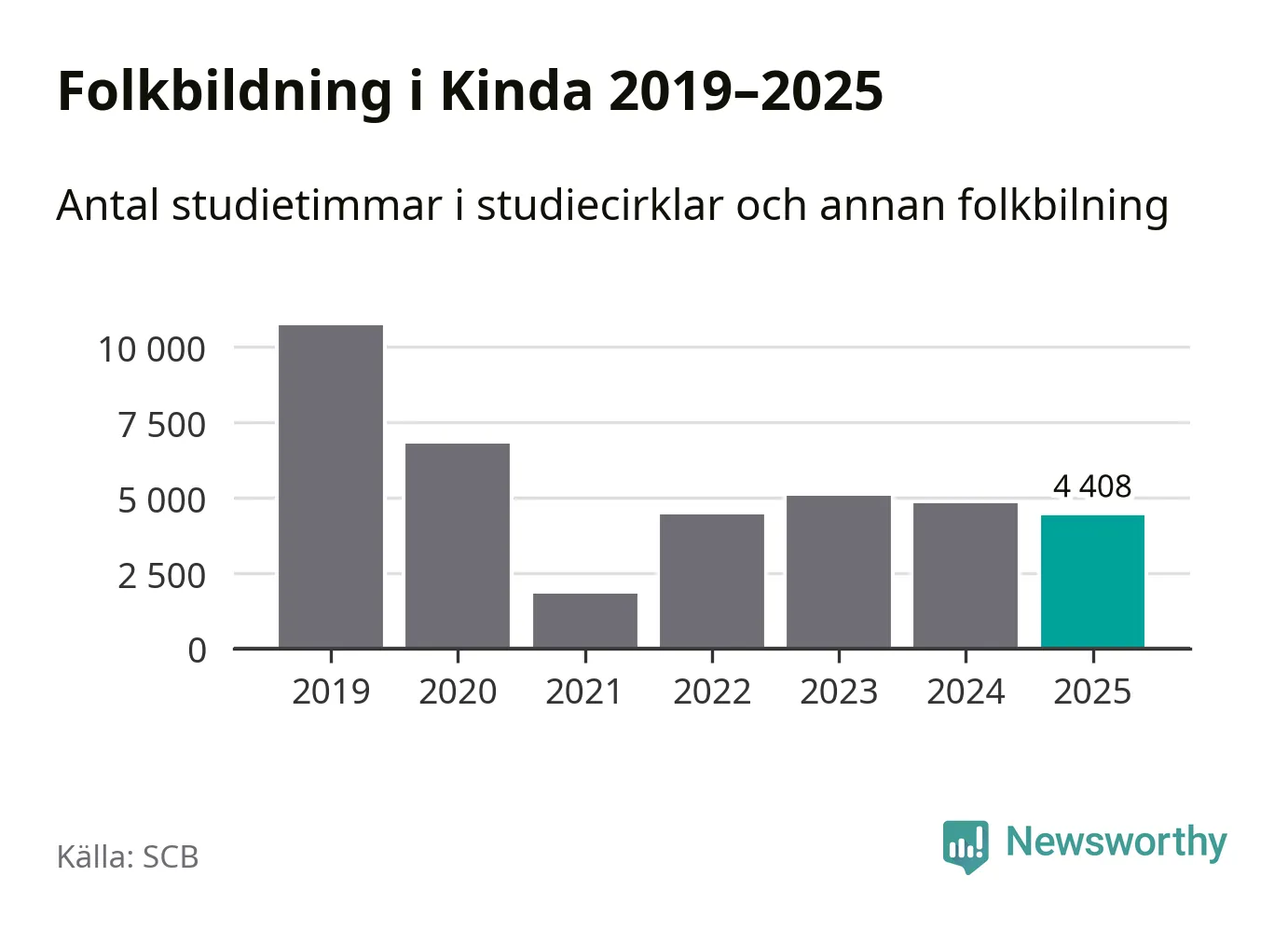Studieförbunden drabbades hårt av pandemin. Även i Kinda noterades det lägsta antalet studietimmar under 2021, som då var 83 procent färre än 2019. År 2024 var antalet studietimmar åter högre men de var fortfarande långt från förpandeminivåerna.