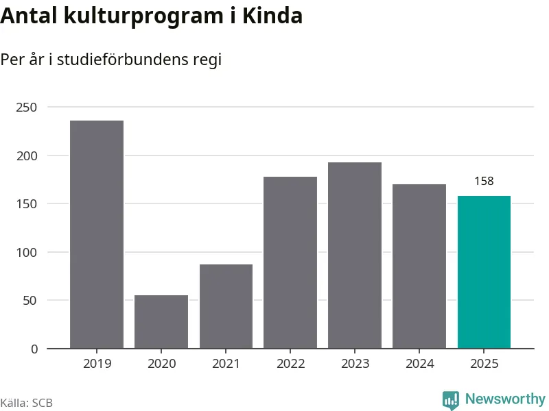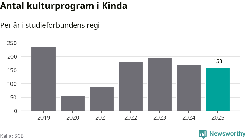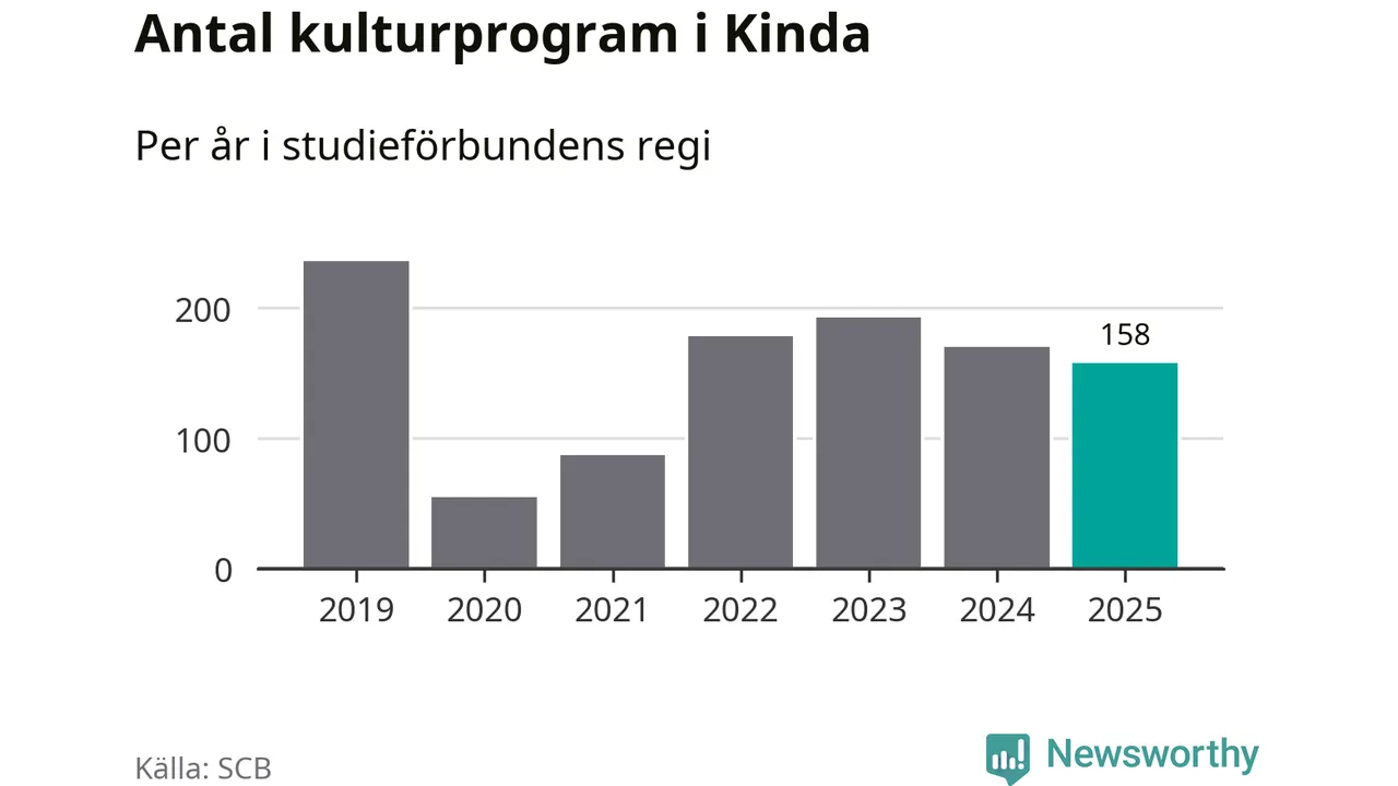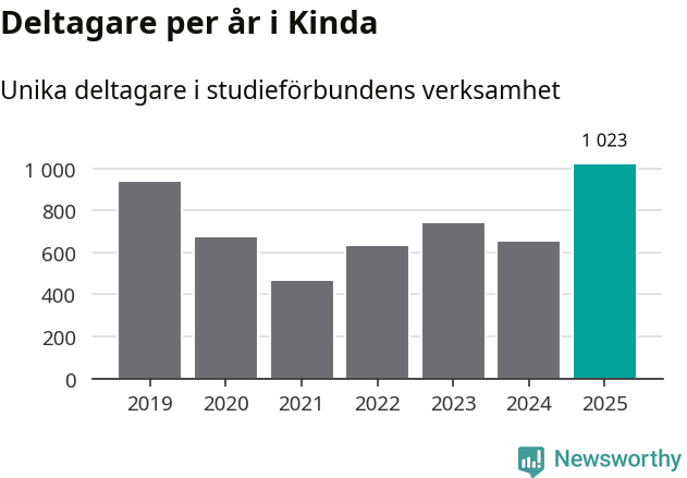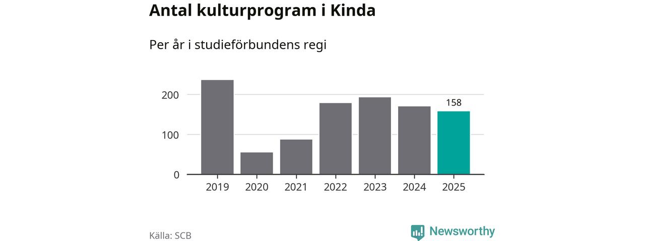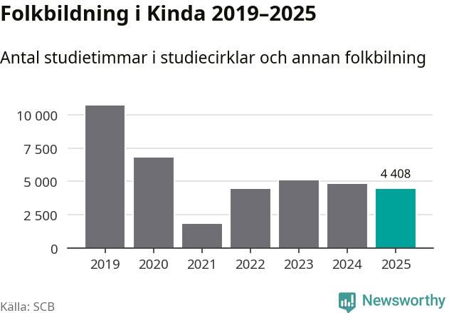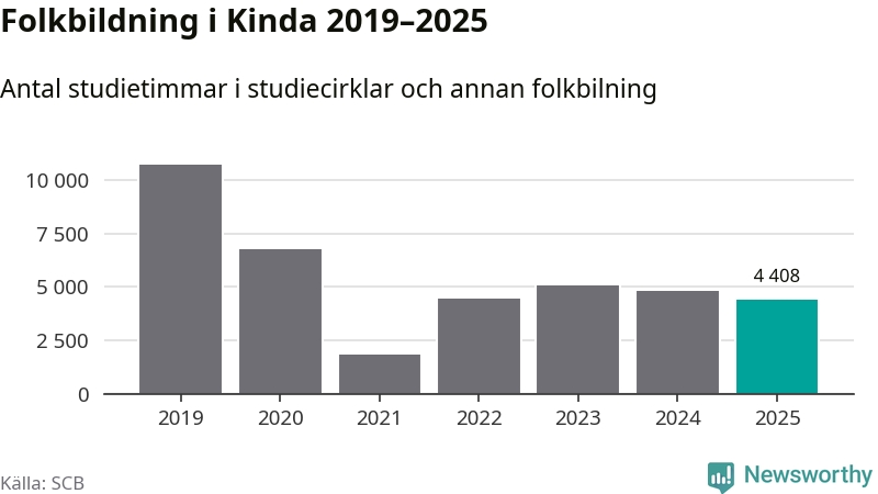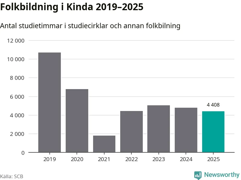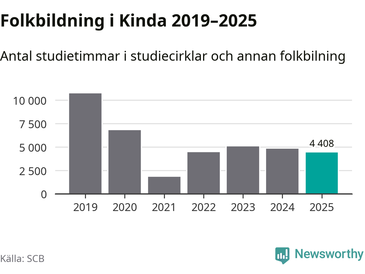 Studieförbunden drabbades hårt av pandemin. Även i Kinda noterades det lägsta antalet studietimmar under 2021, som då var 83 procent färre än 2019. År 2024 var antalet studietimmar åter högre men de var fortfarande långt från förpandeminivåerna.
