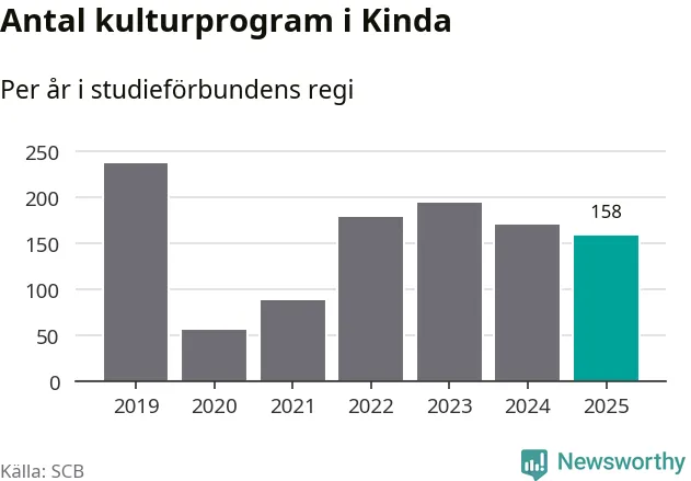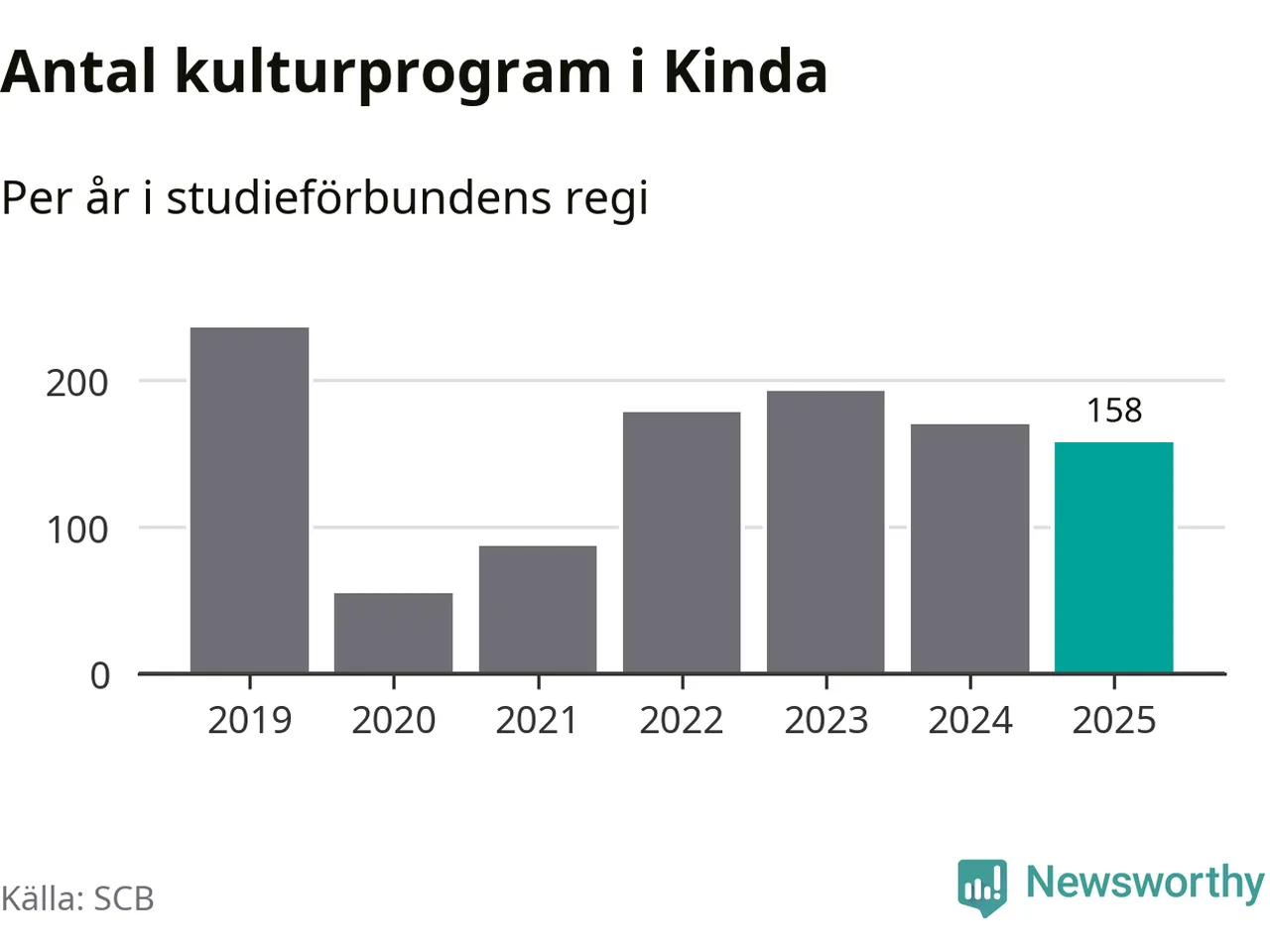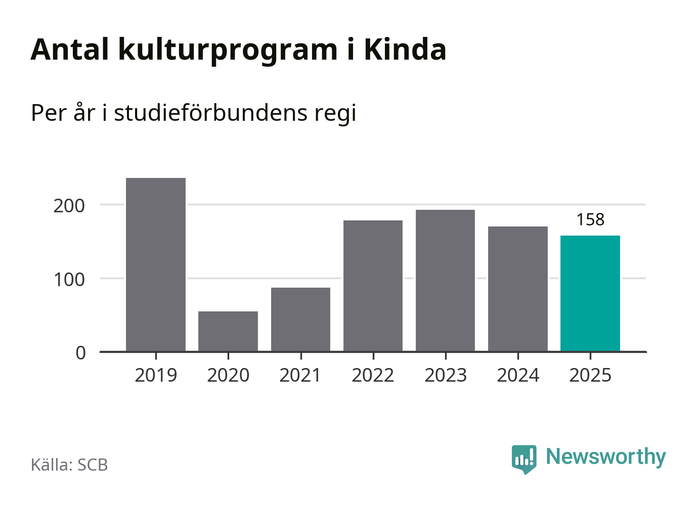 I Kinda är minskningen ännu större: förra året hade studieförbunden omkring 4 400 studietimmar i kommunen, vilket är en minskning med åtta procent jämfört med året innan. Även antalet kulturprogram i studieförbundens regi minskade, från 170 till 158 stycken.