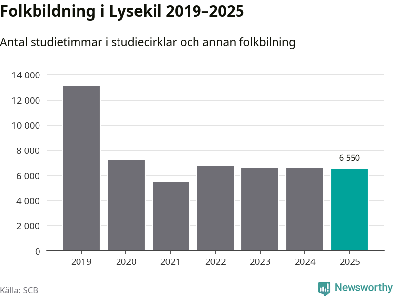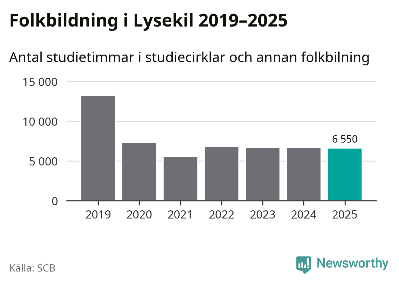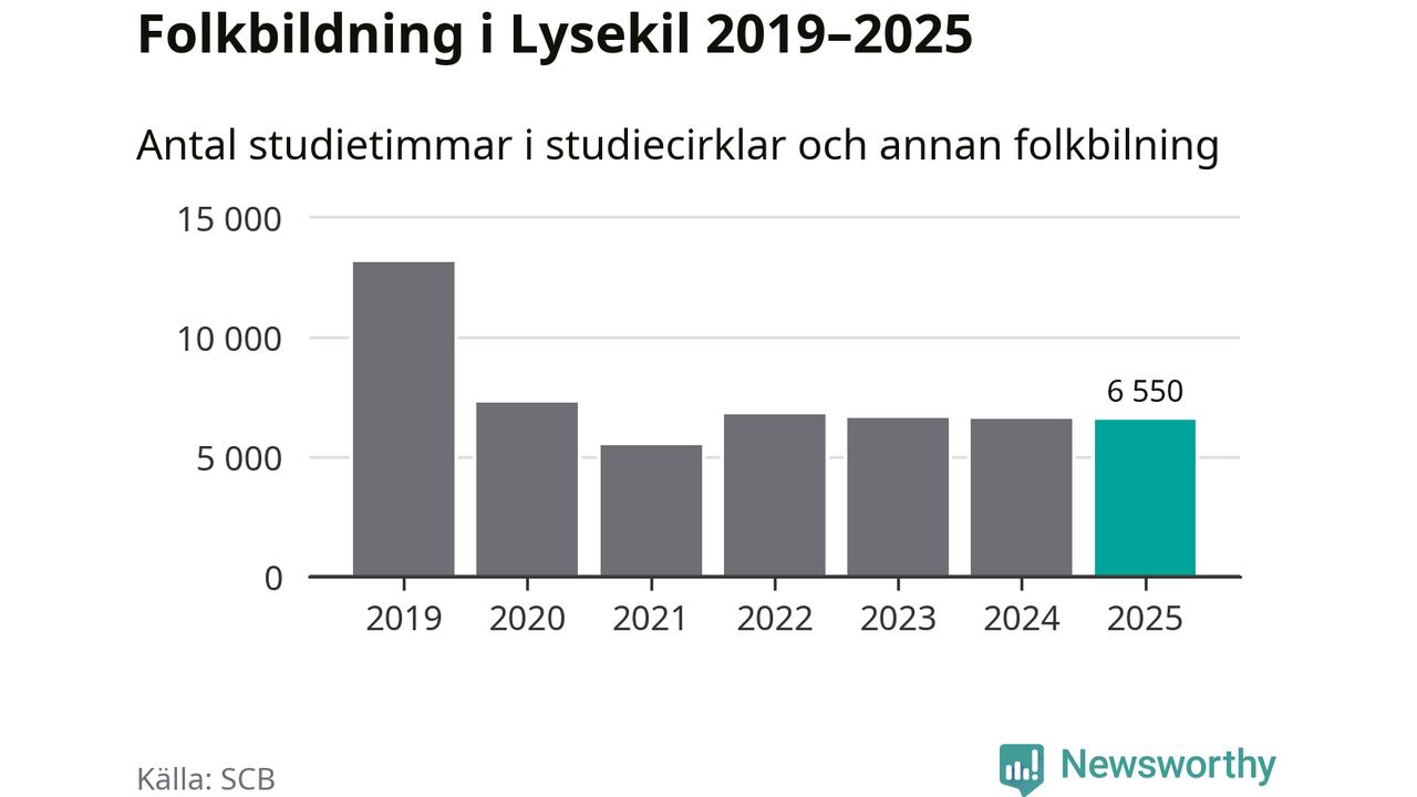 Sju av de studieförbund som 2025 fick bidrag från Folkbildningsrådet har haft någon form av verksamhet – antingen studiecirkel, annan folkbildning eller kulturprogram – i Lysekil under de två senaste åren. Under 2025 ökade Medborgarskolan och ABF antalet studietimmar i kommunen jämfört med året innan, medan tre andra förbund i kommunen noterade färre timmar. Folkuniversitetet har bara arrangerat kulturprogram under 2025. NBV hade ingen verksamhet i kommunen förra året.
