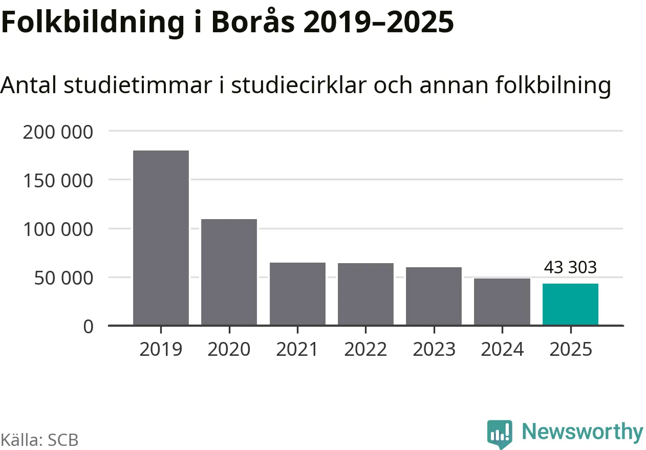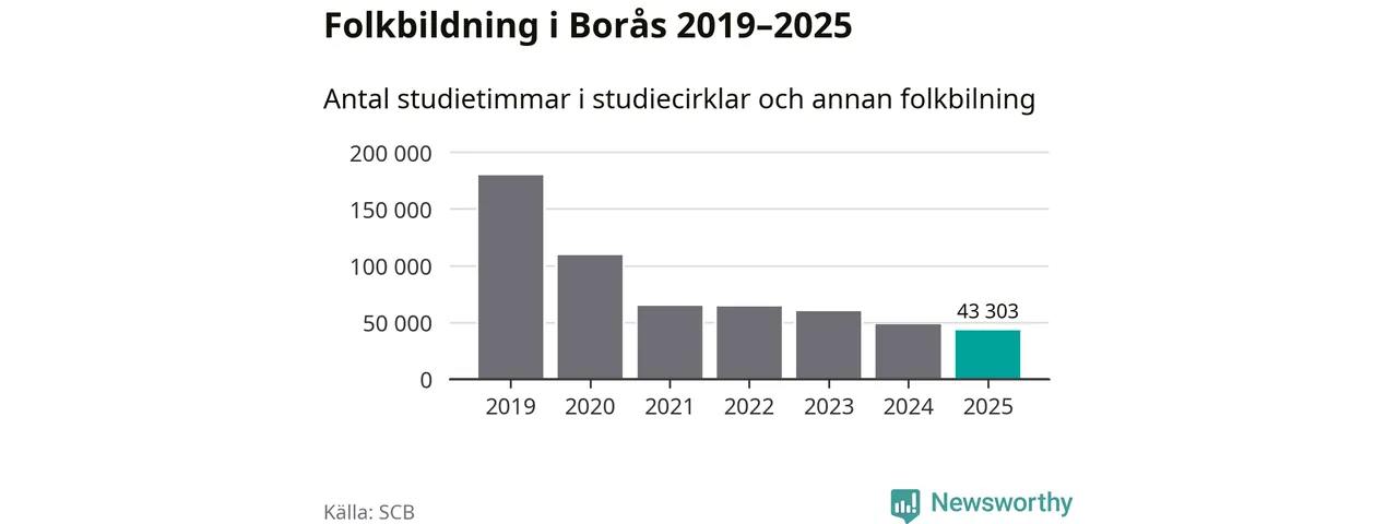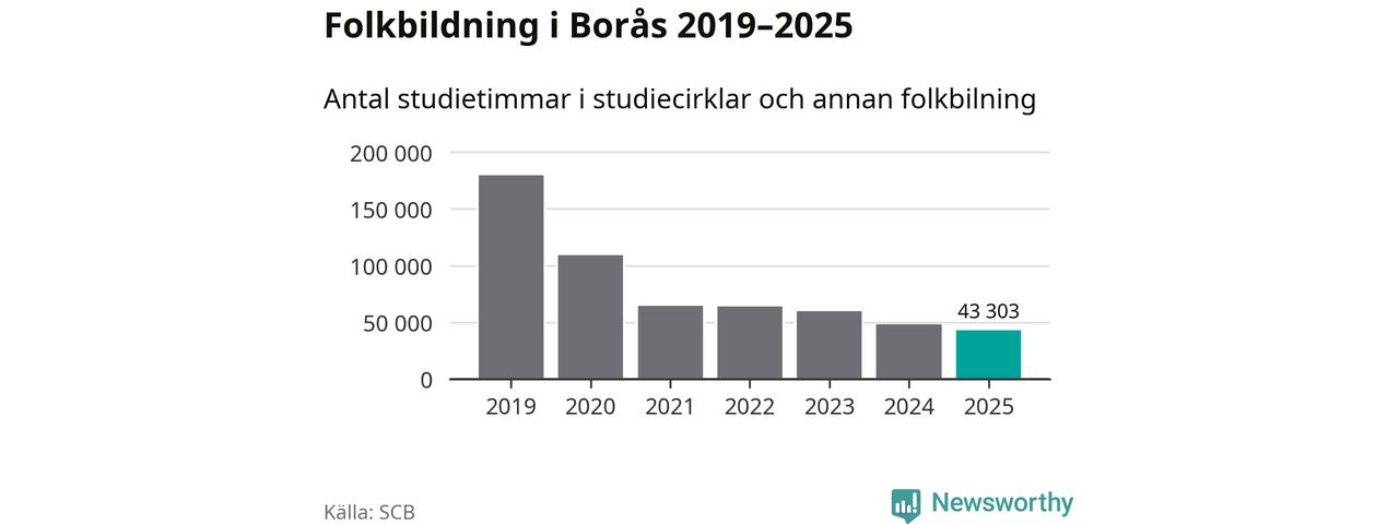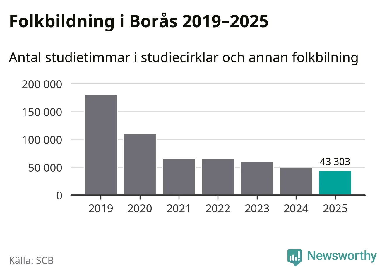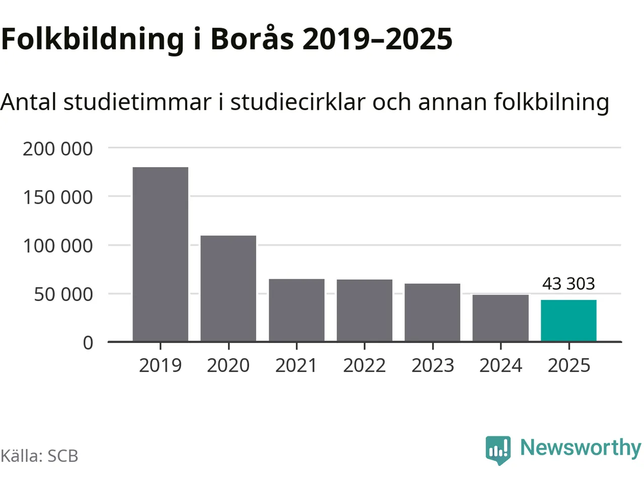 I Borås är minskningen ännu större: förra året hade studieförbunden omkring 43 300 studietimmar i kommunen, vilket är en minskning med elva procent jämfört med året innan. Även antalet kulturprogram i studieförbundens regi minskade, från 1 323 till 1 065 stycken.