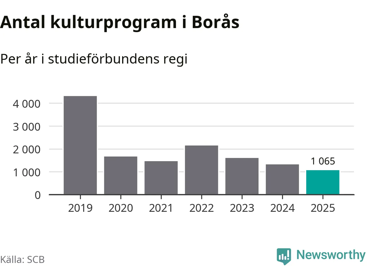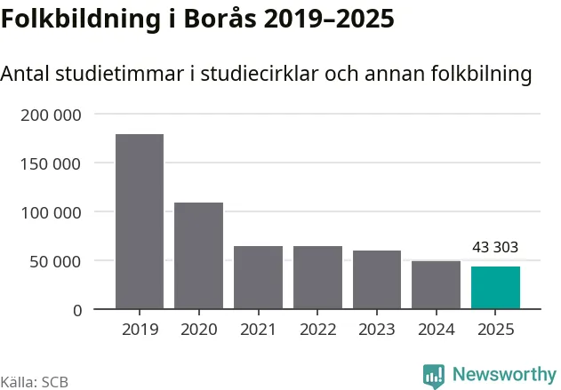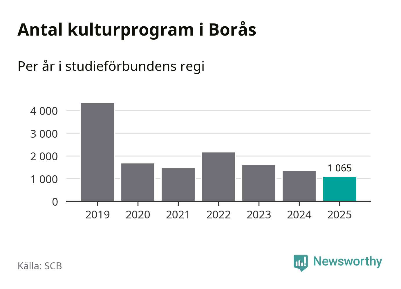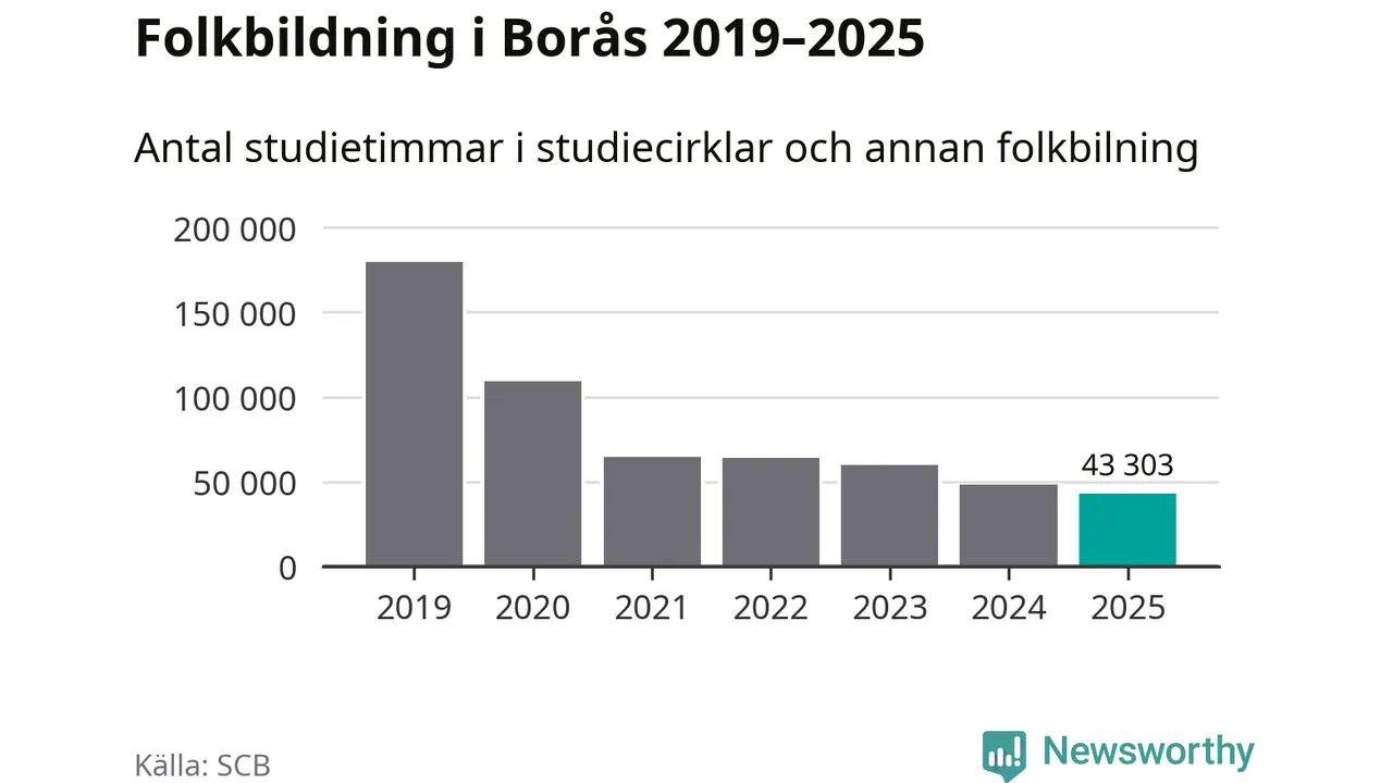 I Borås är minskningen ännu större: förra året hade studieförbunden omkring 43 300 studietimmar i kommunen, vilket är en minskning med elva procent jämfört med året innan. Även antalet kulturprogram i studieförbundens regi minskade, från 1 323 till 1 065 stycken.