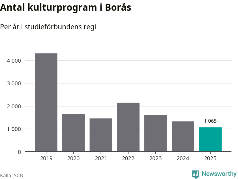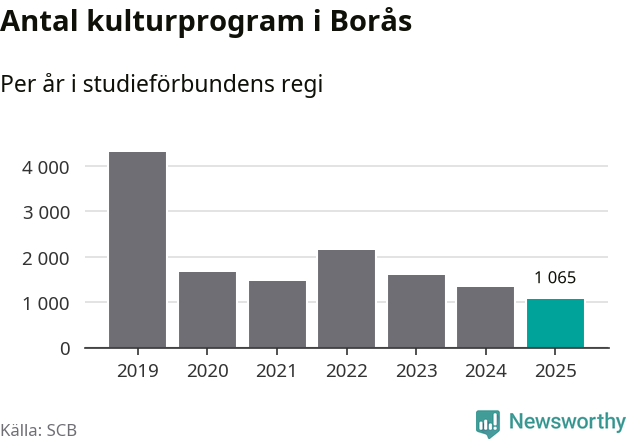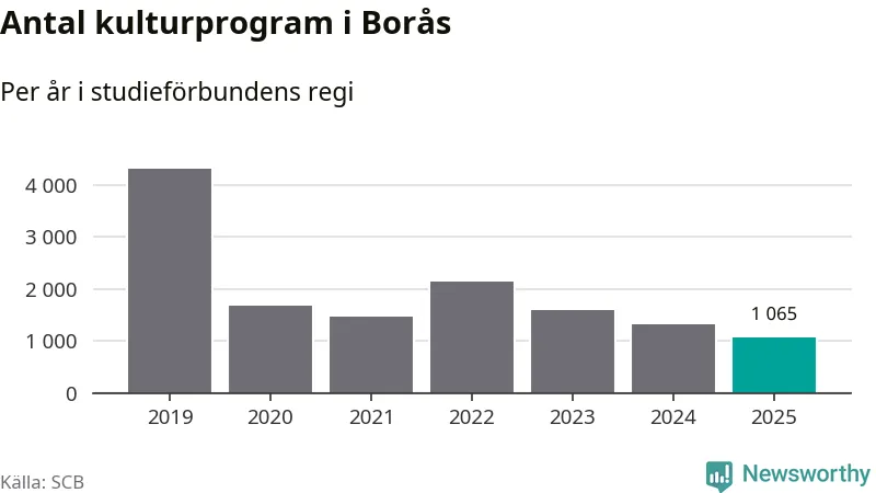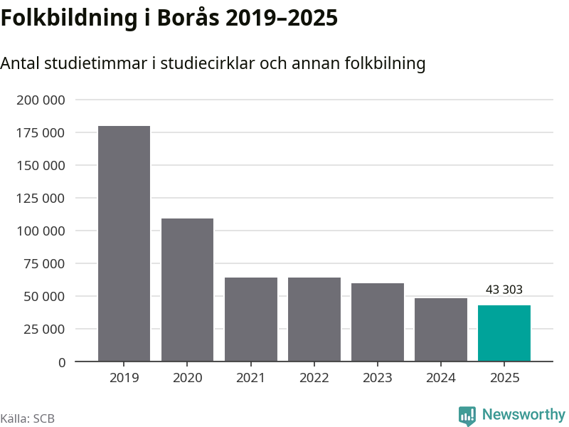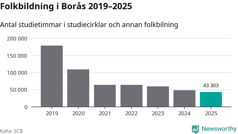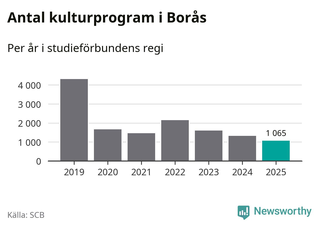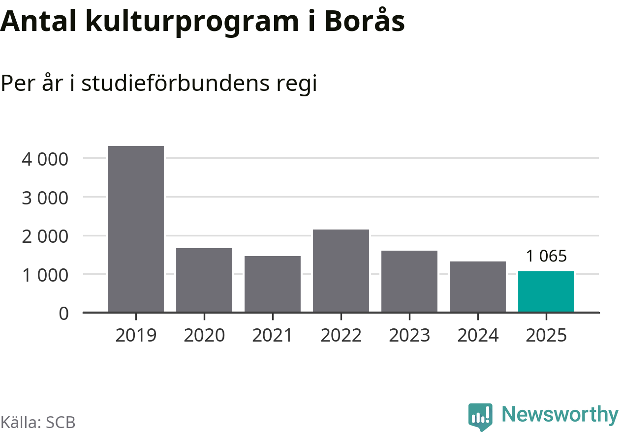 I Borås är minskningen ännu större: förra året hade studieförbunden omkring 43 300 studietimmar i kommunen, vilket är en minskning med elva procent jämfört med året innan. Även antalet kulturprogram i studieförbundens regi minskade, från 1 323 till 1 065 stycken.