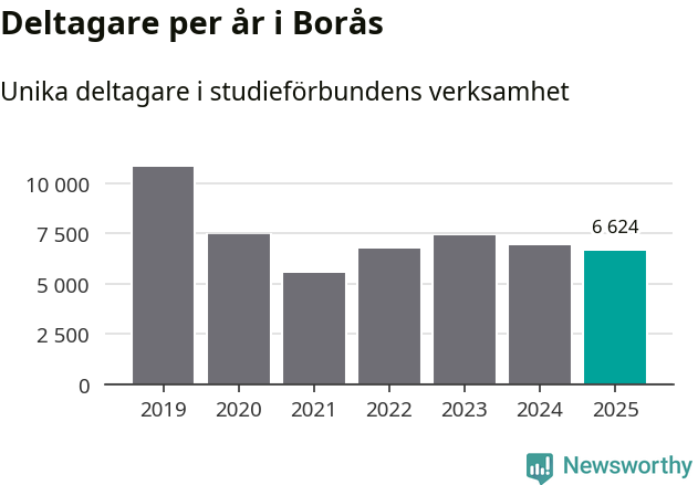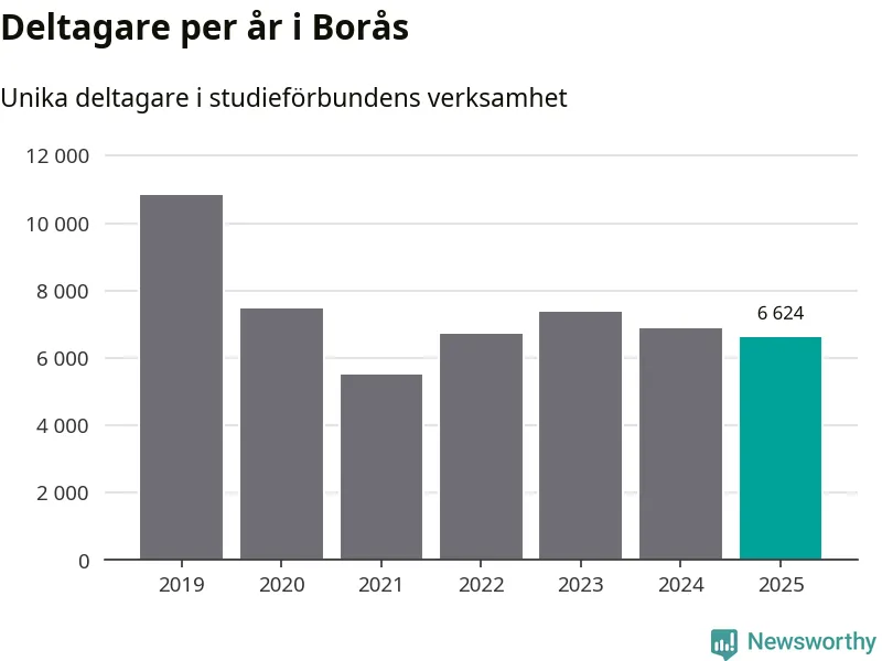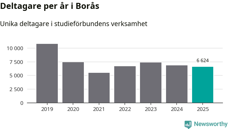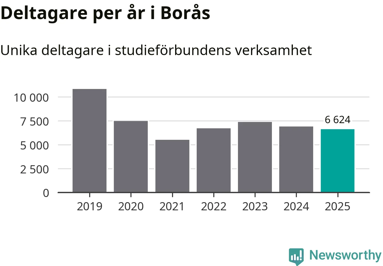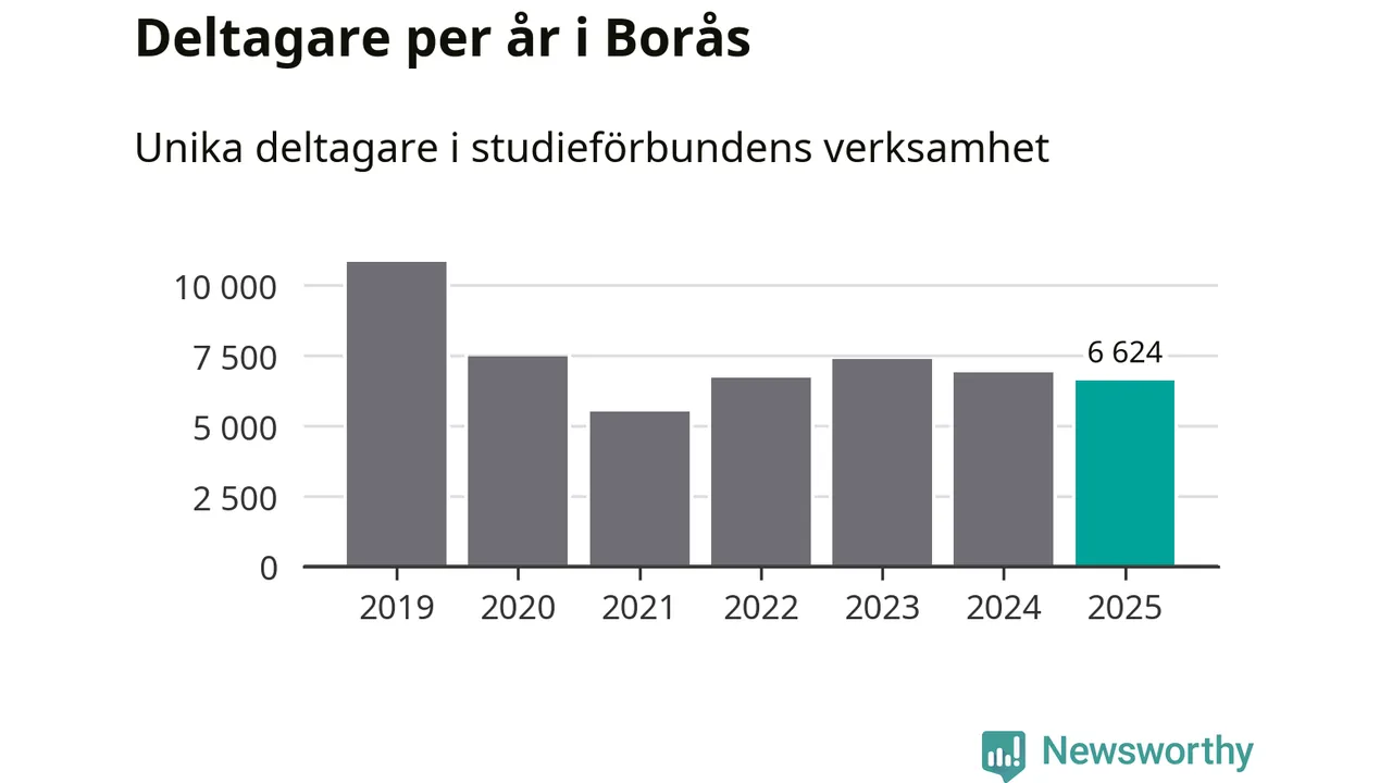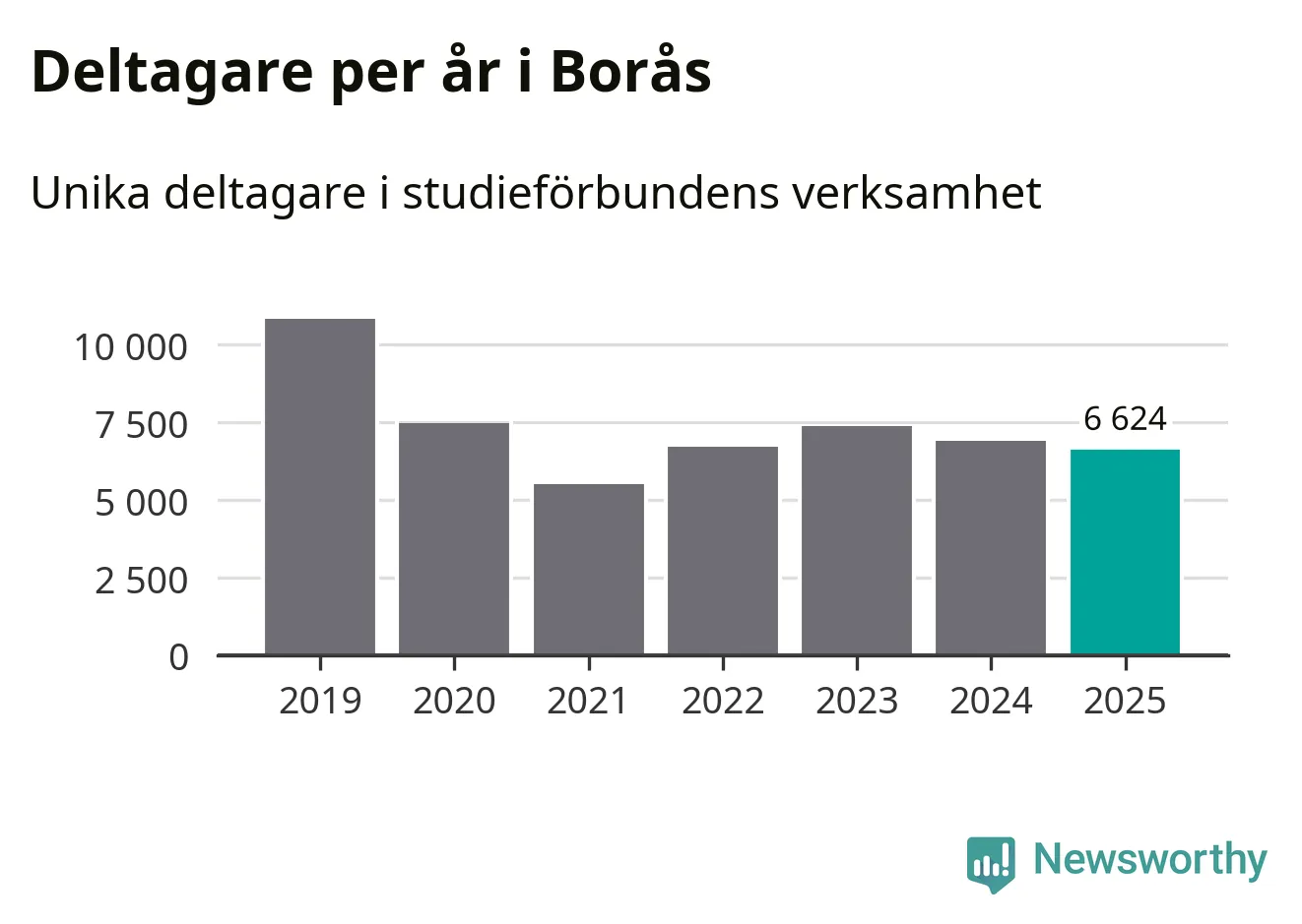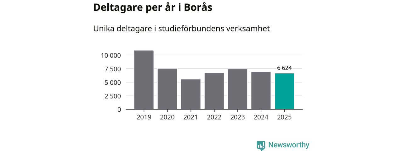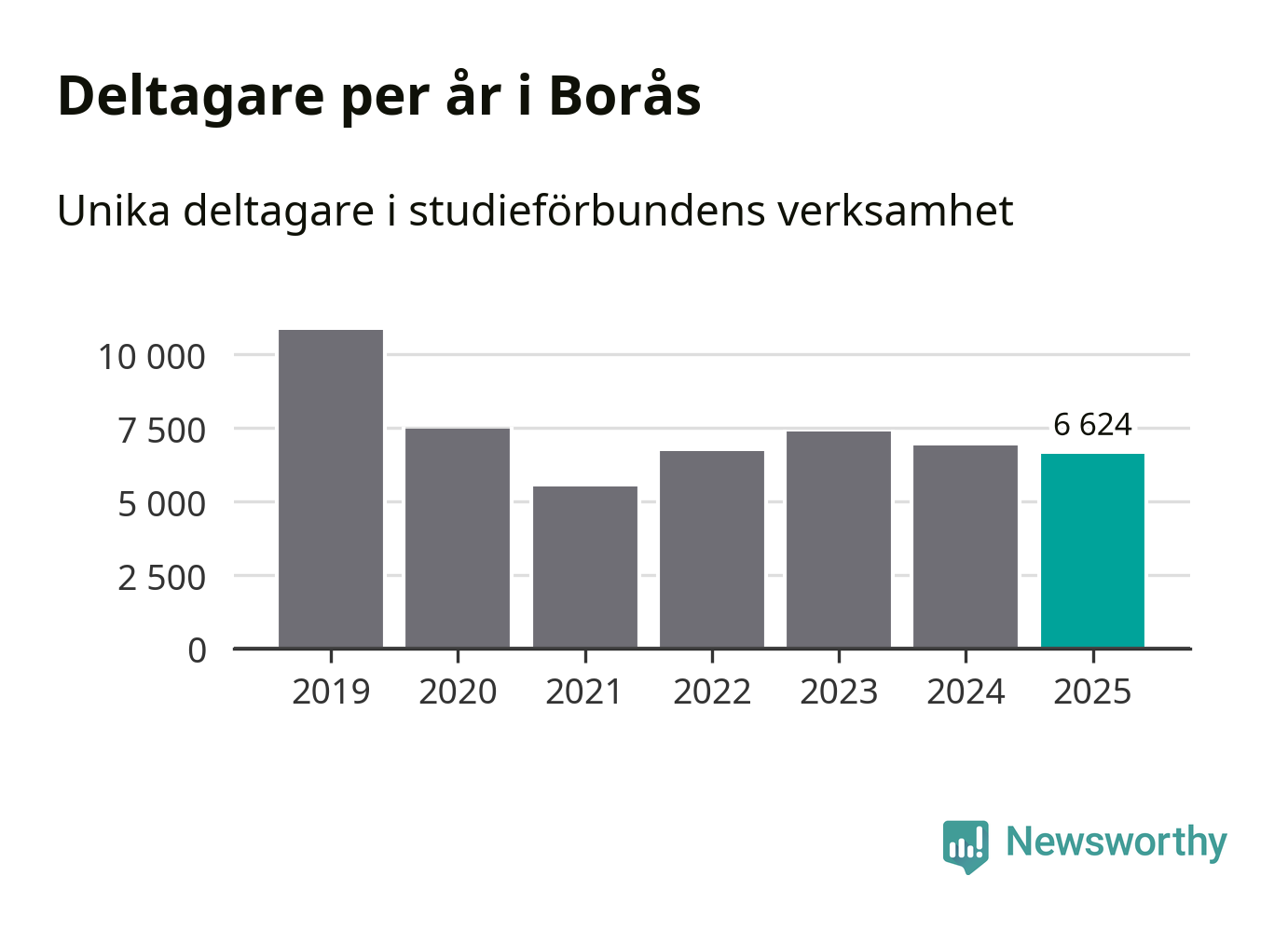 Även sett till unika deltagare är folkbildningen på tillbakagång i Borås. 2025 deltog 6 624 personer i studieförbundens verksamhet, vilket är en minskning med fyra procent jämfört med året innan. Det innebär att sex procent av befolkningen i kommunen deltog i studieförbundens verksamhet under 2025, vilket är ungefär som rikssnittet.