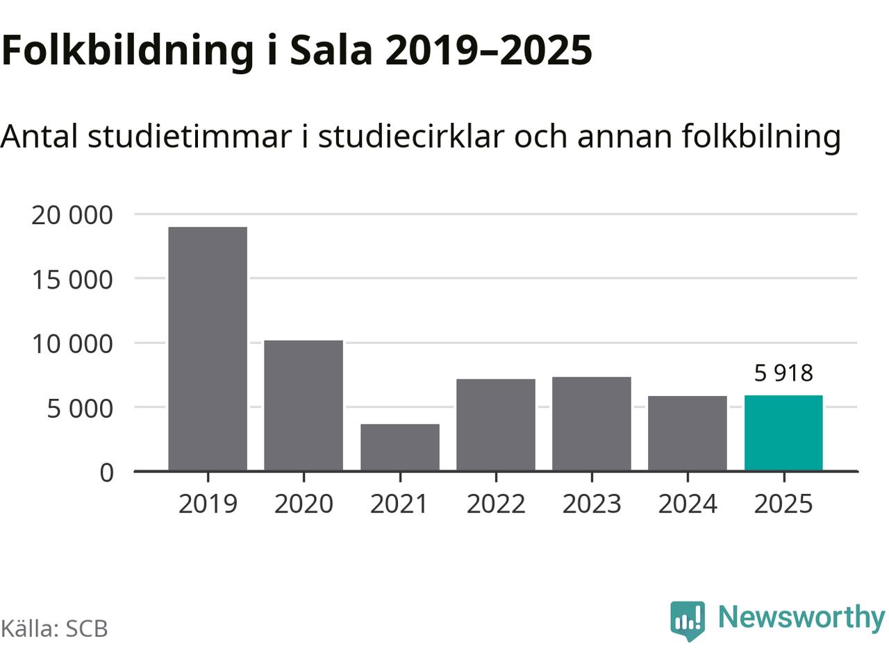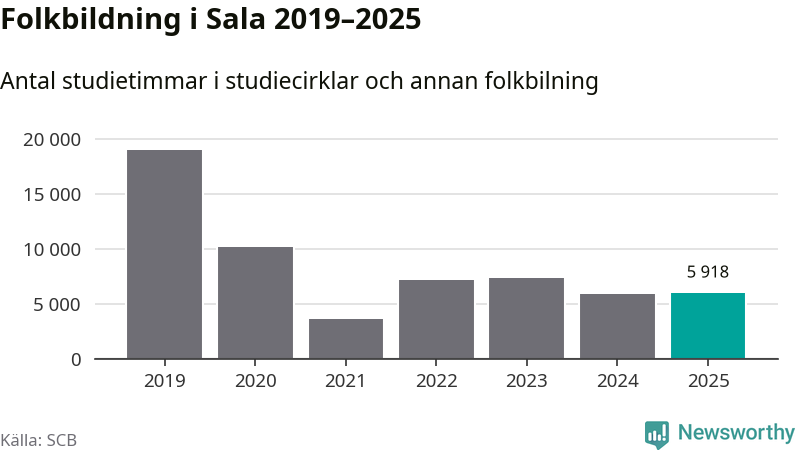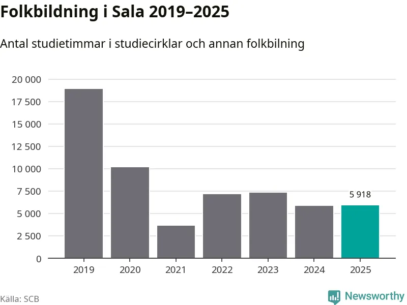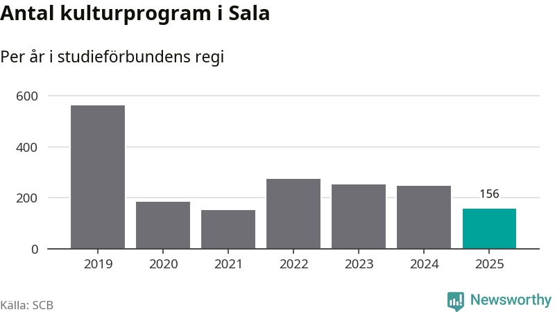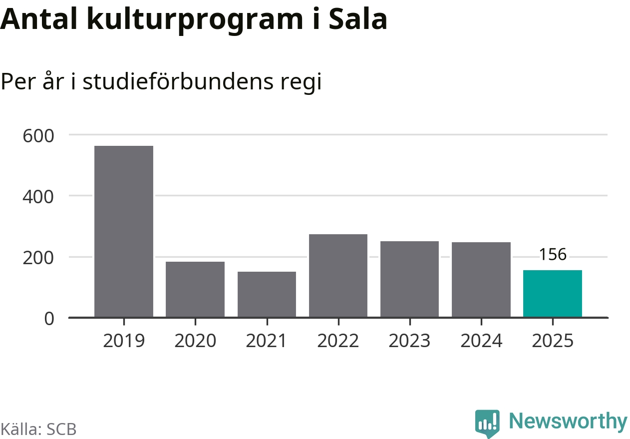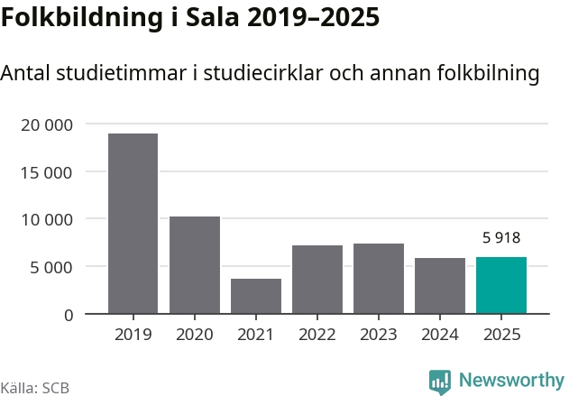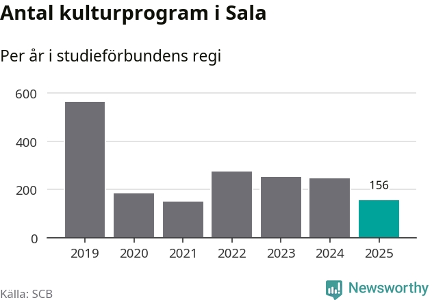 I Sala är antalet studietimmar ungefär lika många som året innan medan antalet kulturarrangemang i studieförbundens regi minskade.