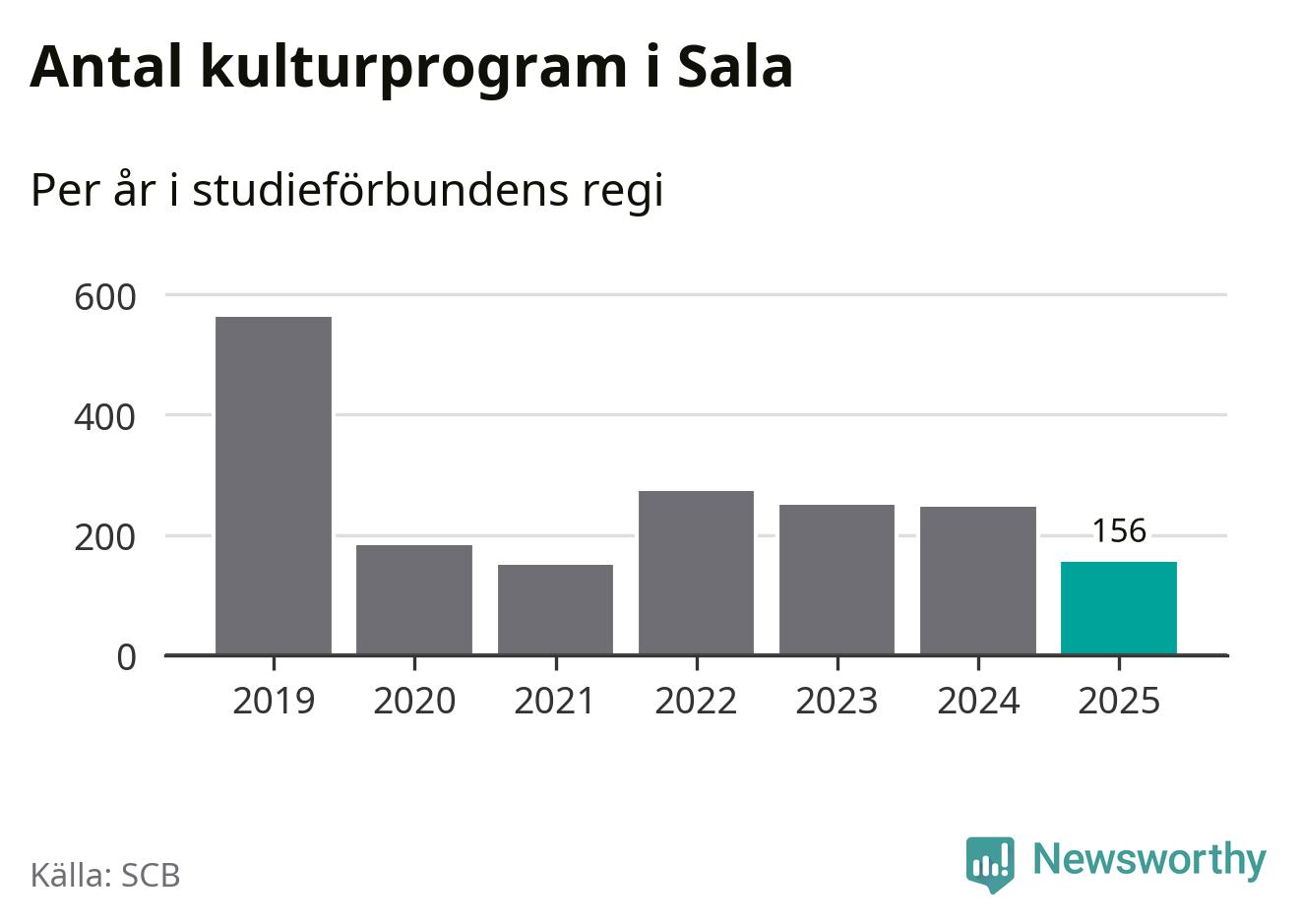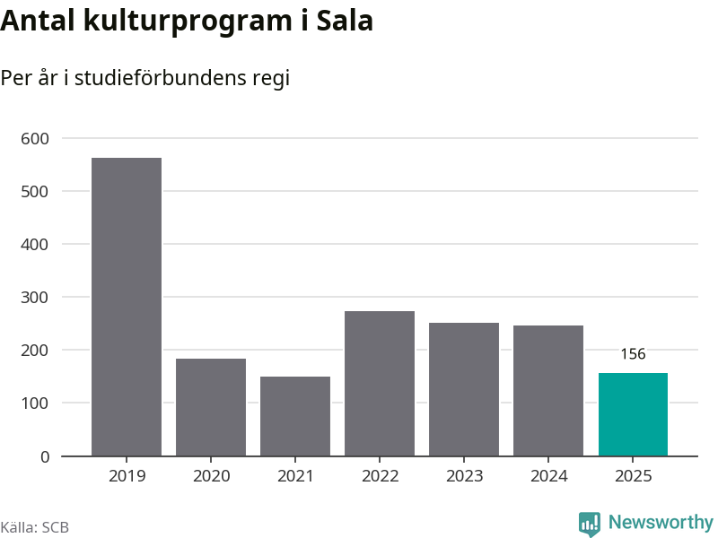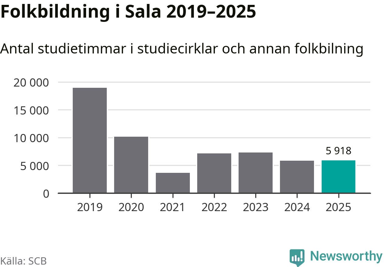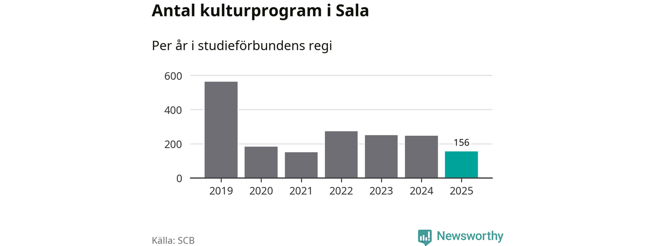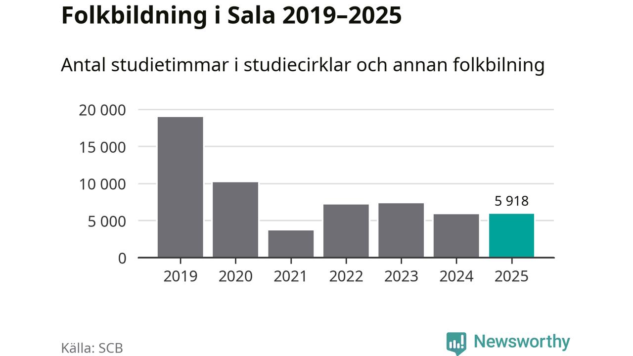 Åtta av de studieförbund som 2025 fick bidrag från Folkbildningsrådet har haft någon form av verksamhet – antingen studiecirkel, annan folkbildning eller kulturprogram – i Sala under de två senaste åren. Under 2025 ökade fem förbund antalet studietimmar i kommunen jämfört med året innan, medan de tre andra förbunden i kommunen noterade färre timmar.