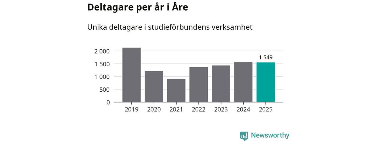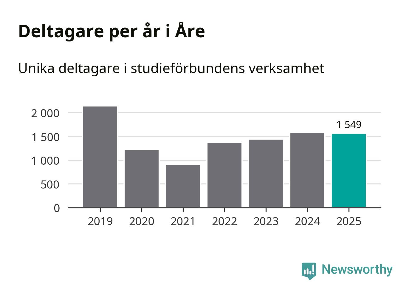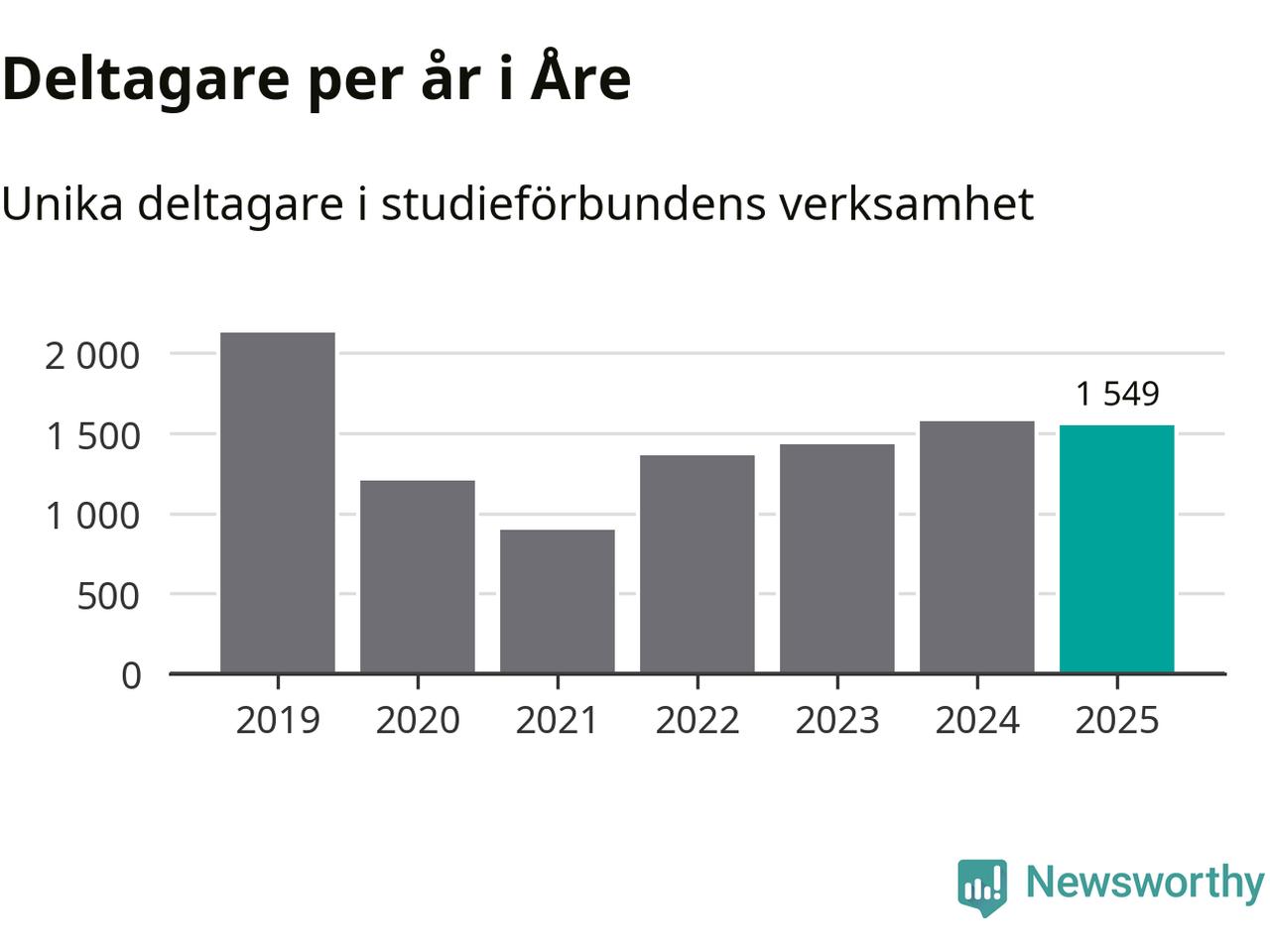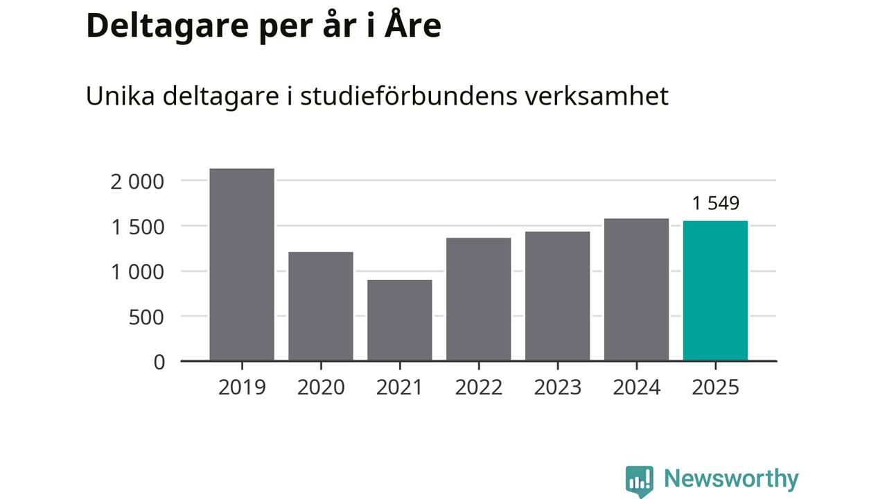 Drygt 1 500 Årebor deltog i någon form av folkbildning under 2025, vilket är ungefär lika många som året innan. Det innebär att tolv procent av befolkningen i kommunen deltog i studieförbundens verksamhet under 2025. Det är den näst högsta andelen i Jämtland.