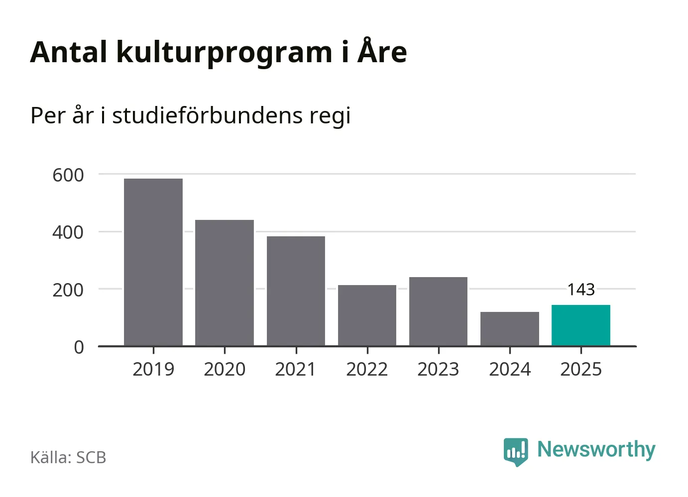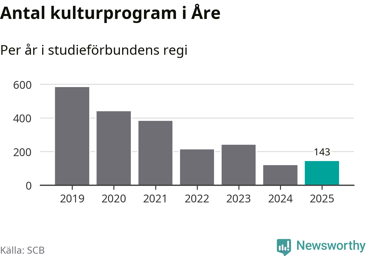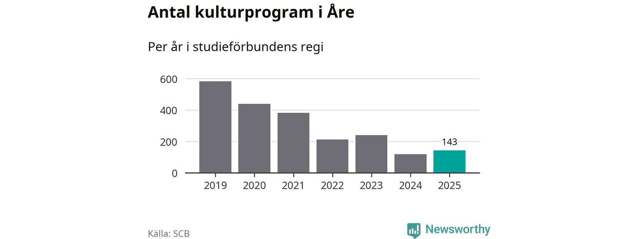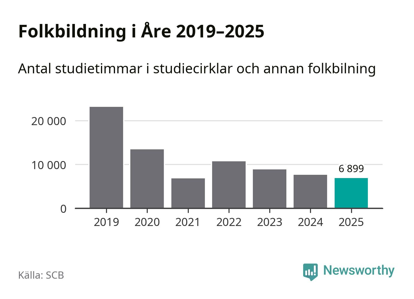 Drygt 1 500 Årebor deltog i någon form av folkbildning under 2025, vilket är ungefär lika många som året innan. Det innebär att tolv procent av befolkningen i kommunen deltog i studieförbundens verksamhet under 2025. Det är den näst högsta andelen i Jämtland.
