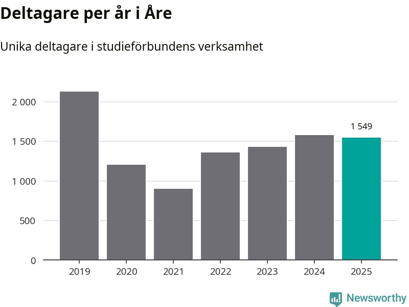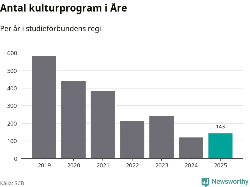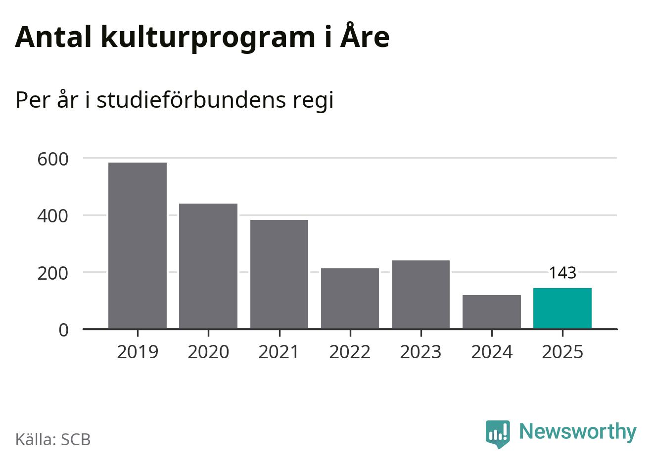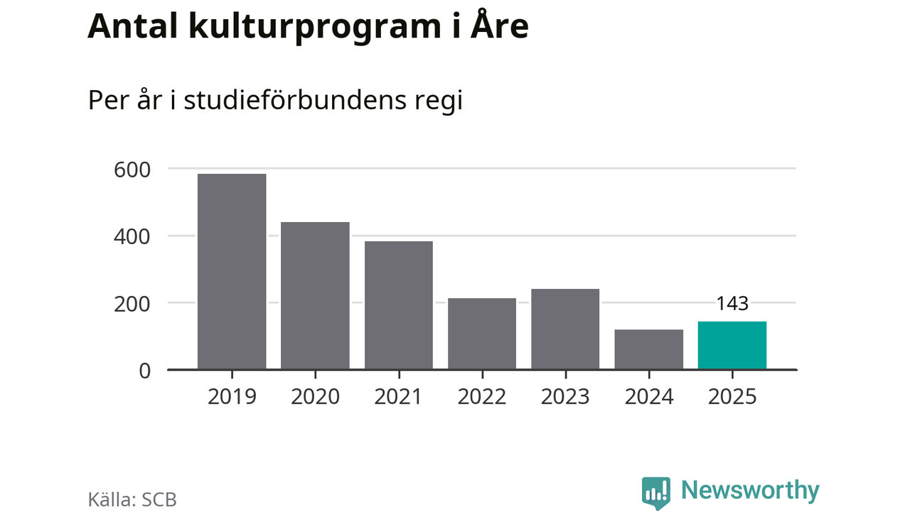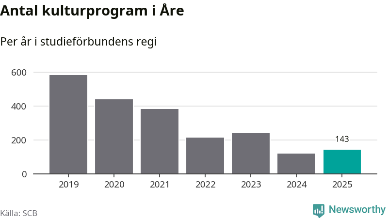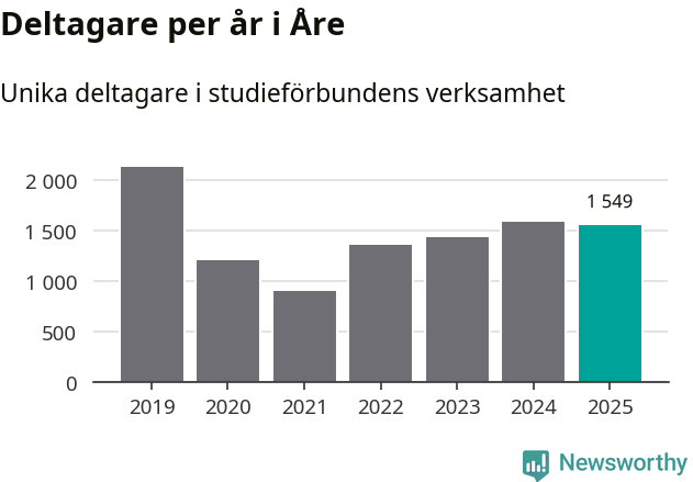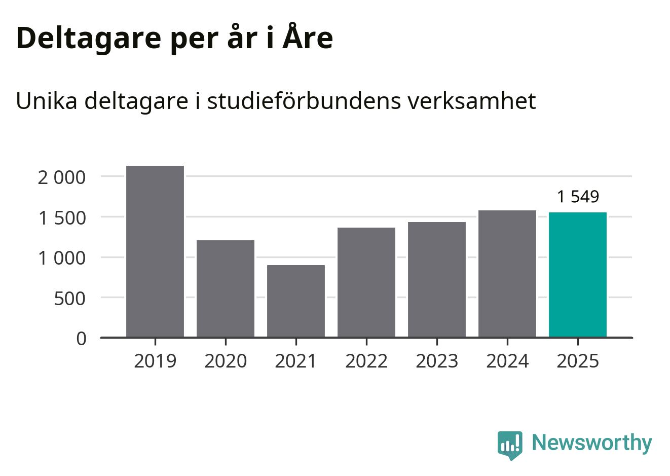 Drygt 1 500 Årebor deltog i någon form av folkbildning under 2025, vilket är ungefär lika många som året innan. Det innebär att tolv procent av befolkningen i kommunen deltog i studieförbundens verksamhet under 2025. Det är den näst högsta andelen i Jämtland.