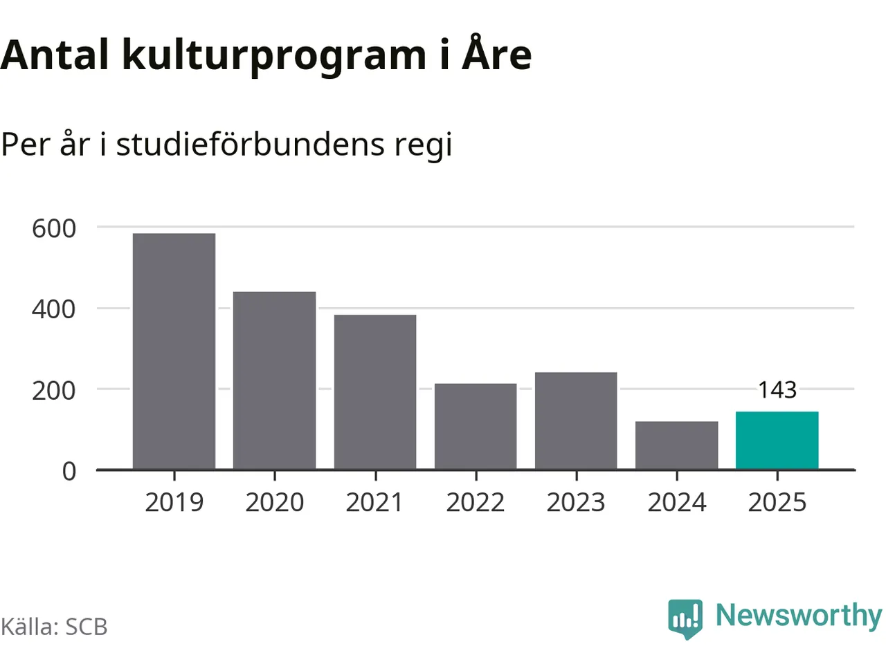 I Åre är minskningen ännu större: förra året hade studieförbunden omkring 6 900 studietimmar i kommunen, vilket är en minskning med tio procent jämfört med året innan. Men medan studiecirklar och annan folkbildningsverksamhet minskade ökade faktiskt antalet kulturarrangemang i studieförbundens regi från 120 till omkring 140.