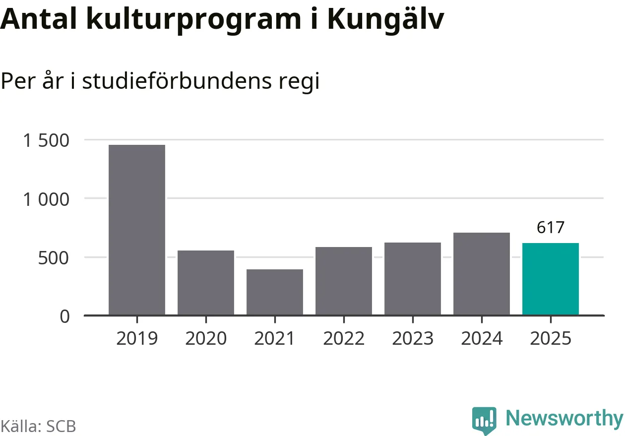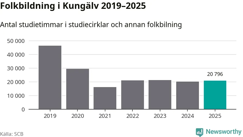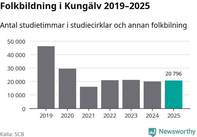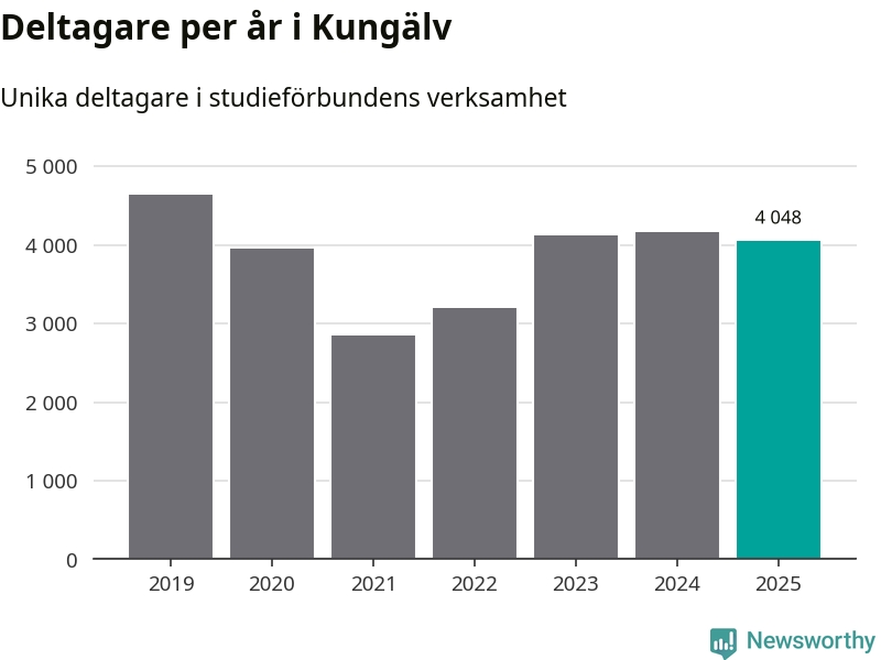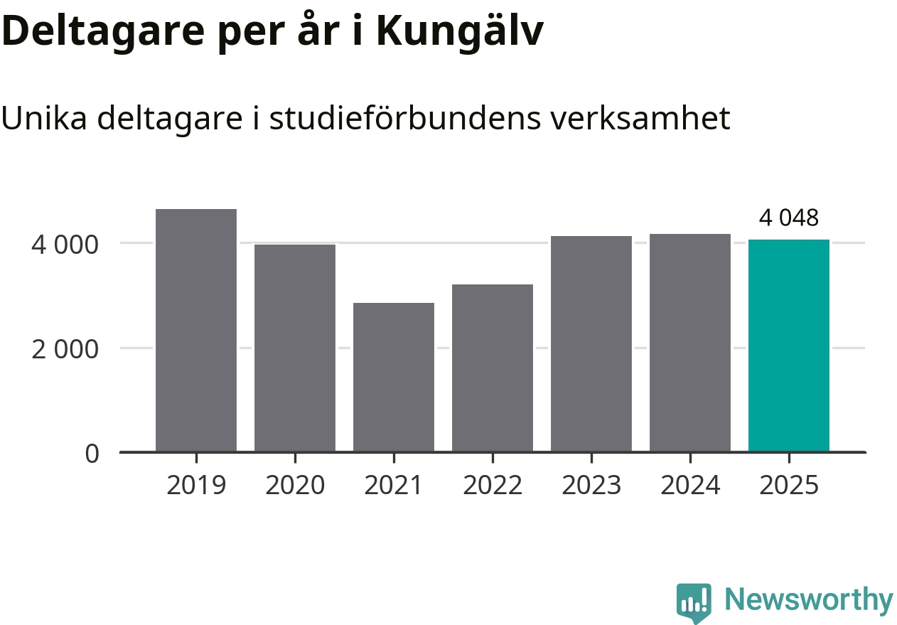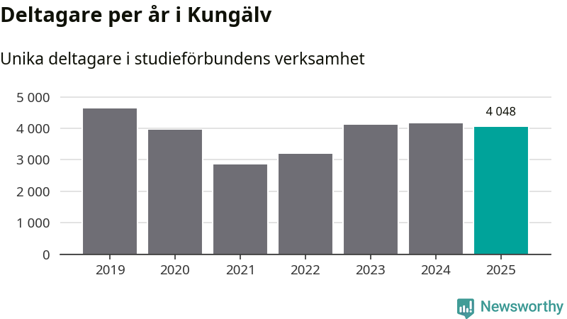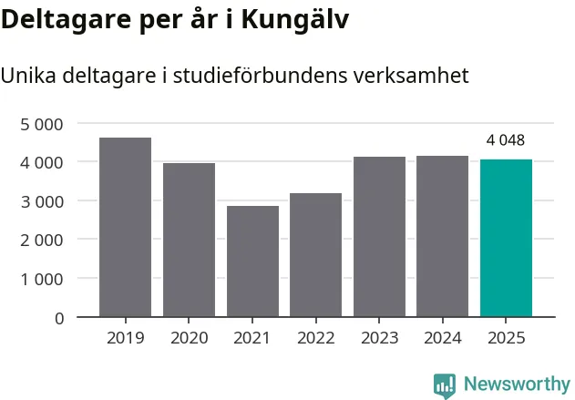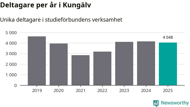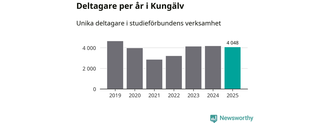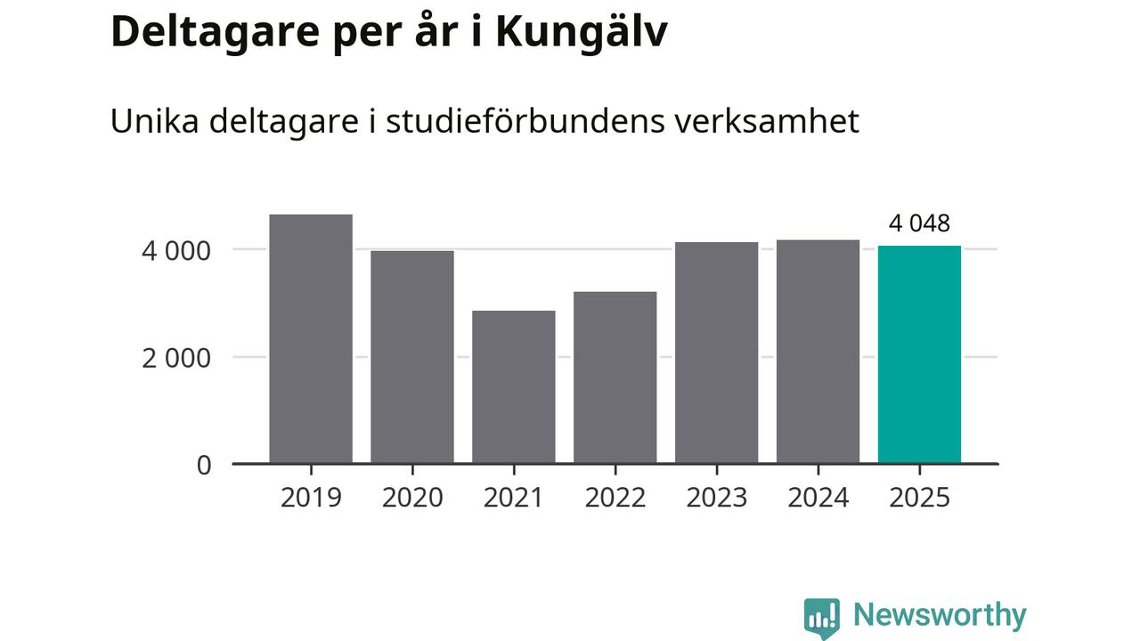 Sett till unika deltagare är folkbildningen på tillbakagång i Kungälv. 2025 deltog 4 048 personer i studieförbundens verksamhet, vilket är en minskning med tre procent jämfört med året innan. Det innebär att åtta procent av befolkningen i kommunen deltog i studieförbundens verksamhet under 2025, vilket är högre än rikssnittet.