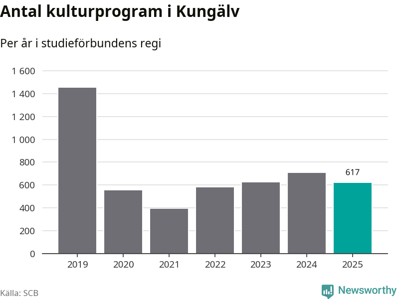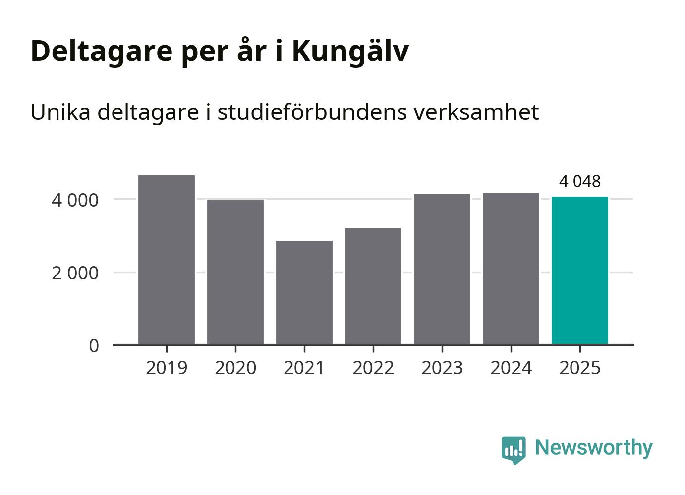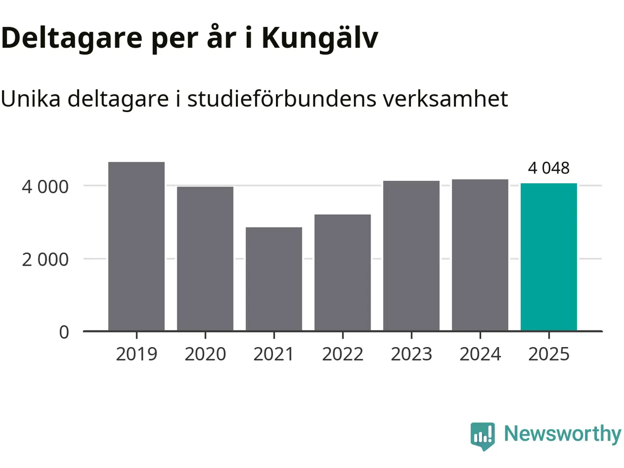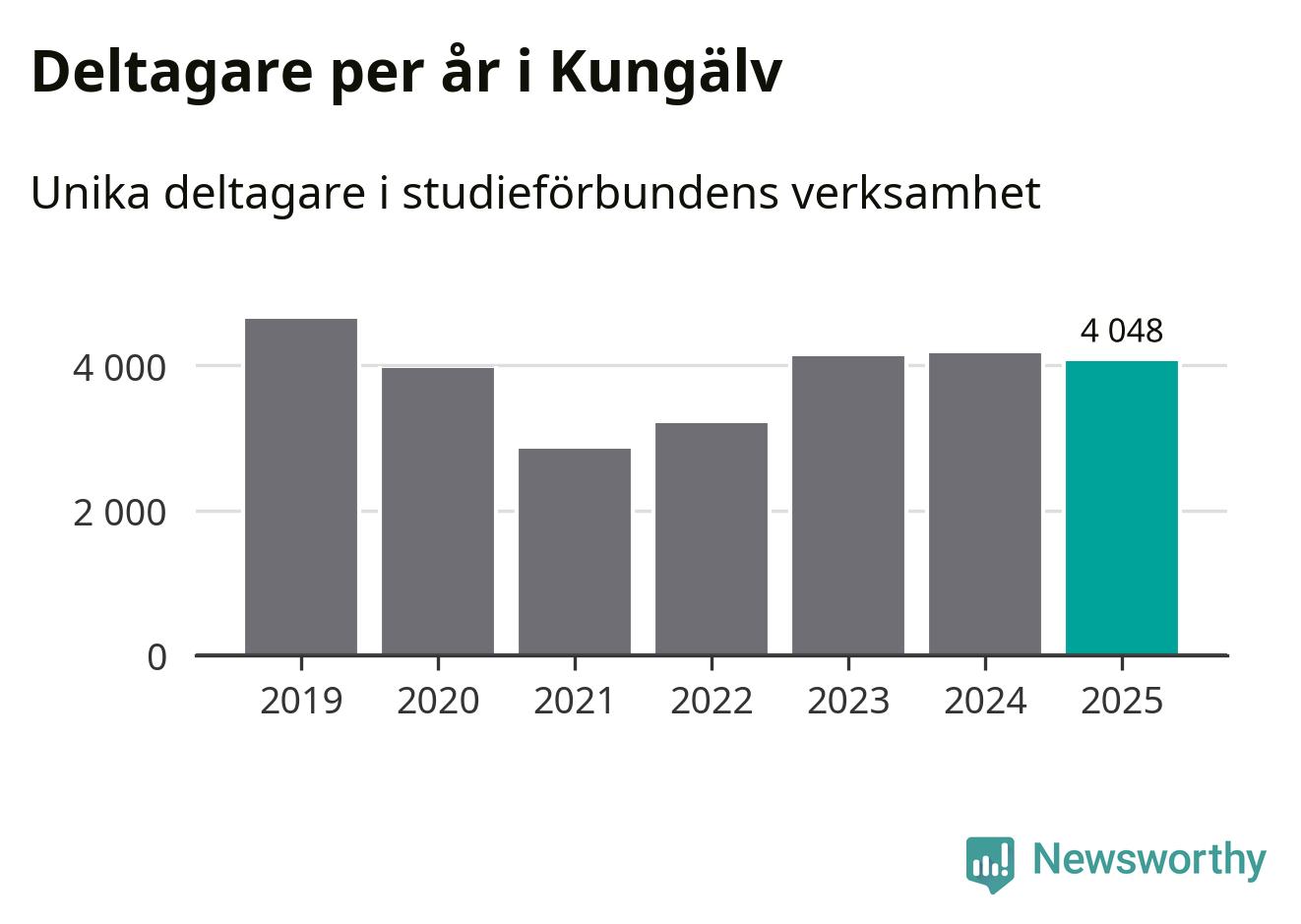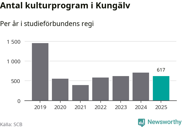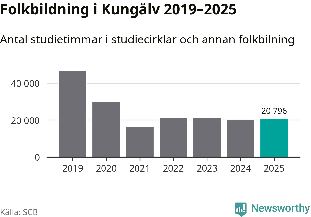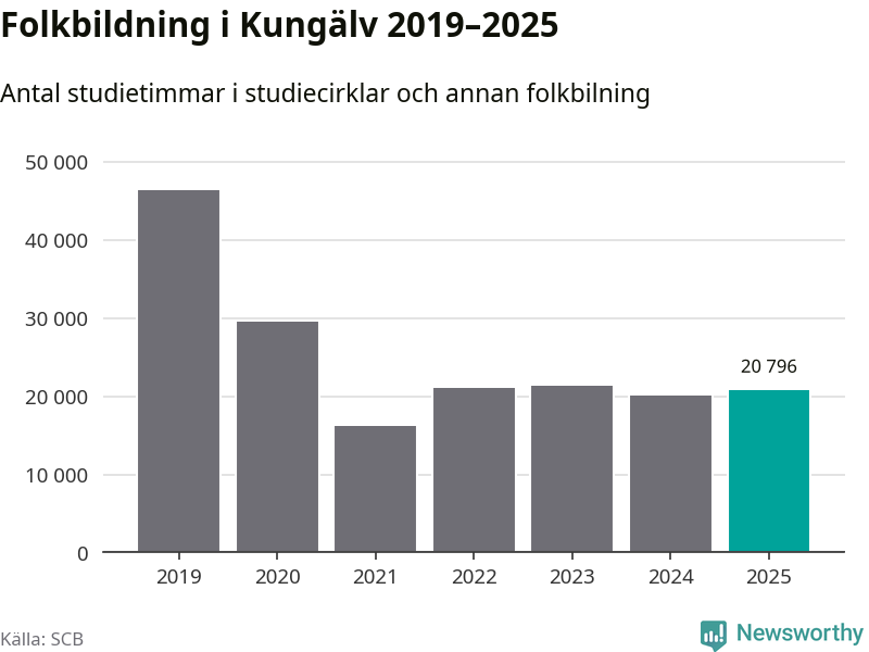 Sett till unika deltagare är folkbildningen på tillbakagång i Kungälv. 2025 deltog 4 048 personer i studieförbundens verksamhet, vilket är en minskning med tre procent jämfört med året innan. Det innebär att åtta procent av befolkningen i kommunen deltog i studieförbundens verksamhet under 2025, vilket är högre än rikssnittet.