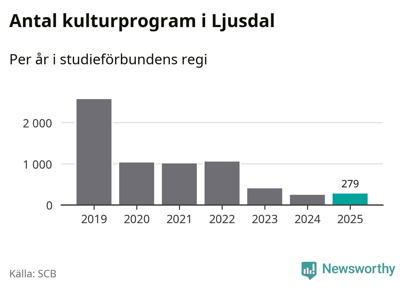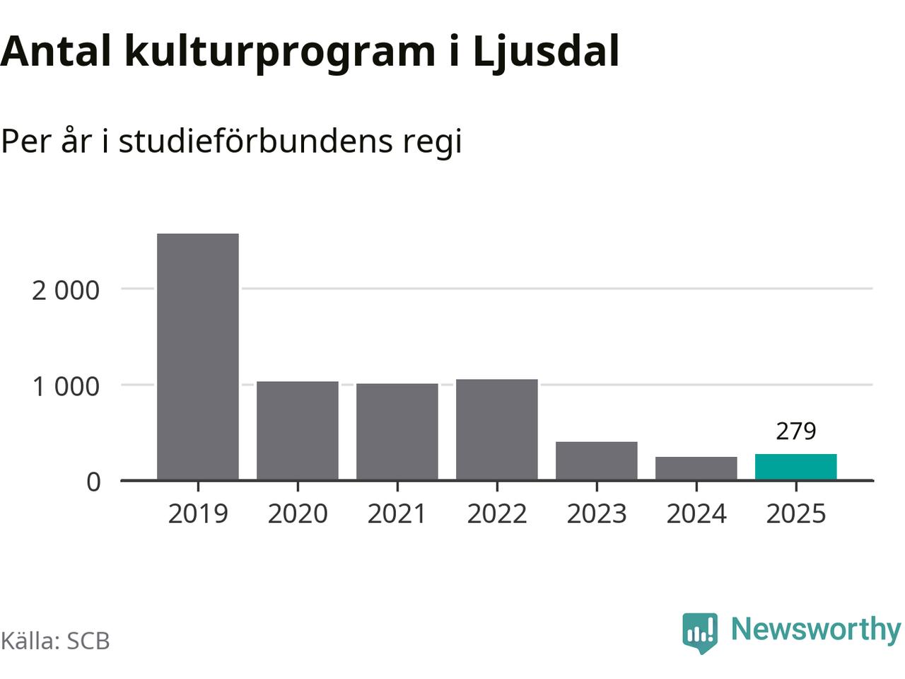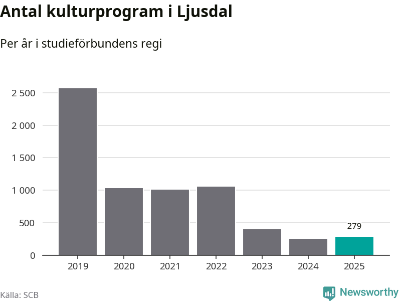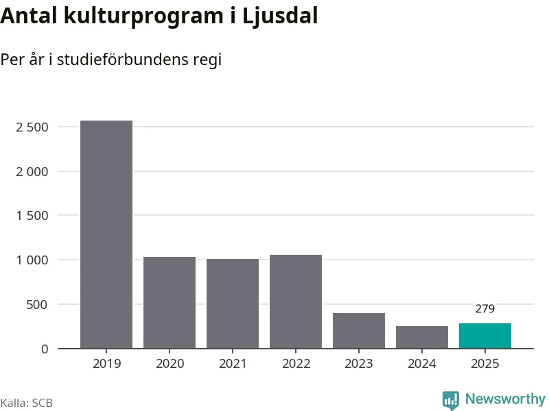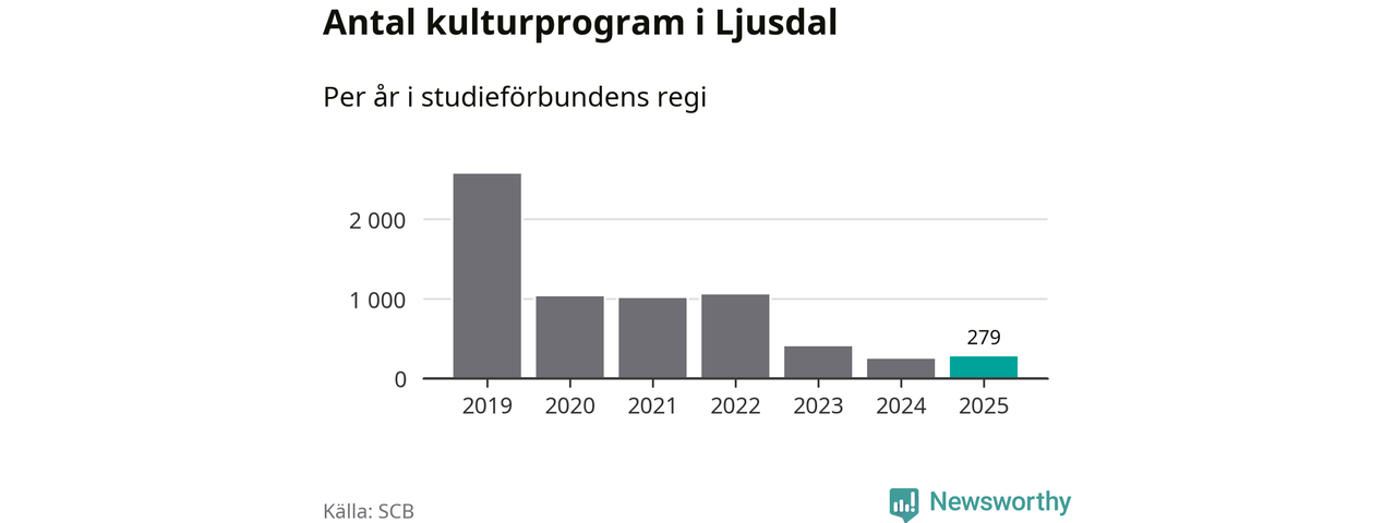 Sex av de studieförbund som 2025 fick bidrag från Folkbildningsrådet har haft någon form av verksamhet – antingen studiecirkel, annan folkbildning eller kulturprogram – i Ljusdal under de två senaste åren. Under 2025 ökade ABF och Bilda antalet studietimmar i kommunen jämfört med året innan, medan Studiefrämjandet och Studieförbundet Vuxenskolan noterade färre timmar. NBV har bara arrangerat kulturprogram under 2025.