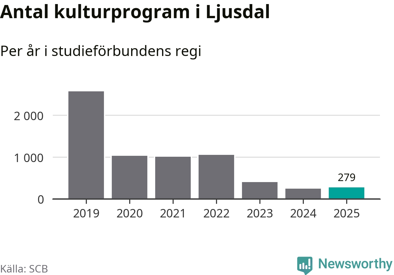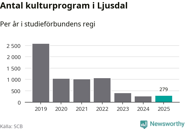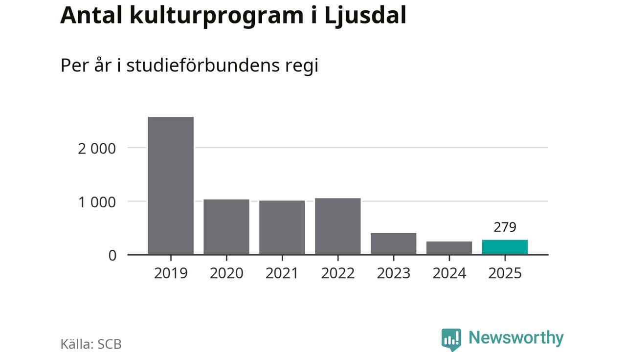 Utvecklingen ser ungefär likadan ut i Ljusdal, förra året hade studieförbunden omkring 5 100 studietimmar i kommunen jämfört med omkring 5 400 året innan, en minskning med fem procent. Men medan studiecirklar och annan folkbildningsverksamhet minskade ökade faktiskt antalet kulturarrangemang i studieförbundens regi från omkring 250 till omkring 280.