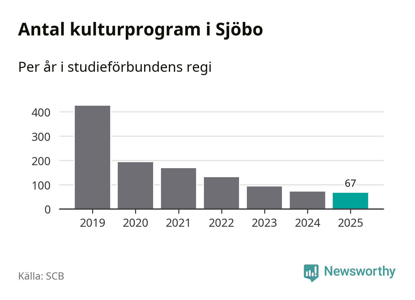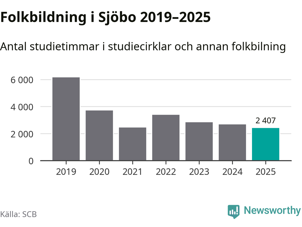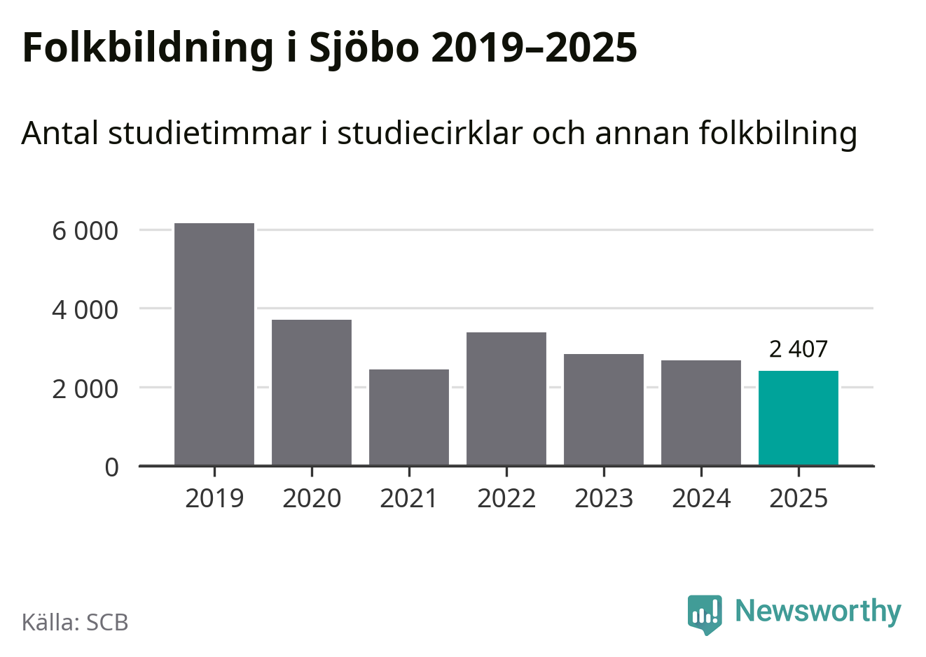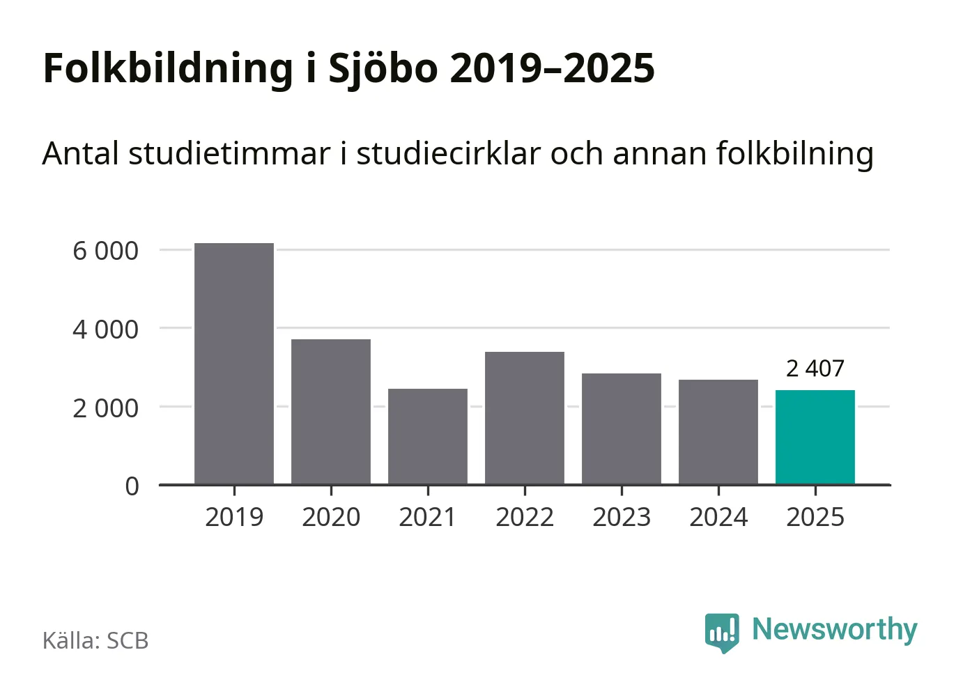 Även sett till unika deltagare är folkbildningen på tillbakagång i Sjöbo. 2025 deltog 760 personer i studieförbundens verksamhet, vilket är en minskning med tio procent jämfört med året innan. Det innebär att fyra procent av befolkningen i kommunen deltog i studieförbundens verksamhet under 2025, vilket är ungefär som rikssnittet.
