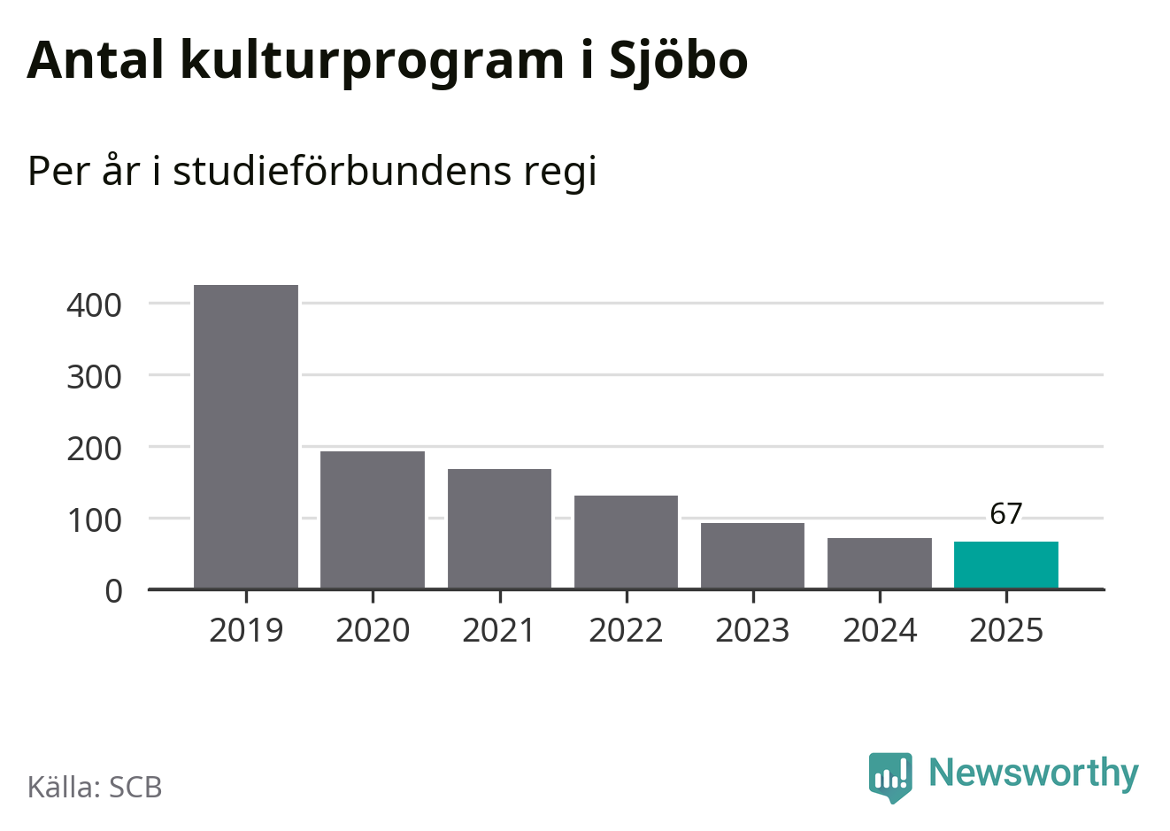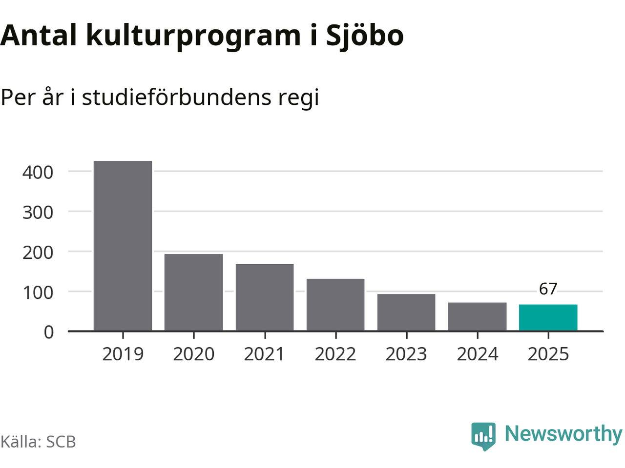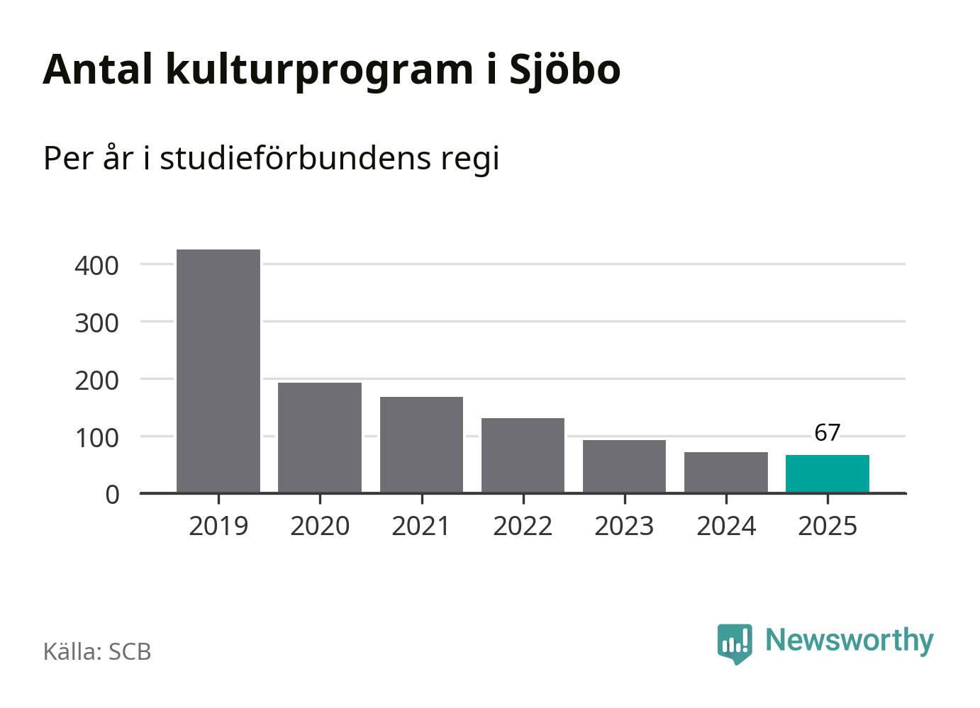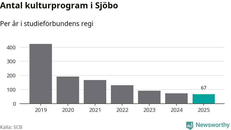 I Sjöbo är minskningen ännu större: förra året hade studieförbunden omkring 2 400 studietimmar i kommunen, vilket är en minskning med tio procent jämfört med året innan. Även antalet kulturprogram i studieförbundens regi minskade, från 72 till 67 stycken.