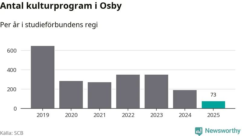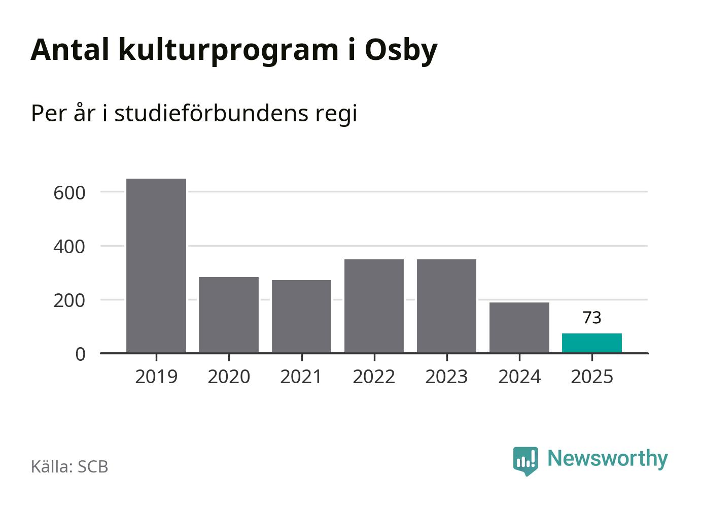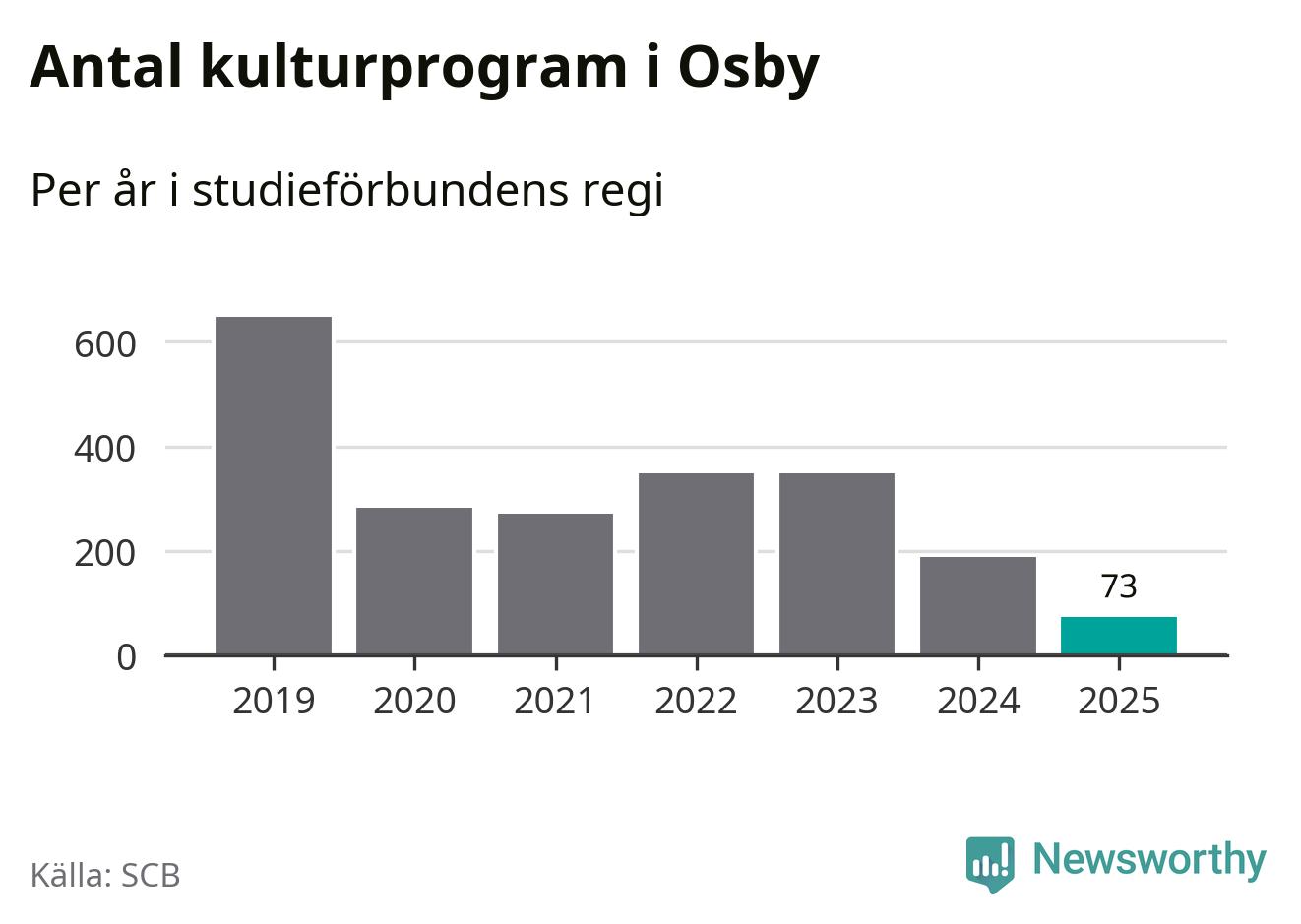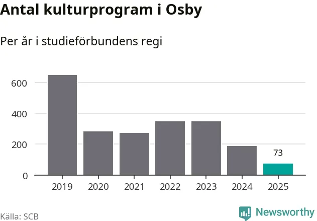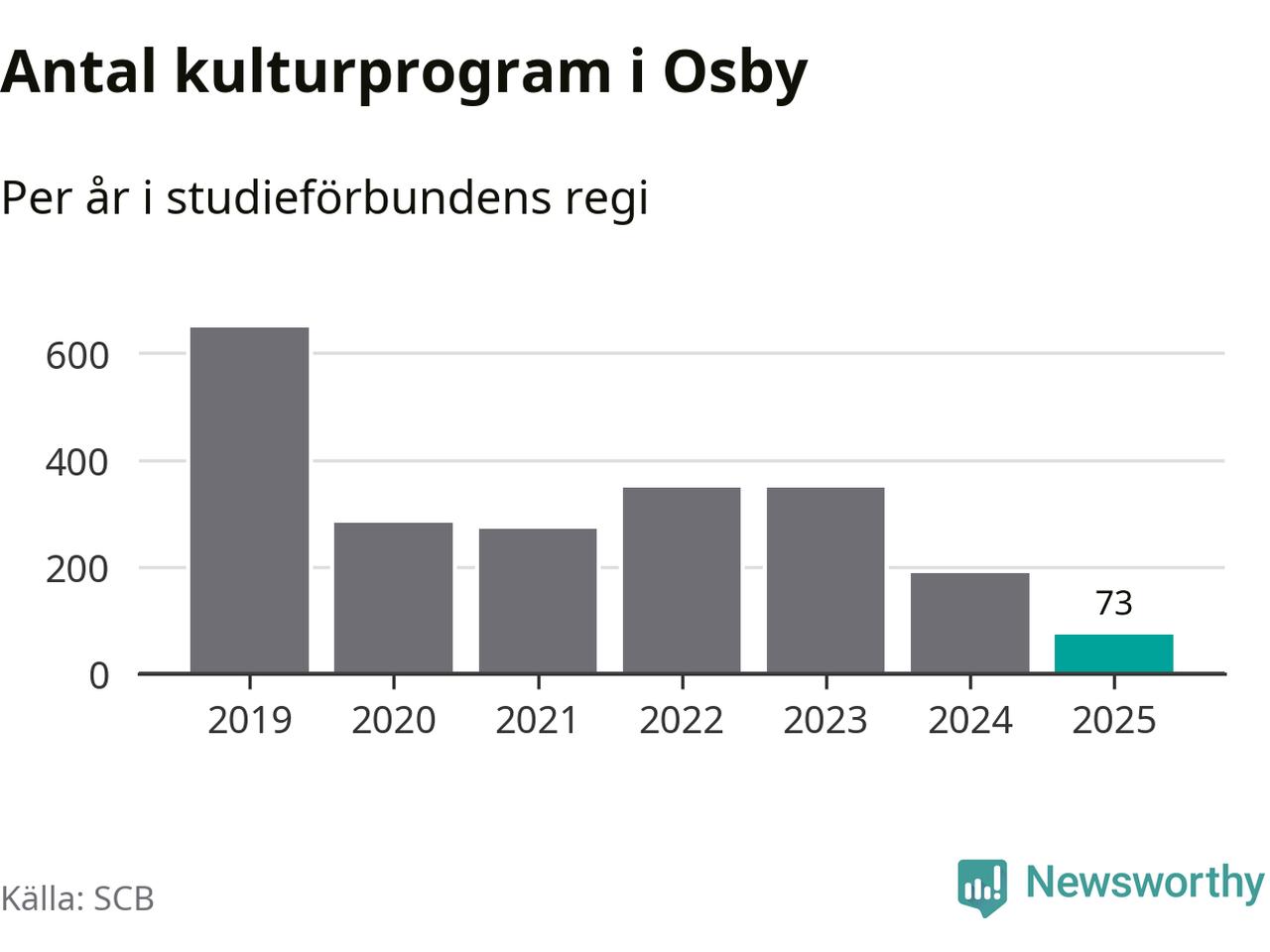 I Osby är minskningen ännu större: förra året hade studieförbunden omkring 2 600 studietimmar i kommunen, vilket är en minskning med 15 procent jämfört med året innan. Även antalet kulturprogram i studieförbundens regi minskade, från 189 till 73 stycken.