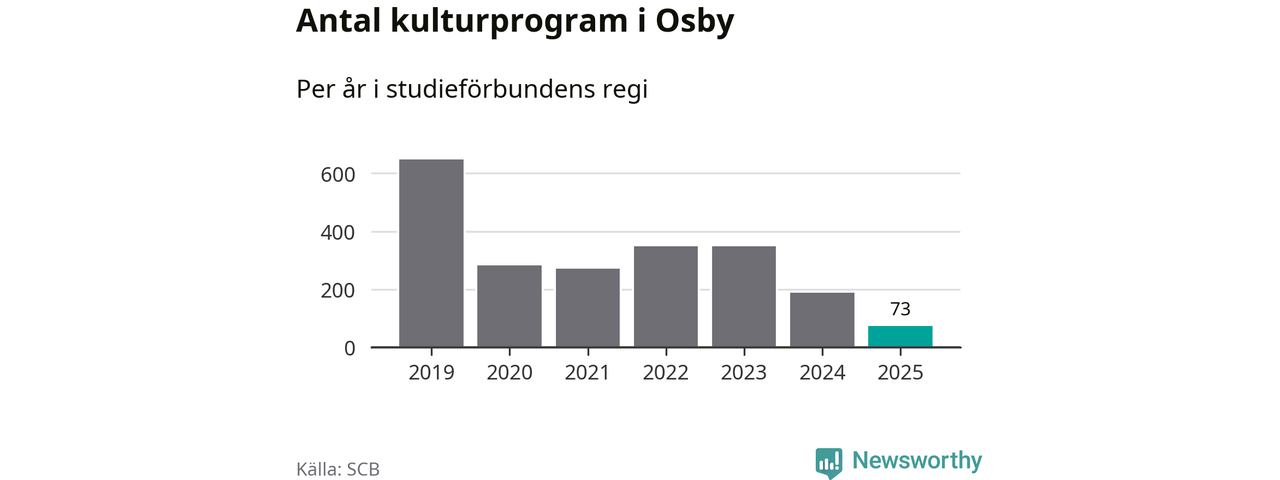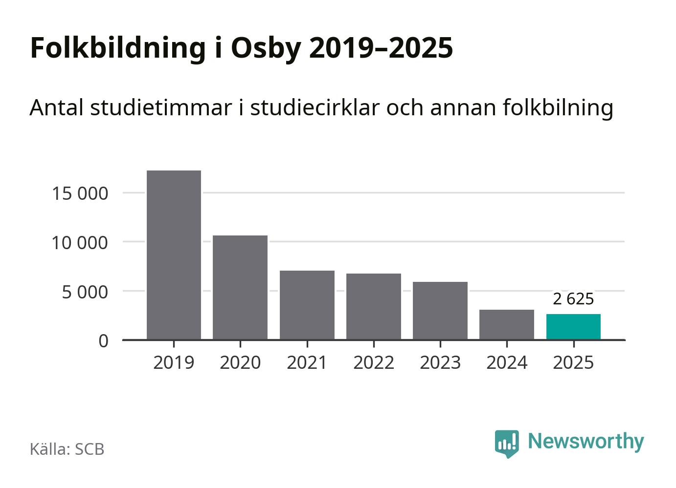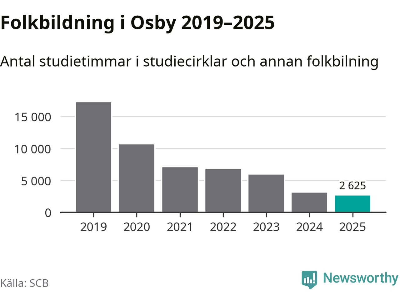 Sju av de studieförbund som 2025 fick bidrag från Folkbildningsrådet har haft någon form av verksamhet – antingen studiecirkel, annan folkbildning eller kulturprogram – i Osby under de två senaste åren. Under 2025 ökade Medborgarskolan och Studieförbundet Vuxenskolan antalet studietimmar i kommunen jämfört med året innan, medan fyra andra förbund i kommunen noterade färre timmar. Folkuniversitetet, som under 2024 ordnade tolv kulturprogram hade upphört med sin verksamhet i kommunen under 2025.