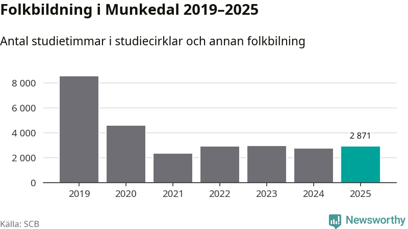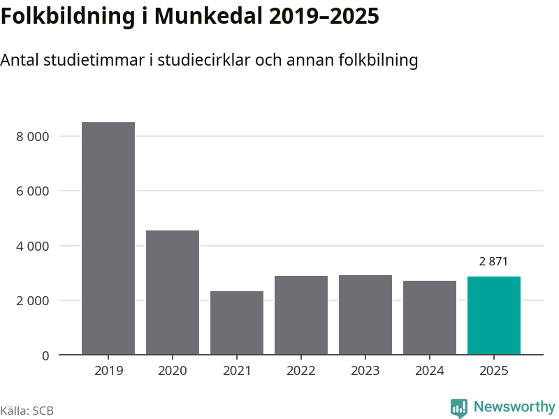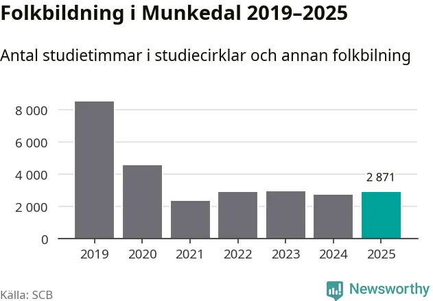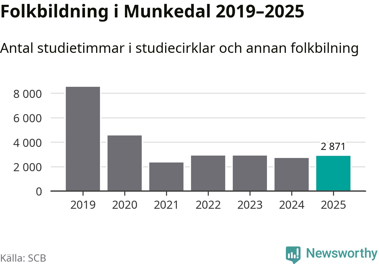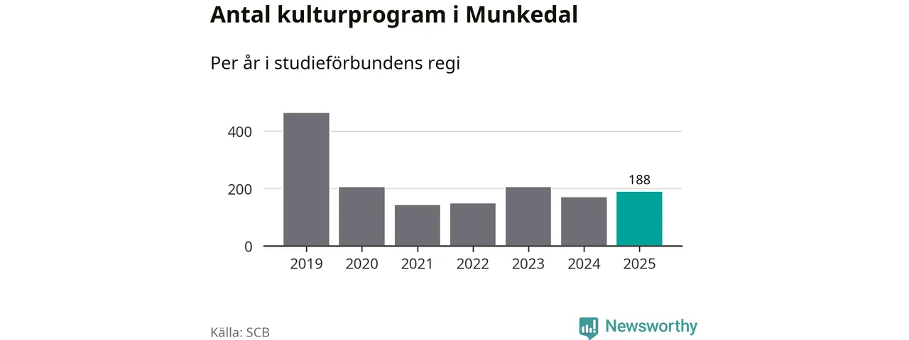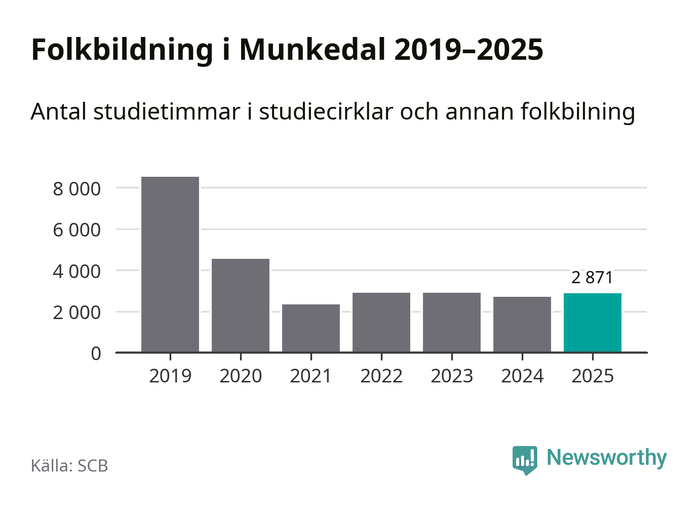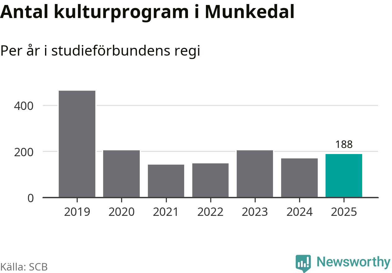 Sju av de studieförbund som 2025 fick bidrag från Folkbildningsrådet har haft någon form av verksamhet – antingen studiecirkel, annan folkbildning eller kulturprogram – i Munkedal under de två senaste åren. Under 2025 ökade Sensus och Studieförbundet Vuxenskolan antalet studietimmar i kommunen jämfört med året innan, medan tre andra förbund i kommunen noterade färre timmar. Folkuniversitetet har bara arrangerat kulturprogram under 2025. Bilda och Medborgarskolan hade ingen verksamhet i kommunen förra året.
