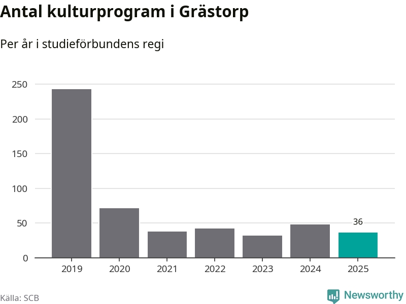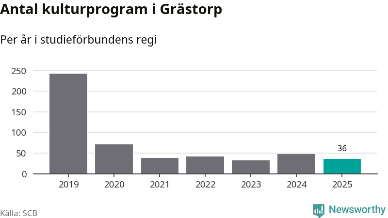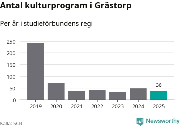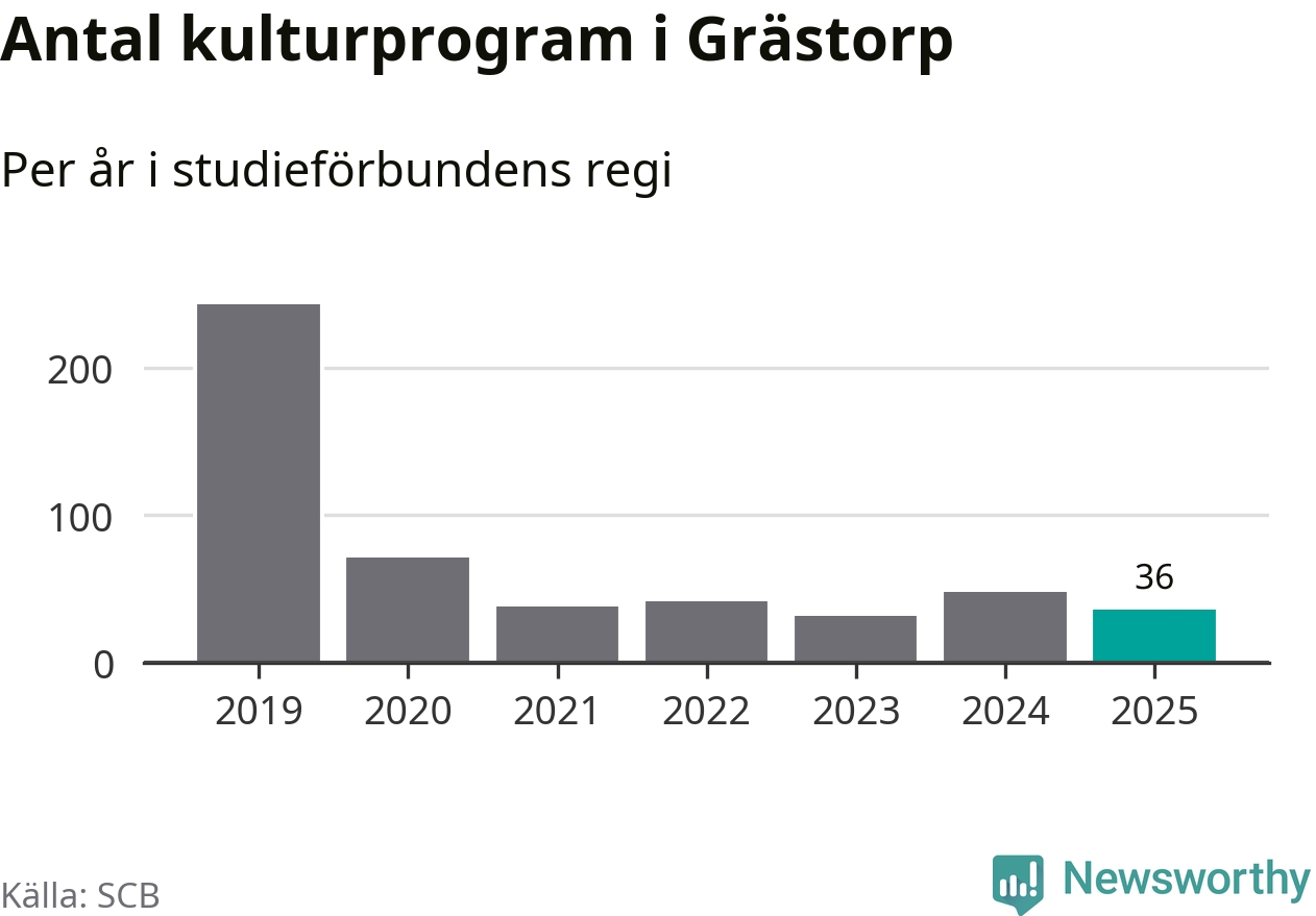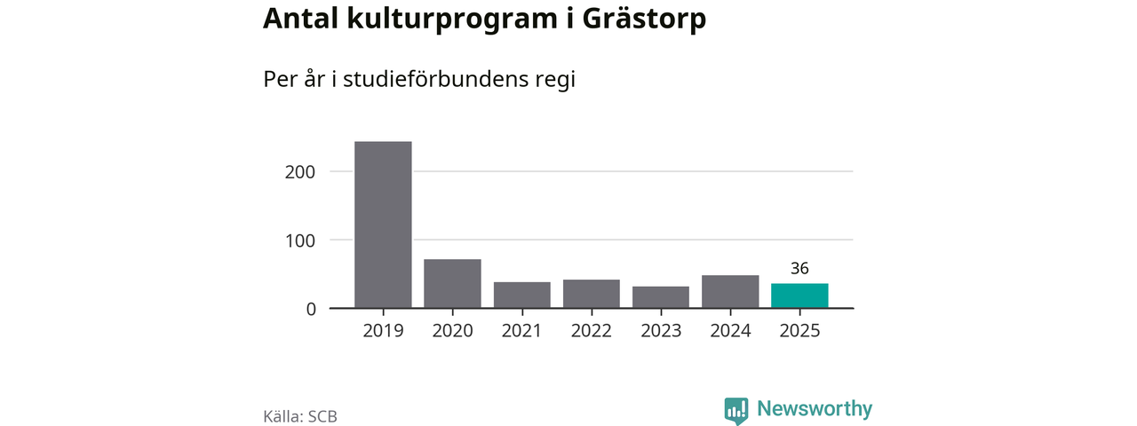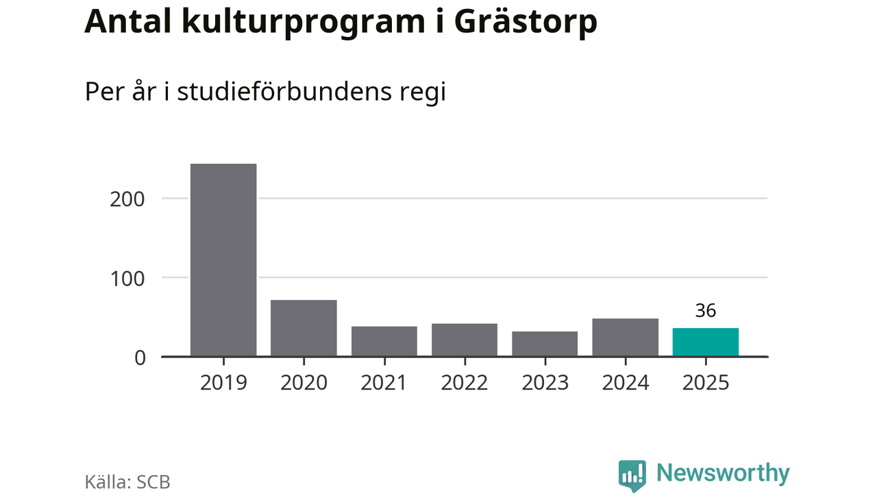I Grästorp är minskningen ännu större: förra året hade studieförbunden omkring 1 500 studietimmar i kommunen, vilket är en minskning med 13 procent jämfört med året innan. Även antalet kulturprogram i studieförbundens regi minskade, från 48 till 36 stycken.