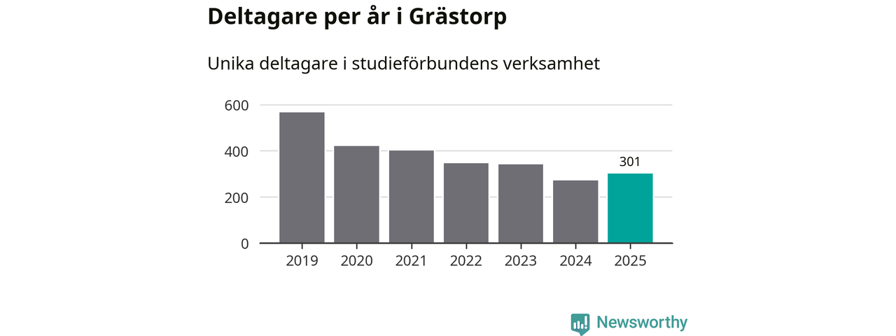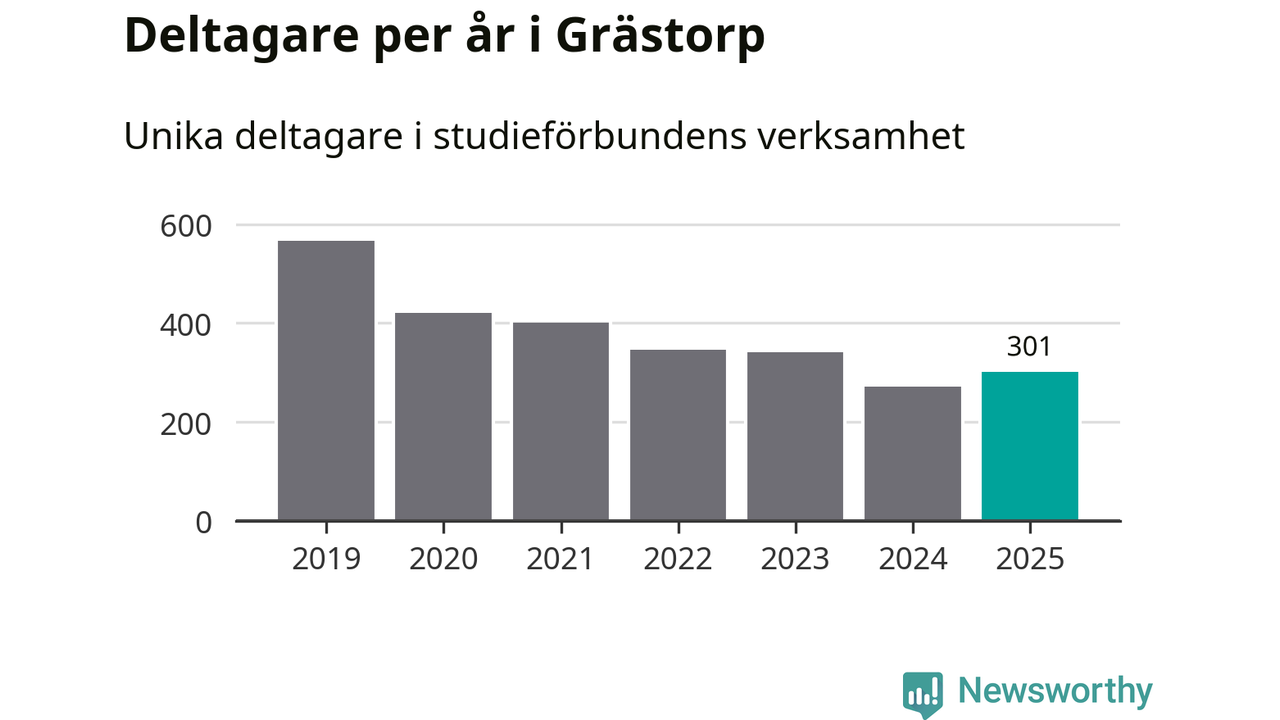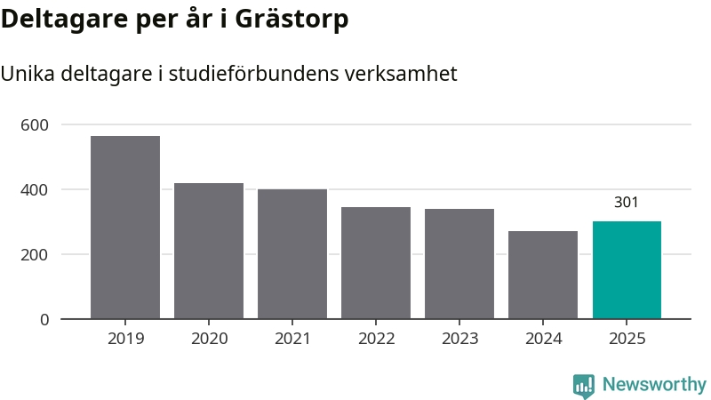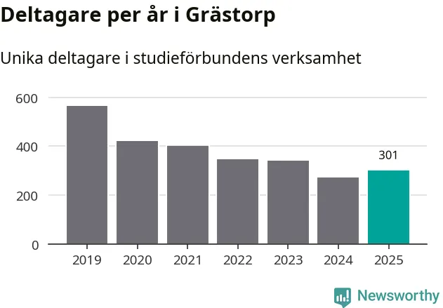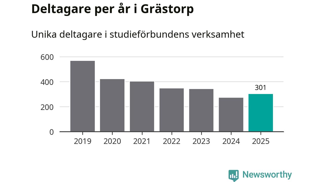 Antalet unika deltagare ökade i Grästorp i fjol: från 271 till 301 personer. Det innebär att fem procent av befolkningen i kommunen deltog i studieförbundens verksamhet under 2025, vilket är ungefär som rikssnittet.