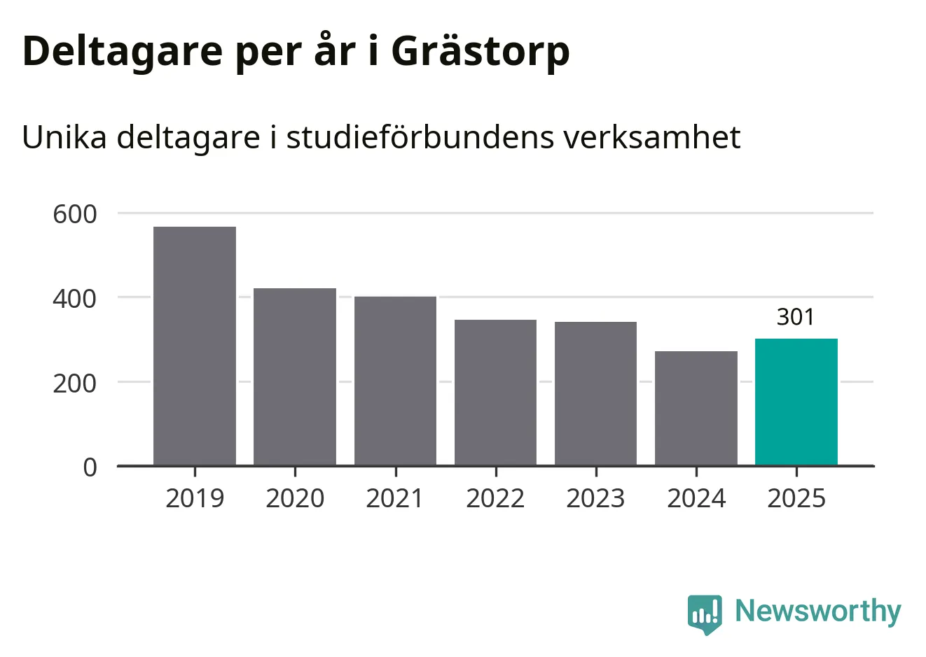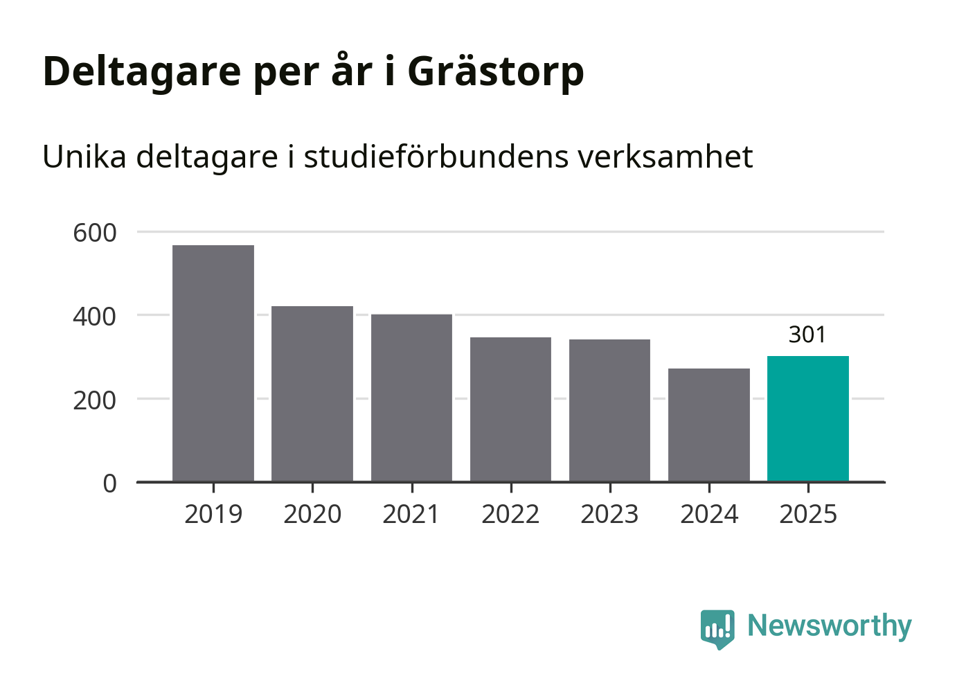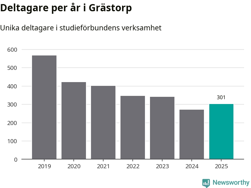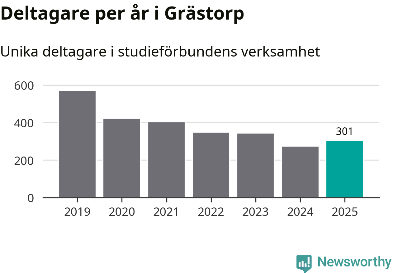 Antalet unika deltagare ökade i Grästorp i fjol: från 271 till 301 personer. Det innebär att fem procent av befolkningen i kommunen deltog i studieförbundens verksamhet under 2025, vilket är ungefär som rikssnittet.