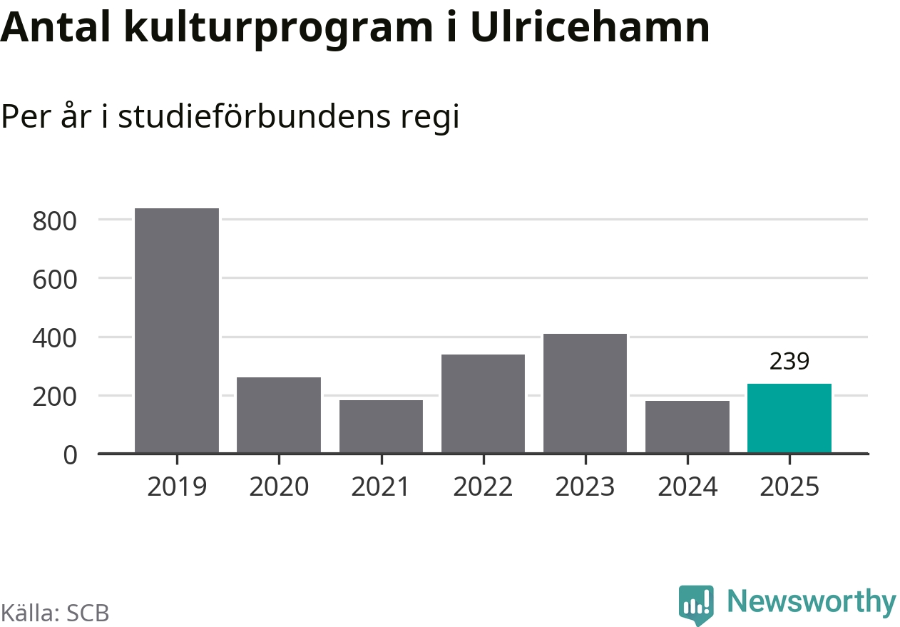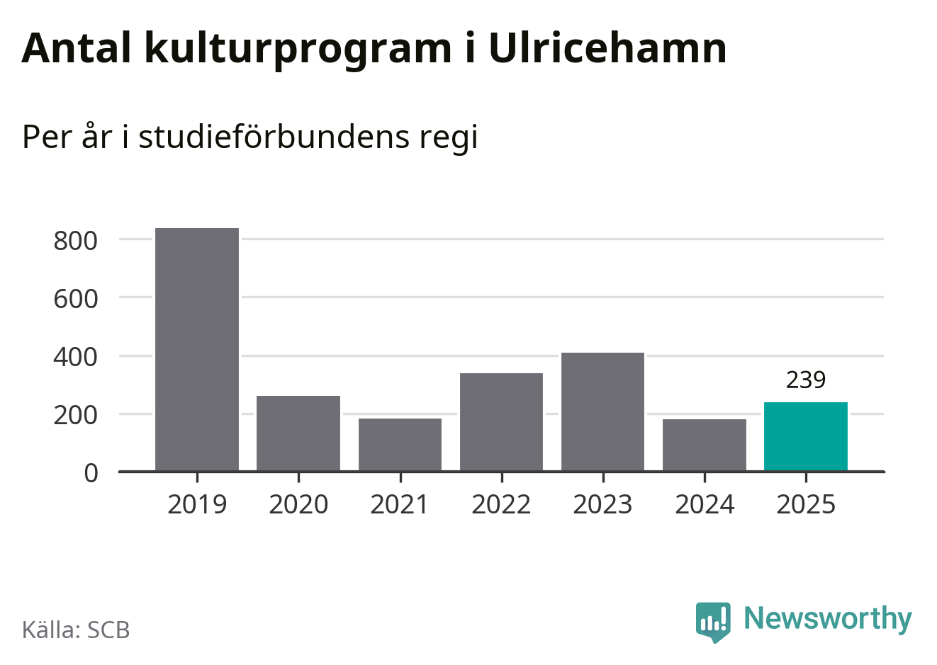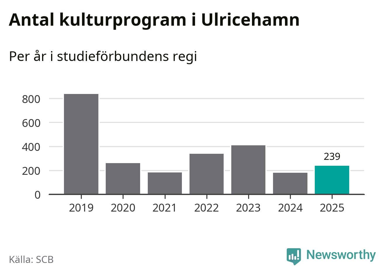 Åtta av de studieförbund som 2025 fick bidrag från Folkbildningsrådet har haft någon form av verksamhet – antingen studiecirkel, annan folkbildning eller kulturprogram – i Ulricehamn under de två senaste åren. Under 2025 ökade Studiefrämjandet antalet studietimmar i kommunen jämfört med året innan, medan sex andra förbund i kommunen noterade färre timmar. Folkuniversitetet har bara arrangerat kulturprogram under 2025.
