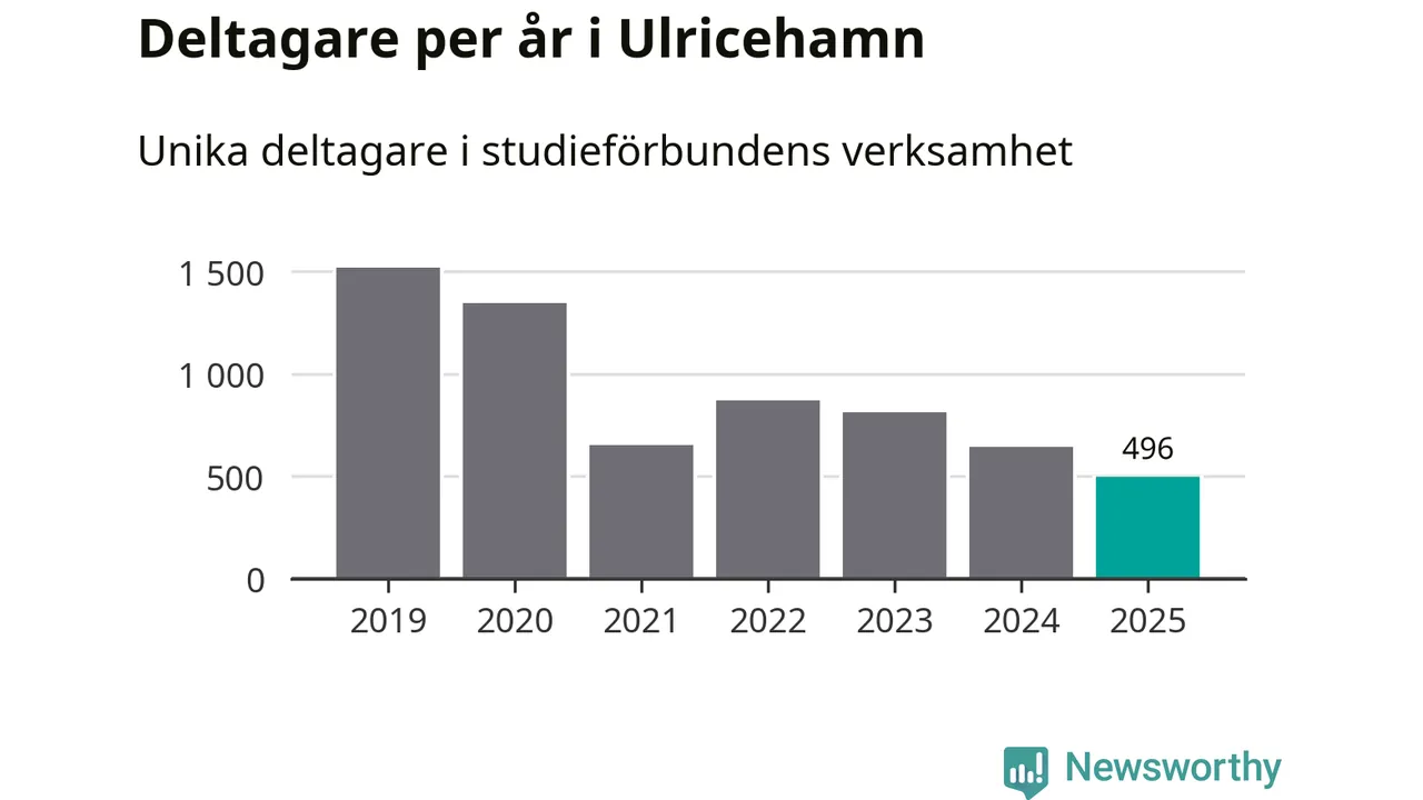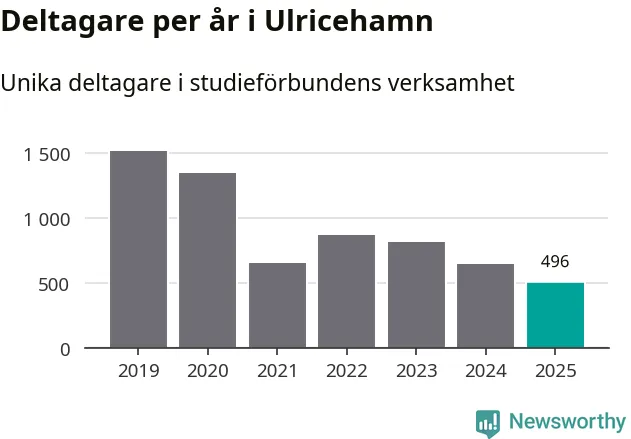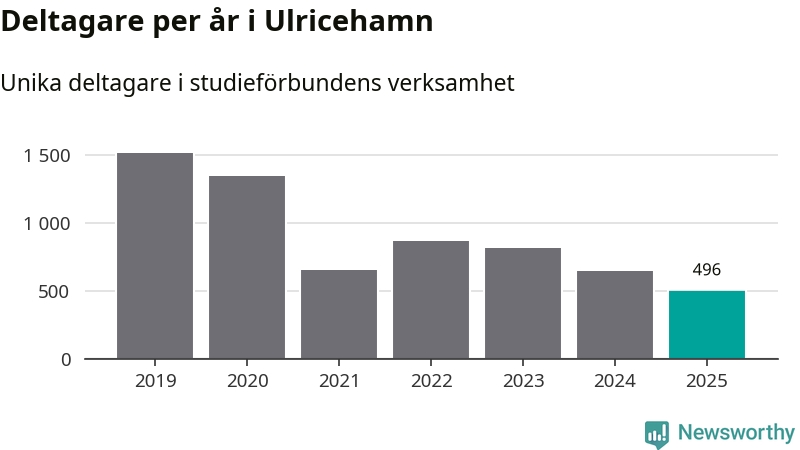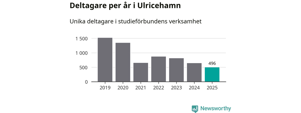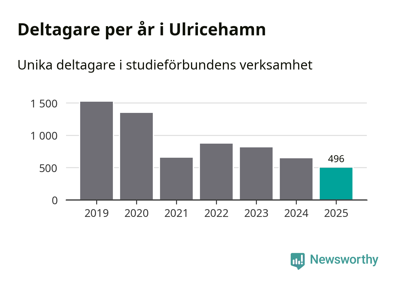 Även sett till unika deltagare är folkbildningen på tillbakagång i Ulricehamn. 2025 deltog 496 personer i studieförbundens verksamhet, vilket är en minskning med 23 procent jämfört med året innan. Det innebär att två procent av befolkningen i kommunen deltog i studieförbundens verksamhet under 2025. Det är den näst lägsta andelen i Västra Götaland.