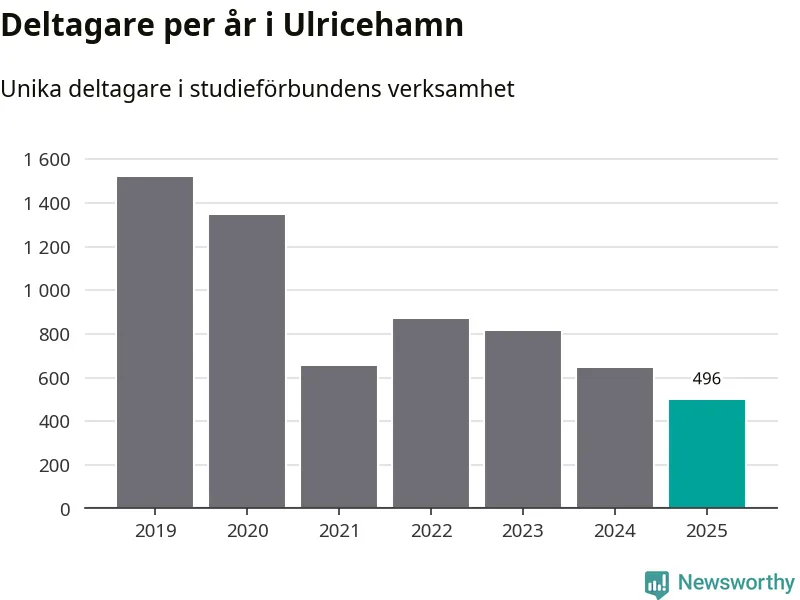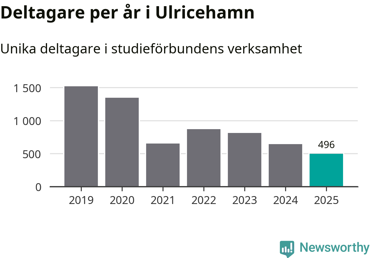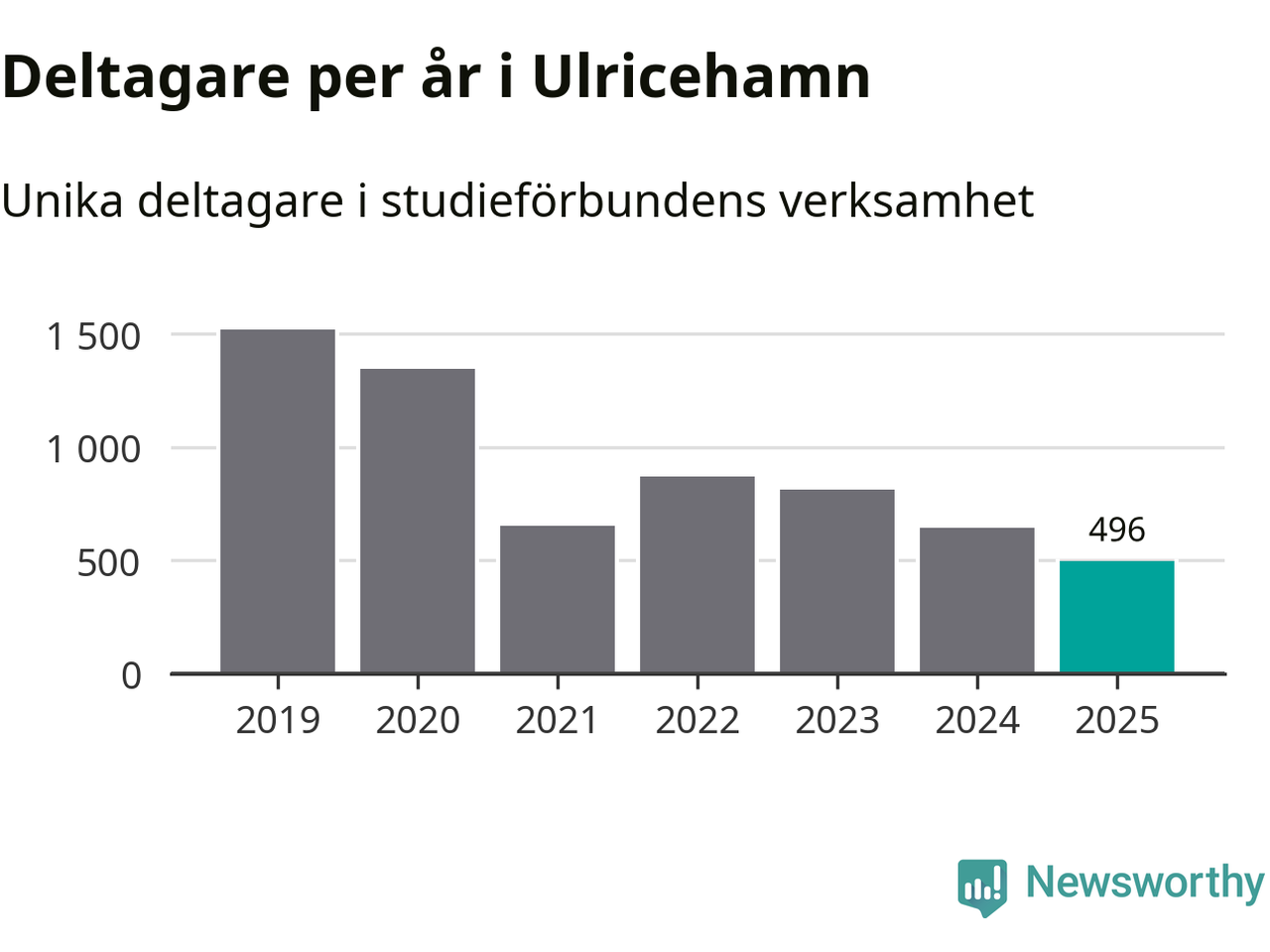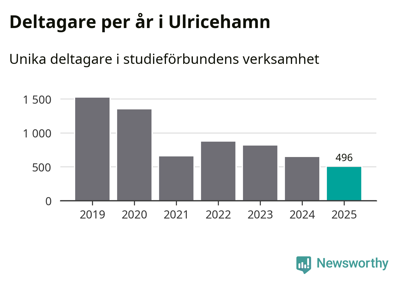 Även sett till unika deltagare är folkbildningen på tillbakagång i Ulricehamn. 2025 deltog 496 personer i studieförbundens verksamhet, vilket är en minskning med 23 procent jämfört med året innan. Det innebär att två procent av befolkningen i kommunen deltog i studieförbundens verksamhet under 2025. Det är den näst lägsta andelen i Västra Götaland.
